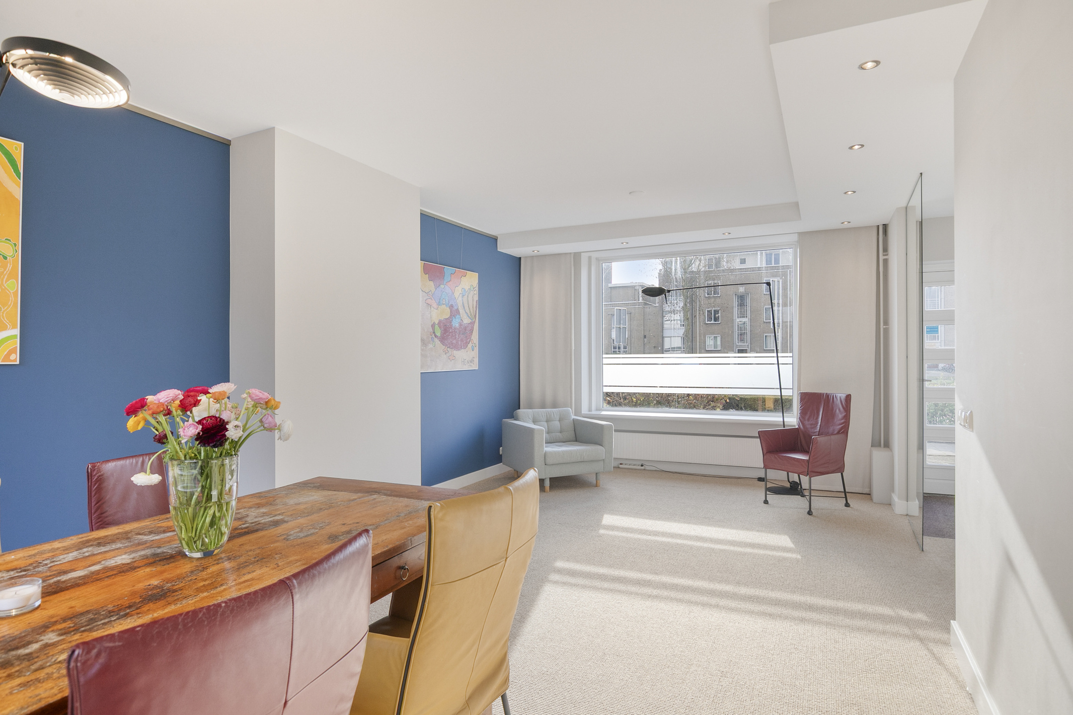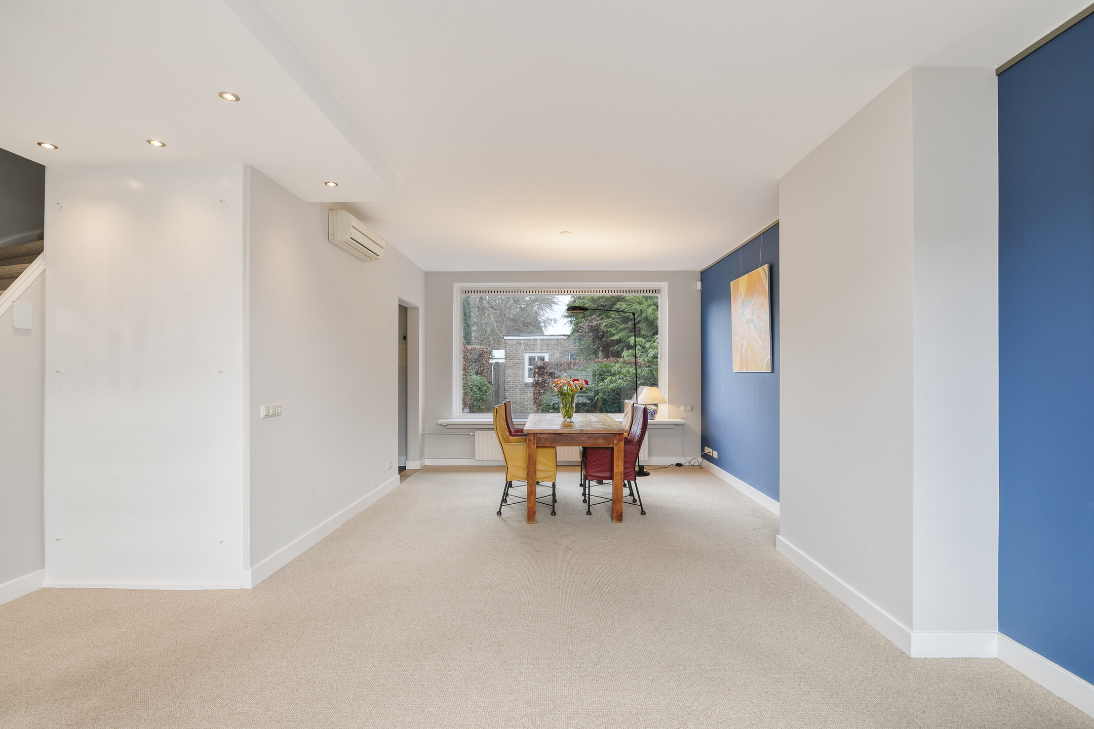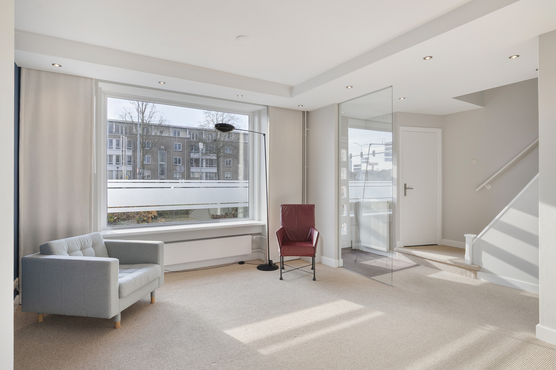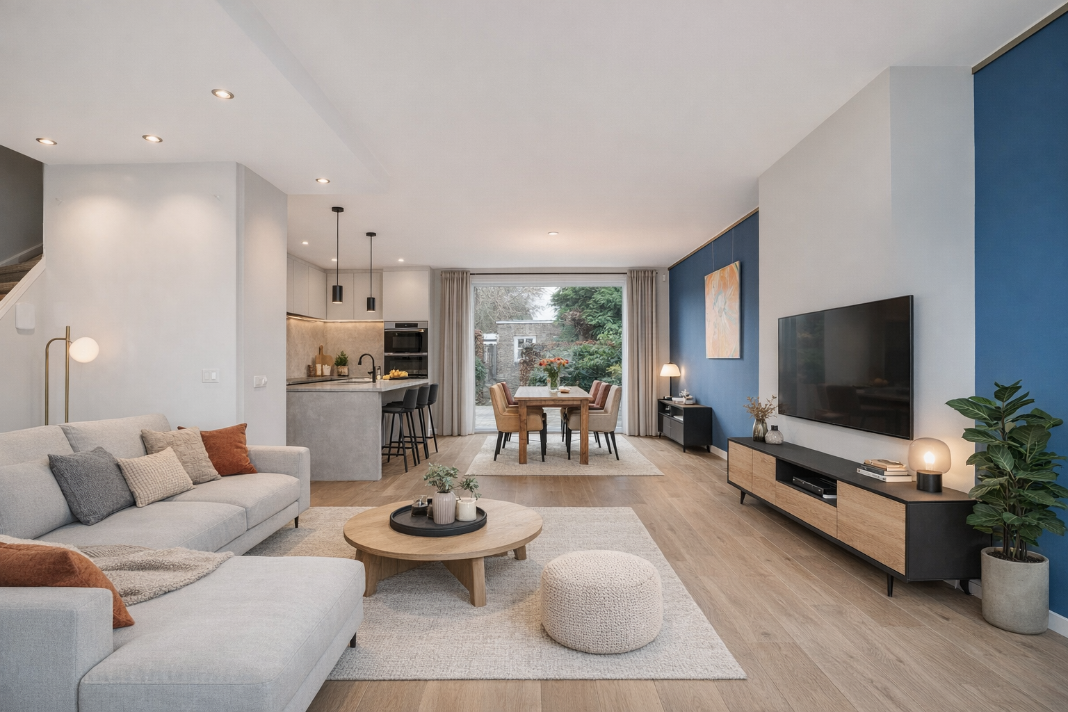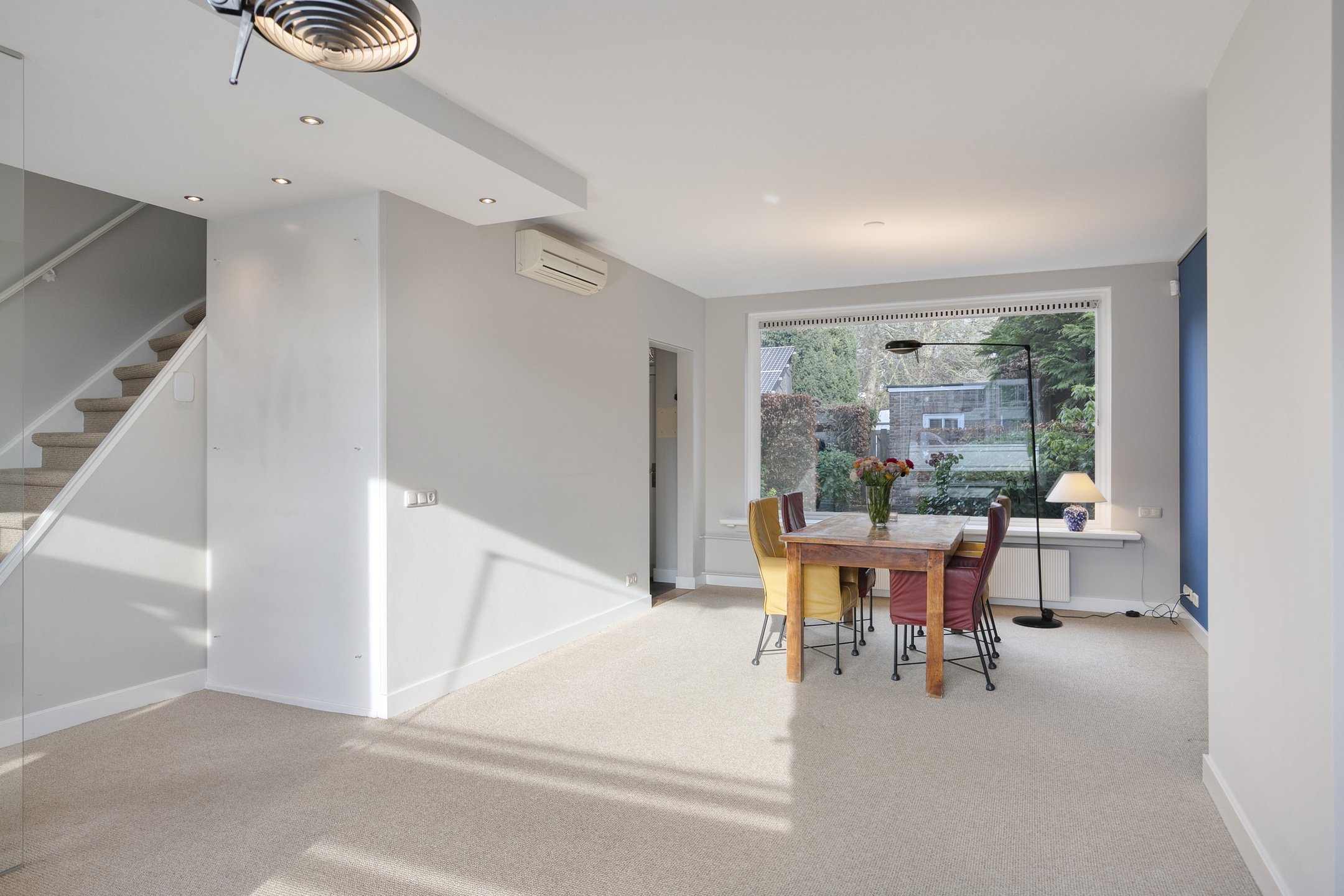 De woonkamer is strak gestuct en aan de voorzijde voorzien van inbouwspots. Op de vloer ligt dezelfde bekleding als op de trap, wat zorgt voor eenheid. Dankzij ramen aan de voor- en achterzijde is de lichtinval erg prettig. Er is een Inverter airco geplaatst, zodat je de temperatuur zelf goed kunt regelen. Aan de voorzijde is een zonnescherm aanwezig, handig om het zonlicht te doseren.