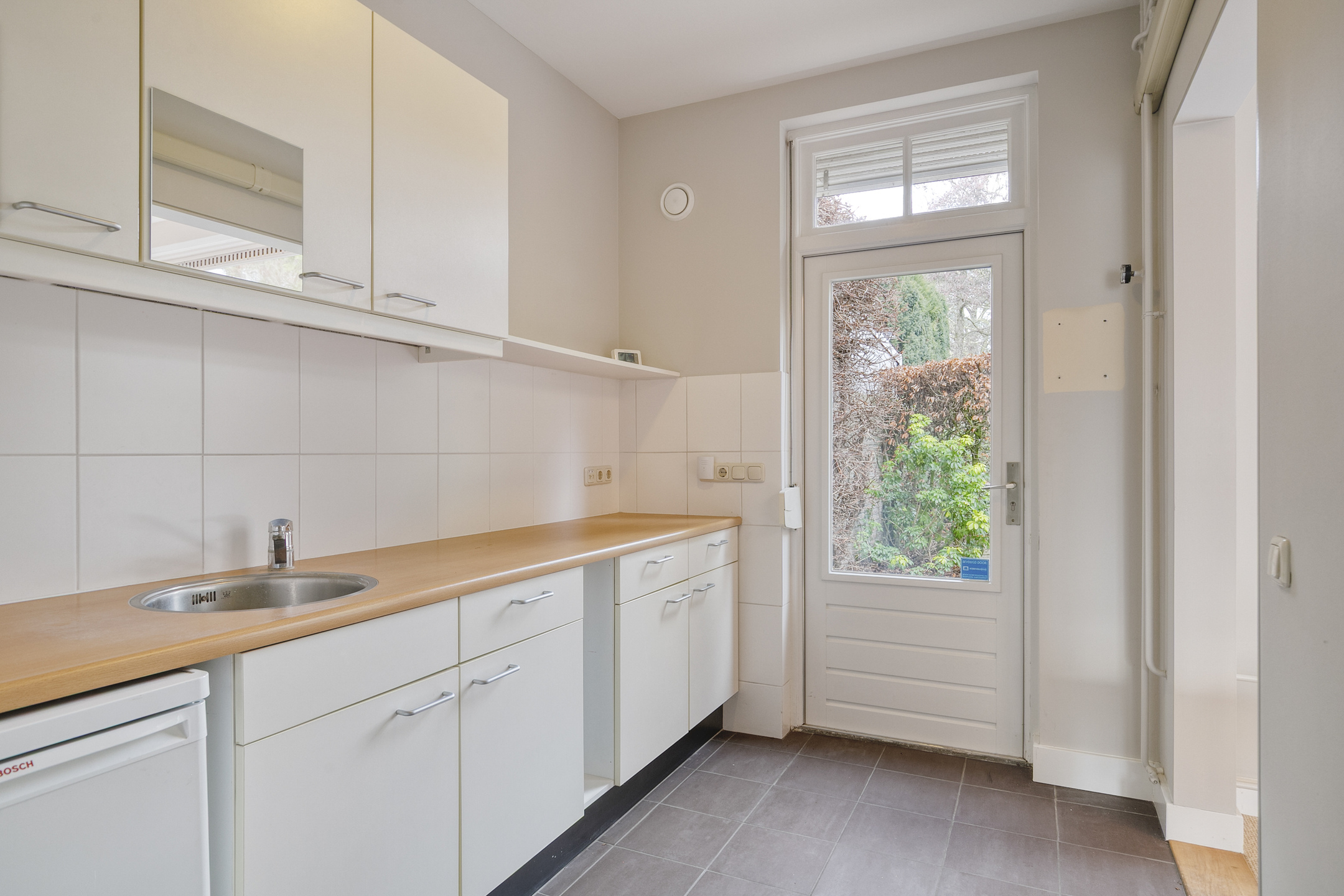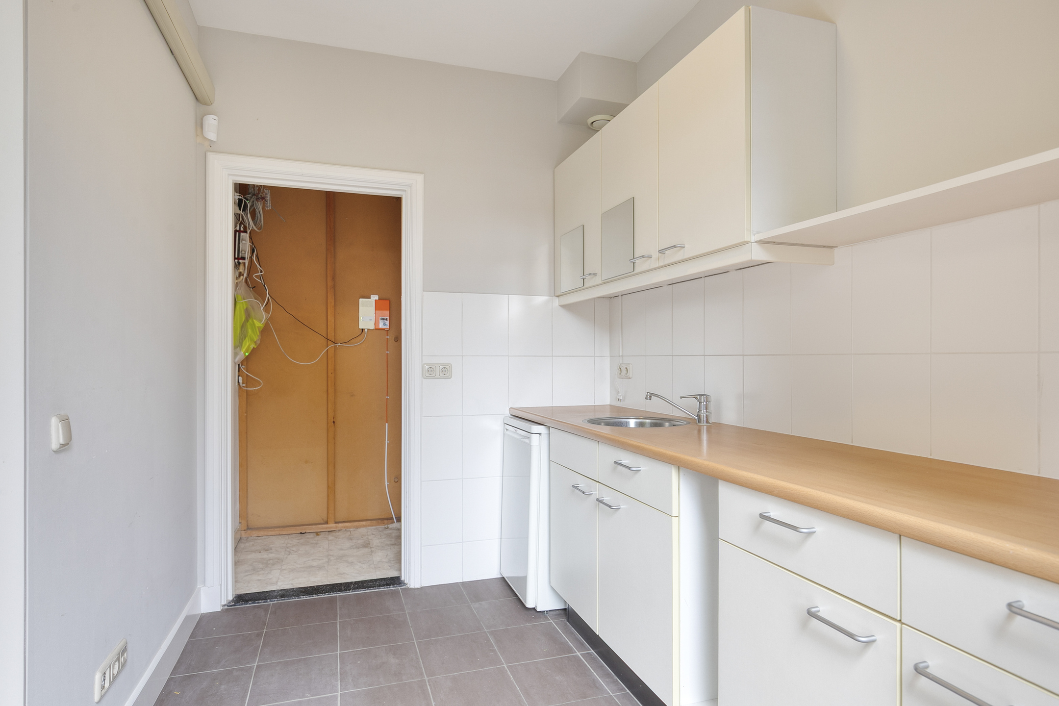 De keuken is praktisch ingericht met een keukenblok met witte fronten, een spoelbak en een kleine koelkast. Er zijn bovenkastjes voor extra bergruimte. Op de vloer liggen tegels. Via de loopdeur heb je direct toegang tot de achtertuin. Deze deur is voorzien van een rolluik.