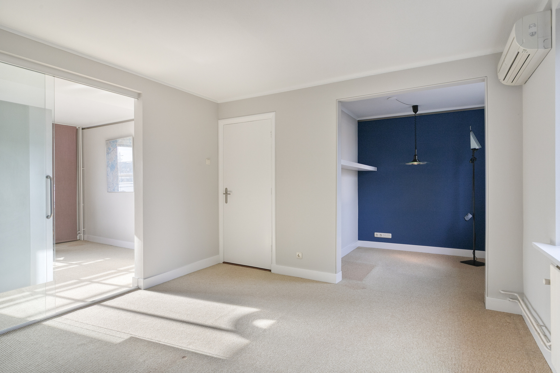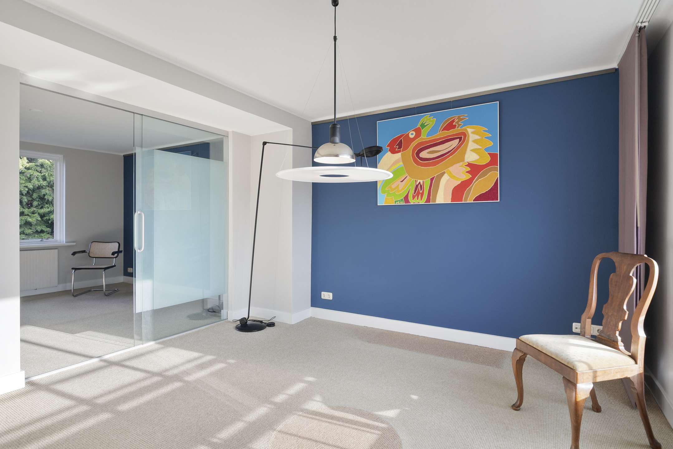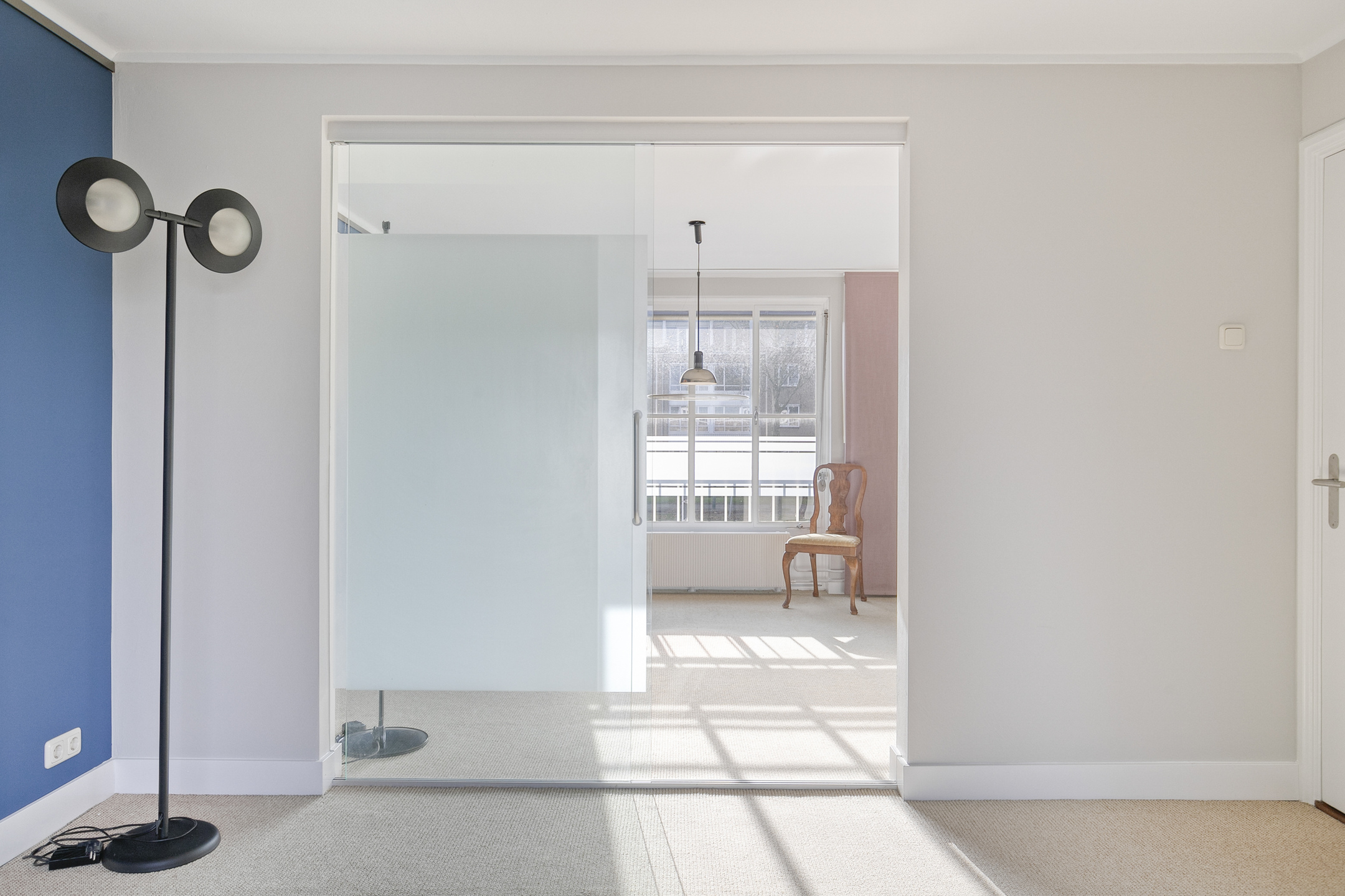 De twee ruime slaapkamers zijn momenteel met elkaar verbonden door een glazen schuifdeur. Beide kamers hebben ook een eigen toegangsdeur. Net als beneden is de lichtinval hier erg fijn. Beide kamers bieden voldoende ruimte voor een tweepersoonsbed, een kast en een bureau. Deze kamers zijn door het plaatsen van 2 muren en een extra deur op te splitsen in 3 aparte slaapkamers.