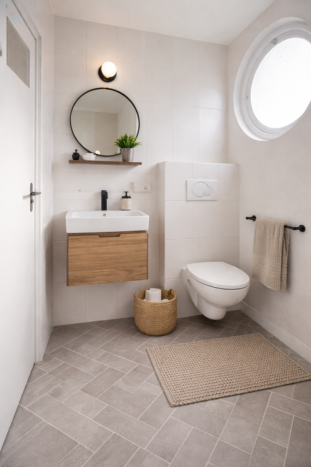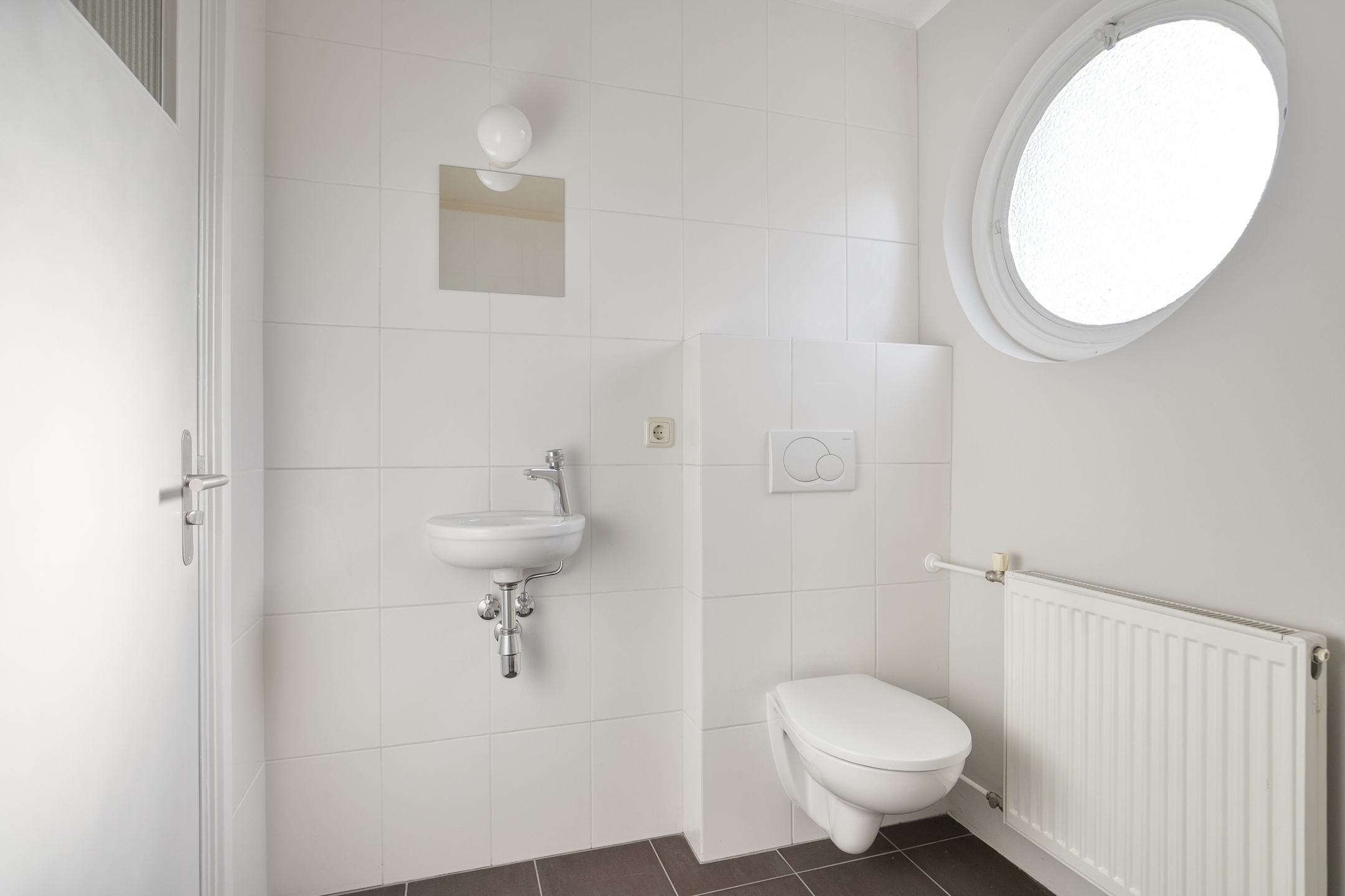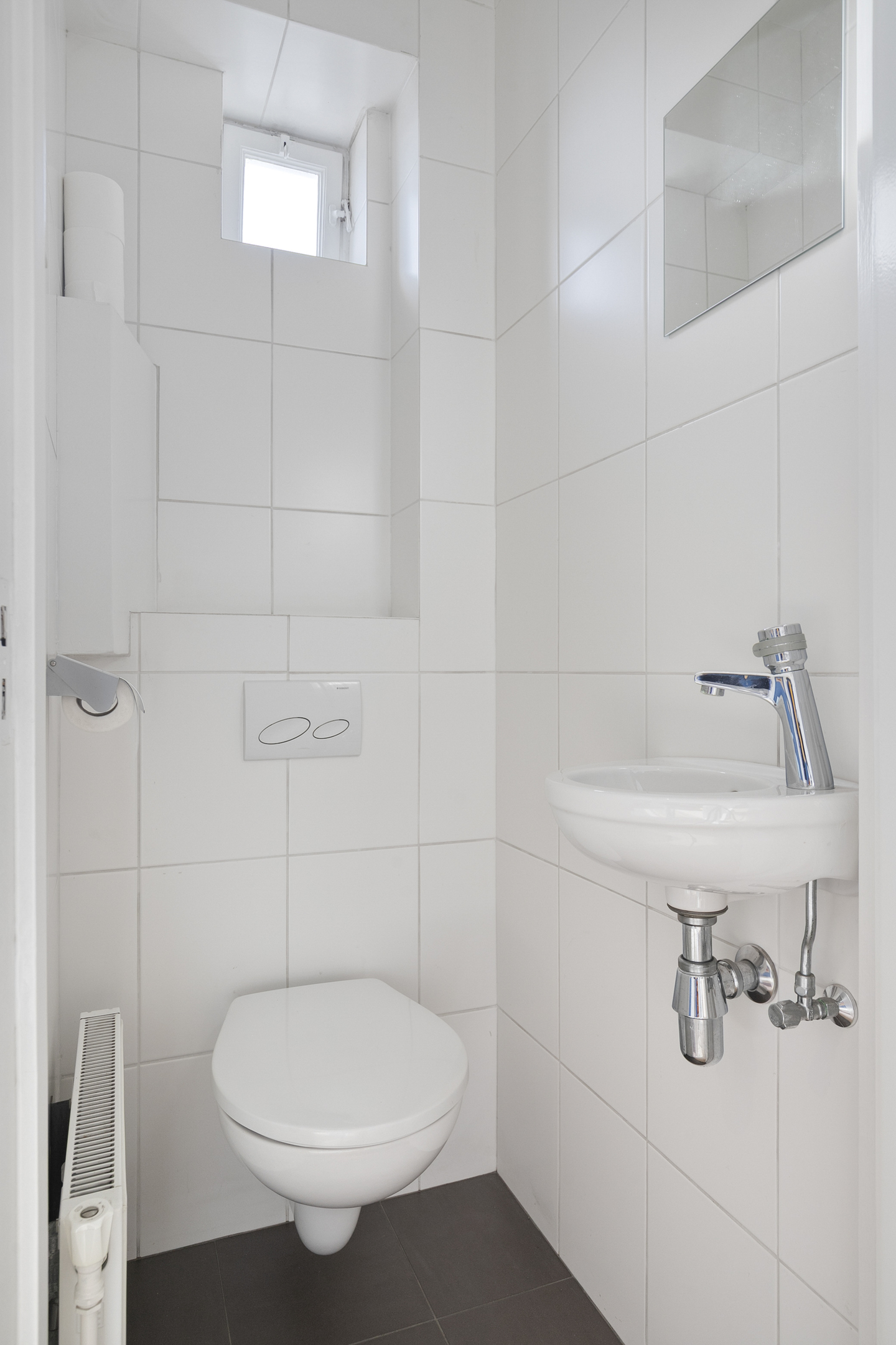 Het toilet is volledig betegeld en strak afgewerkt. Er is een inbouwcloset, een fonteintje en een radiator. Een val raam zorgt voor daglicht en ventilatie. De combinatie van witte wandtegels en een donkere vloertegel geeft een frisse uitstraling.