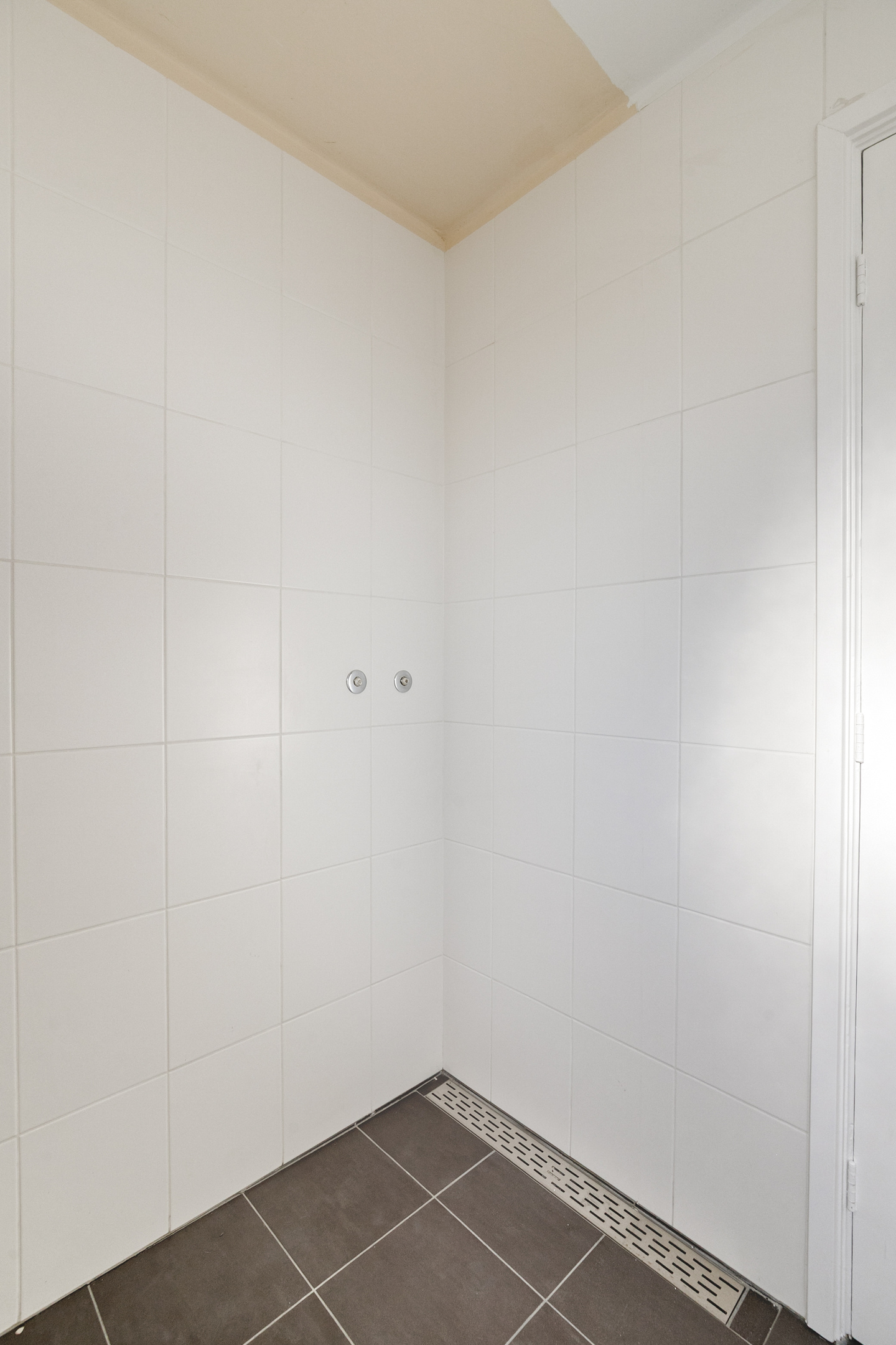 De badkamer is deels betegeld en voorzien van een wandcloset en een fonteintje. Een karakteristiek raam zorgt voor daglicht en natuurlijke ventilatie. Er is een goot geplaatst, waardoor het realiseren van een douche eenvoudig is. Op dit moment is er nog geen douche aanwezig. De radiator zorgt voor extra comfort.