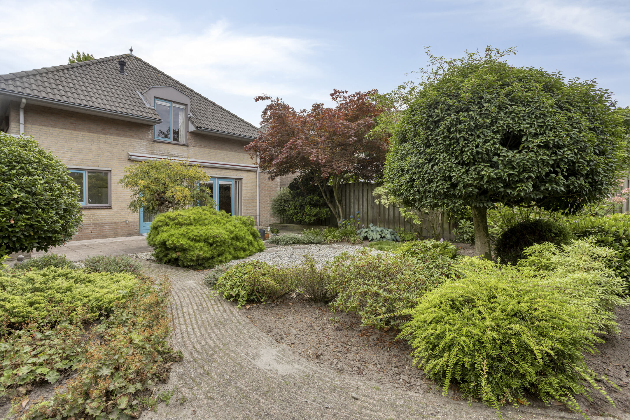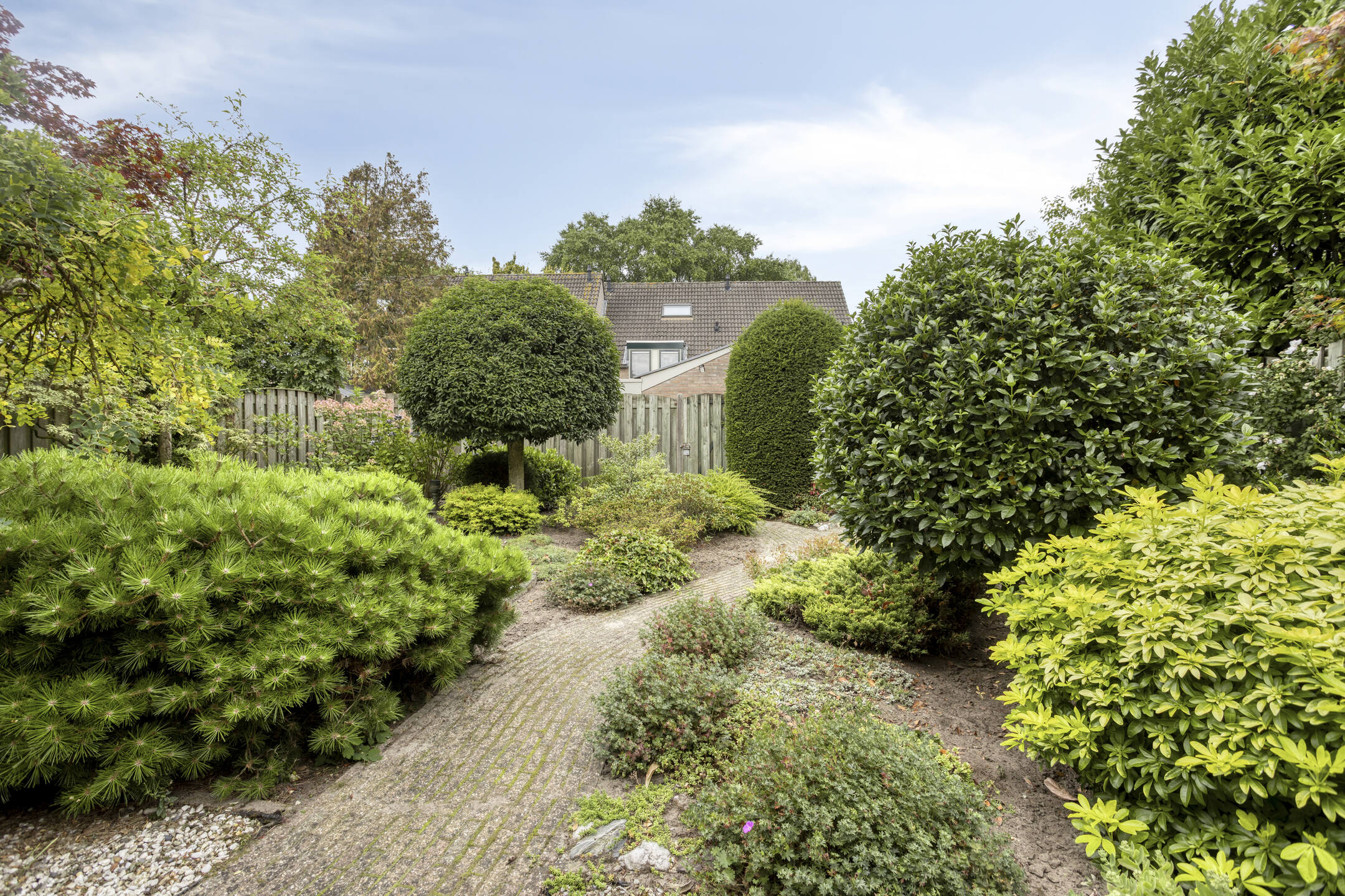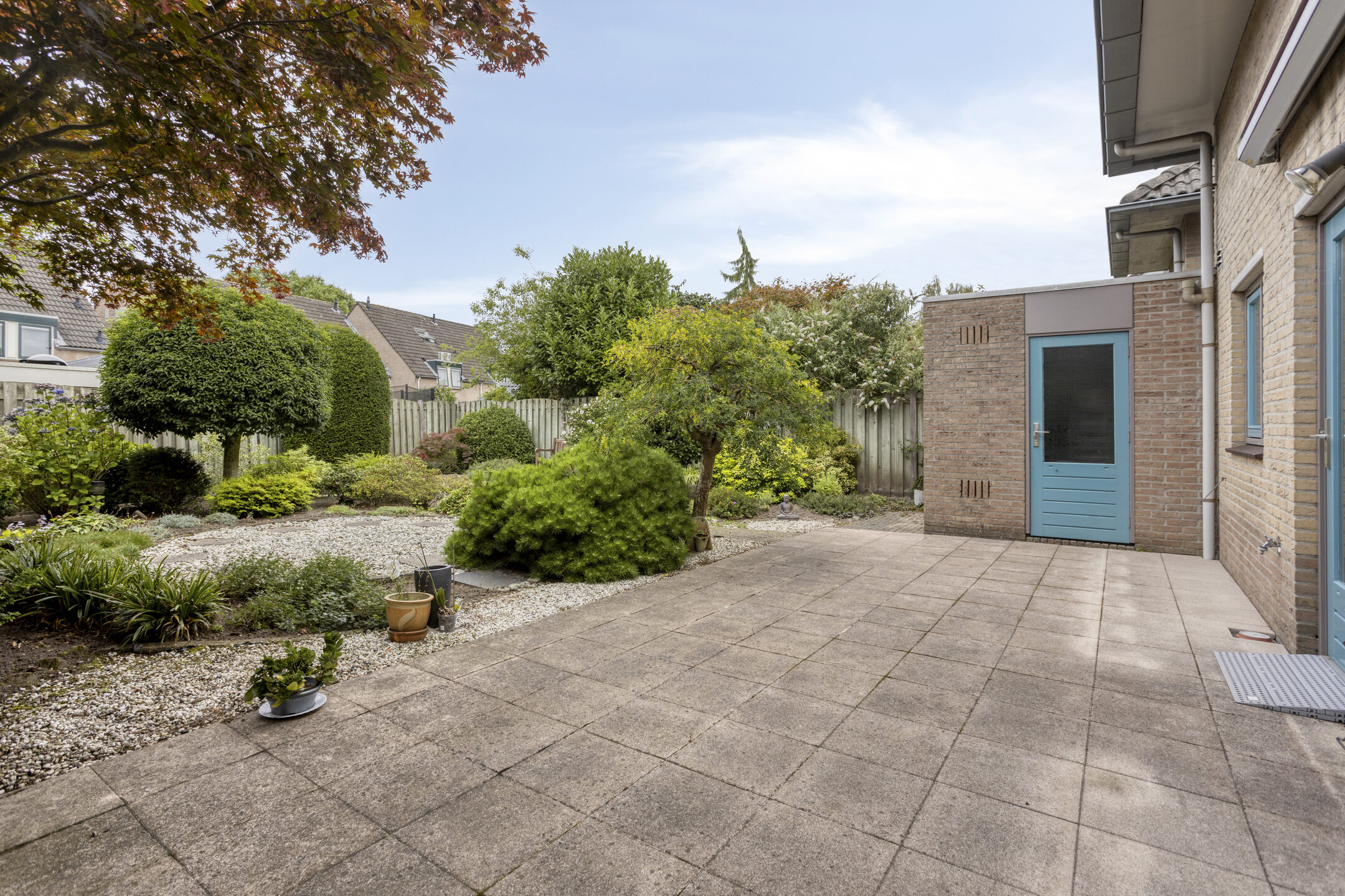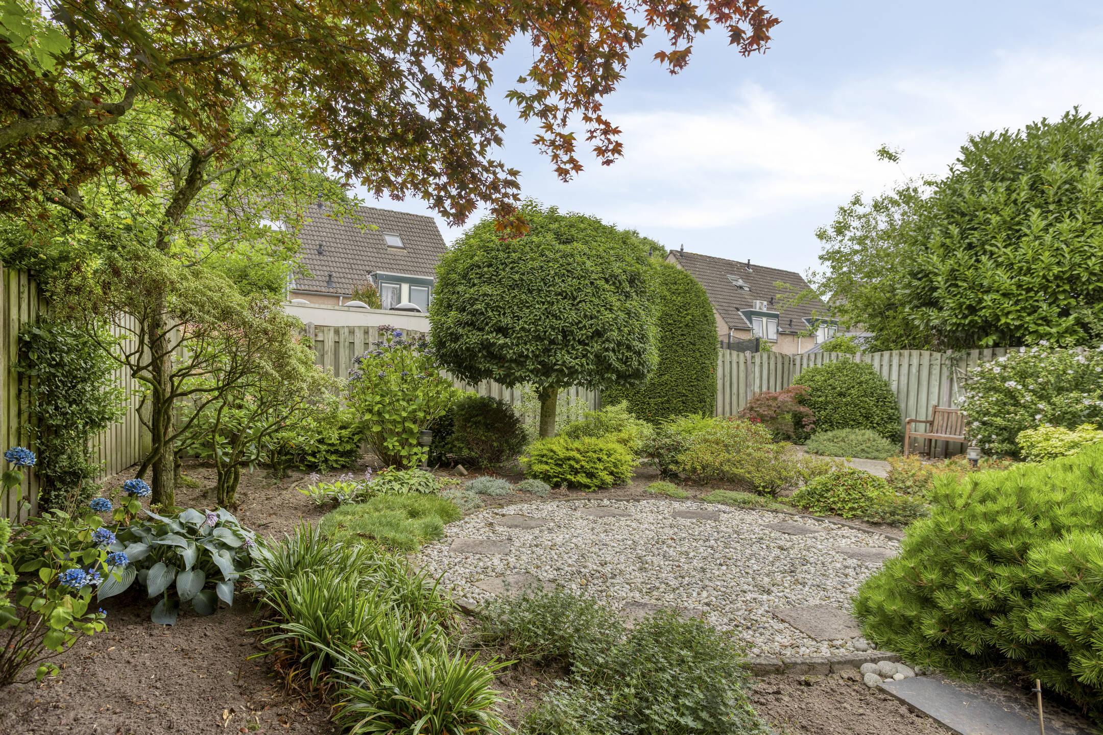 De achtertuin ligt op het westen en heeft direct bij de woning een breed, stenen terras met een zonneluifel(elektrisch bedienbaar vanuit de eetkamer). Er is een buitenkraan aanwezig en tussen de vaste beplanting loopt een stenen pad dat je naar een rustig zitje tussen het groen brengt.