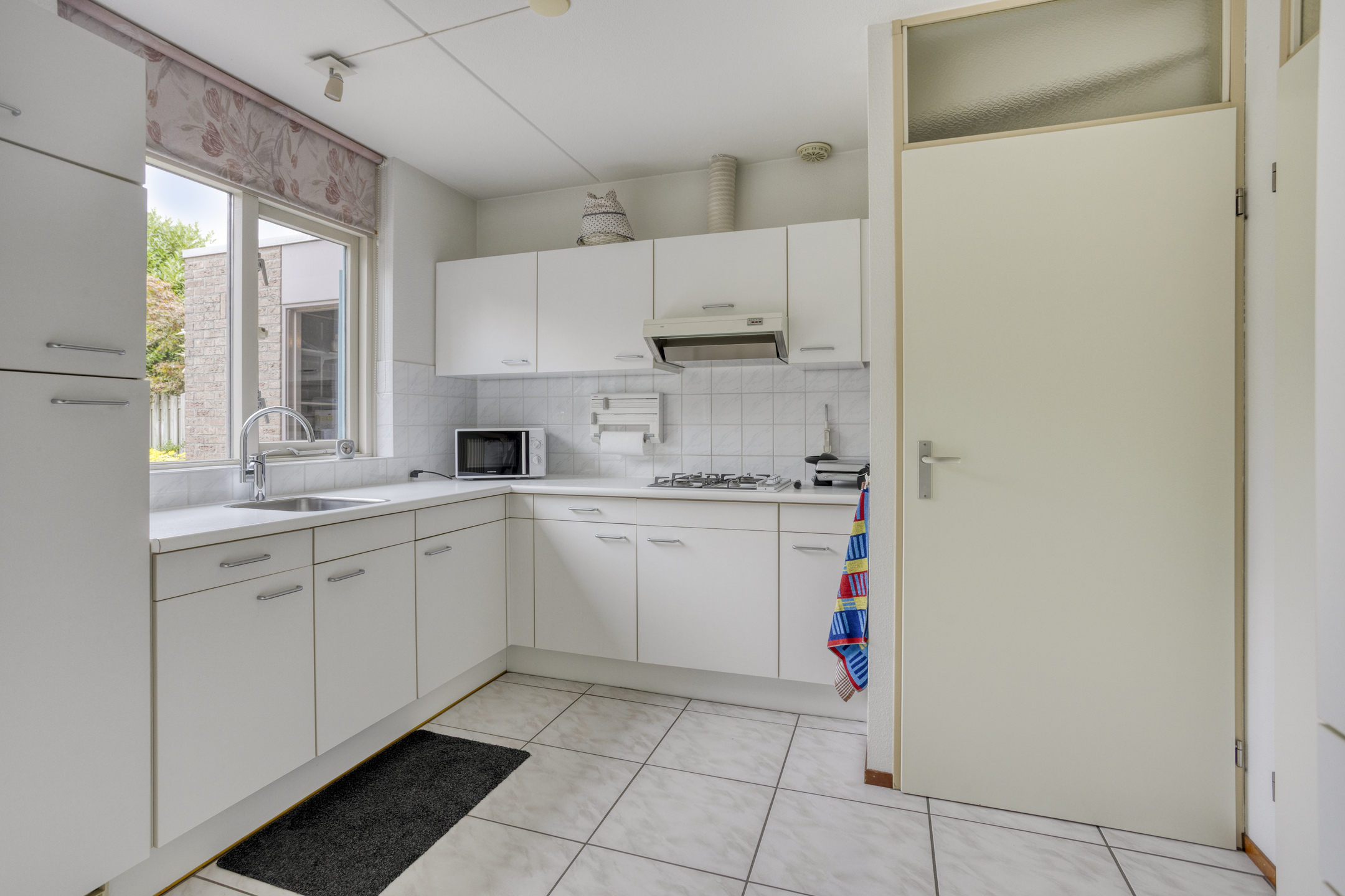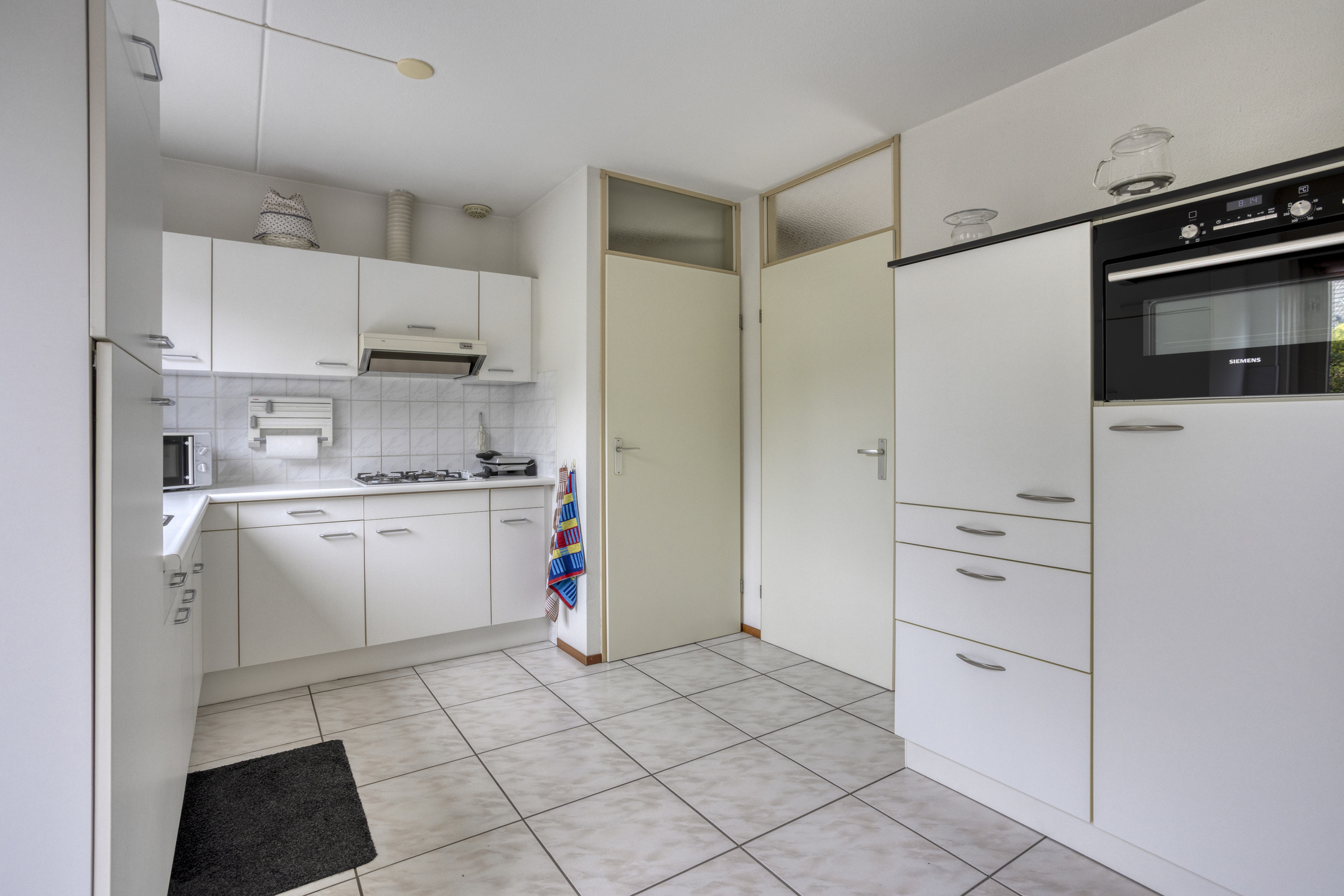 De keuken is functioneel en compleet, met veel werk- en opbergruimte. Het onderhoudsvriendelijke kunststof werkblad, de betegelde achterwand, rvs-spoelbak, gaskookplaat met afzuigkap en combi-oven maken het geheel praktisch en gebruiksvriendelijk. Voor extra bergingsruimte is er een voorraadkast onder de trap.