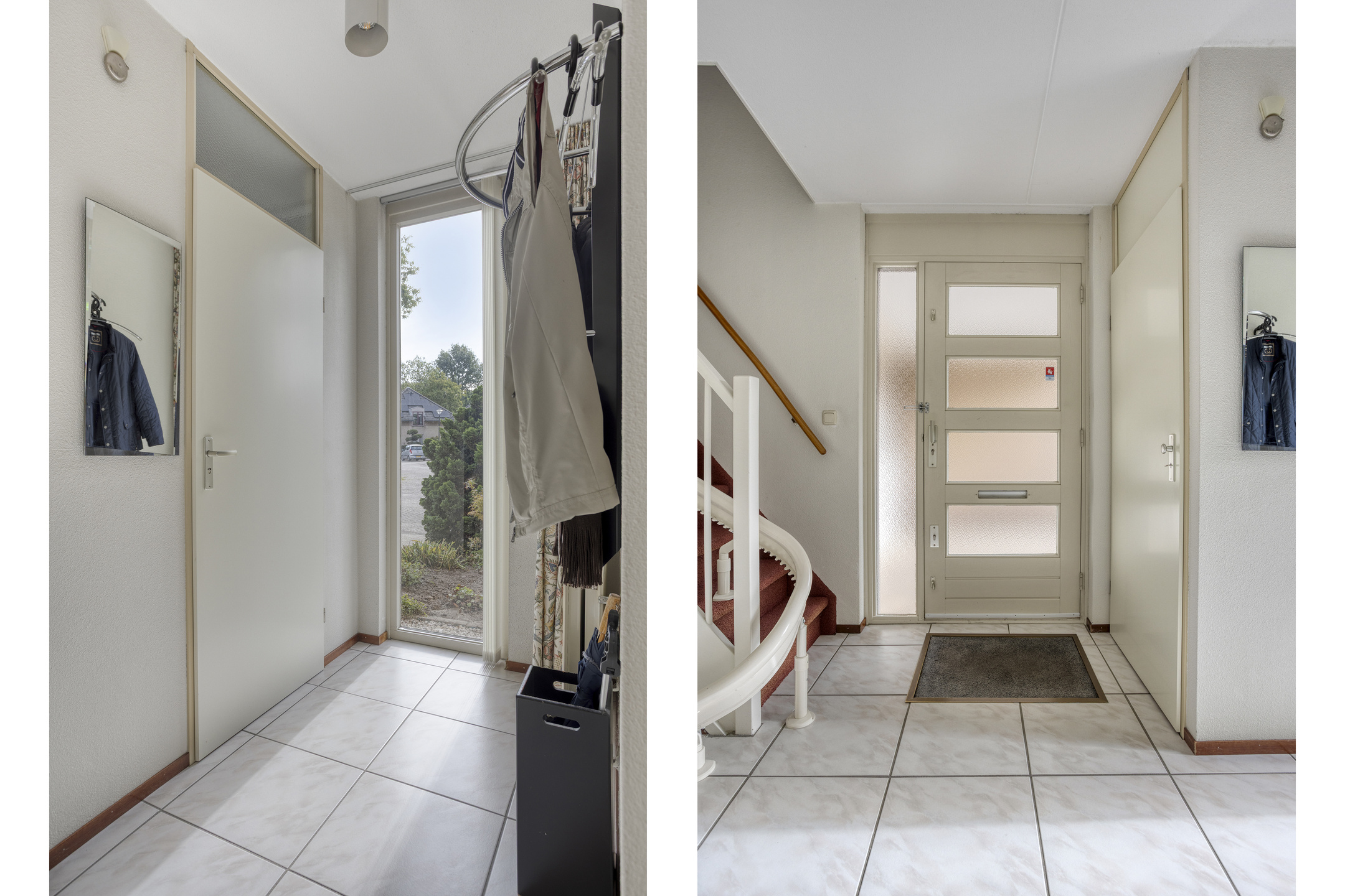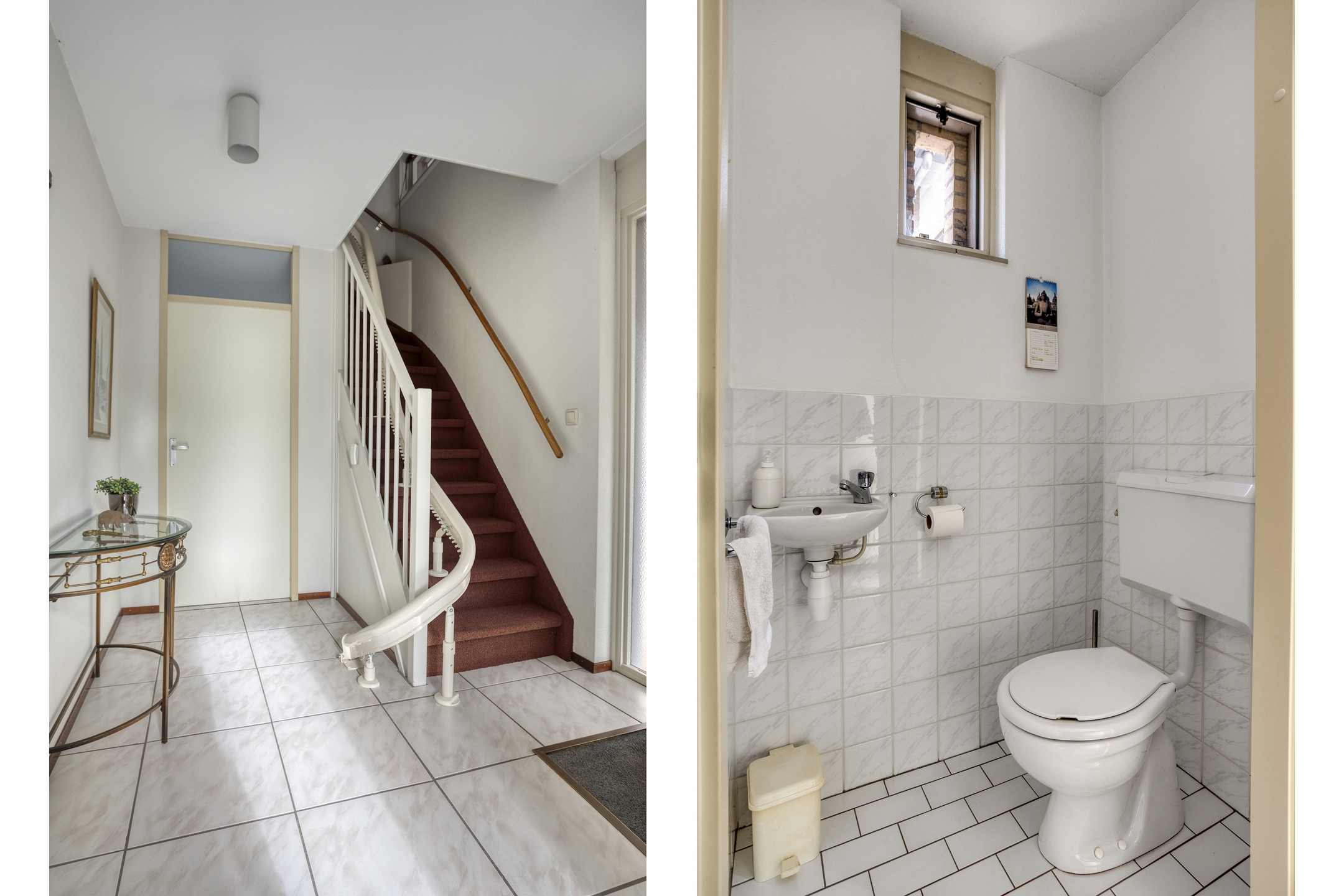 Bij binnenkomst stap je in een ruime hal die toegang biedt tot de woonkamer, keuken, meterkast, trapopgang en het toilet. De deels betegelde toiletruimte is voorzien van een toilet, een fonteintje en een raam voor natuurlijke ventilatie. De lichte tegelvloer loopt vanuit de entree stijlvol door naar de rest van de leefruimte, waardoor een harmonieus geheel ontstaat.