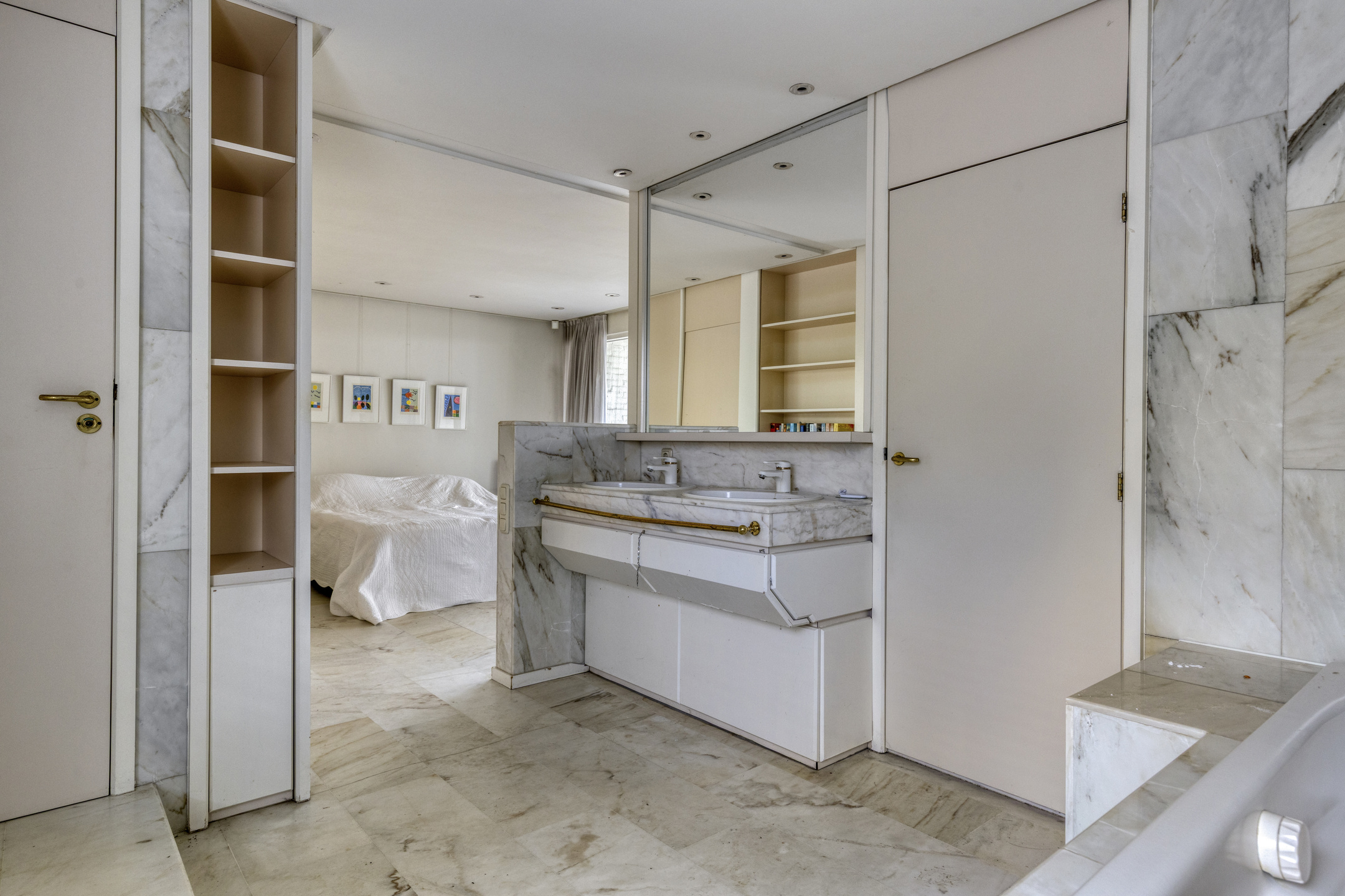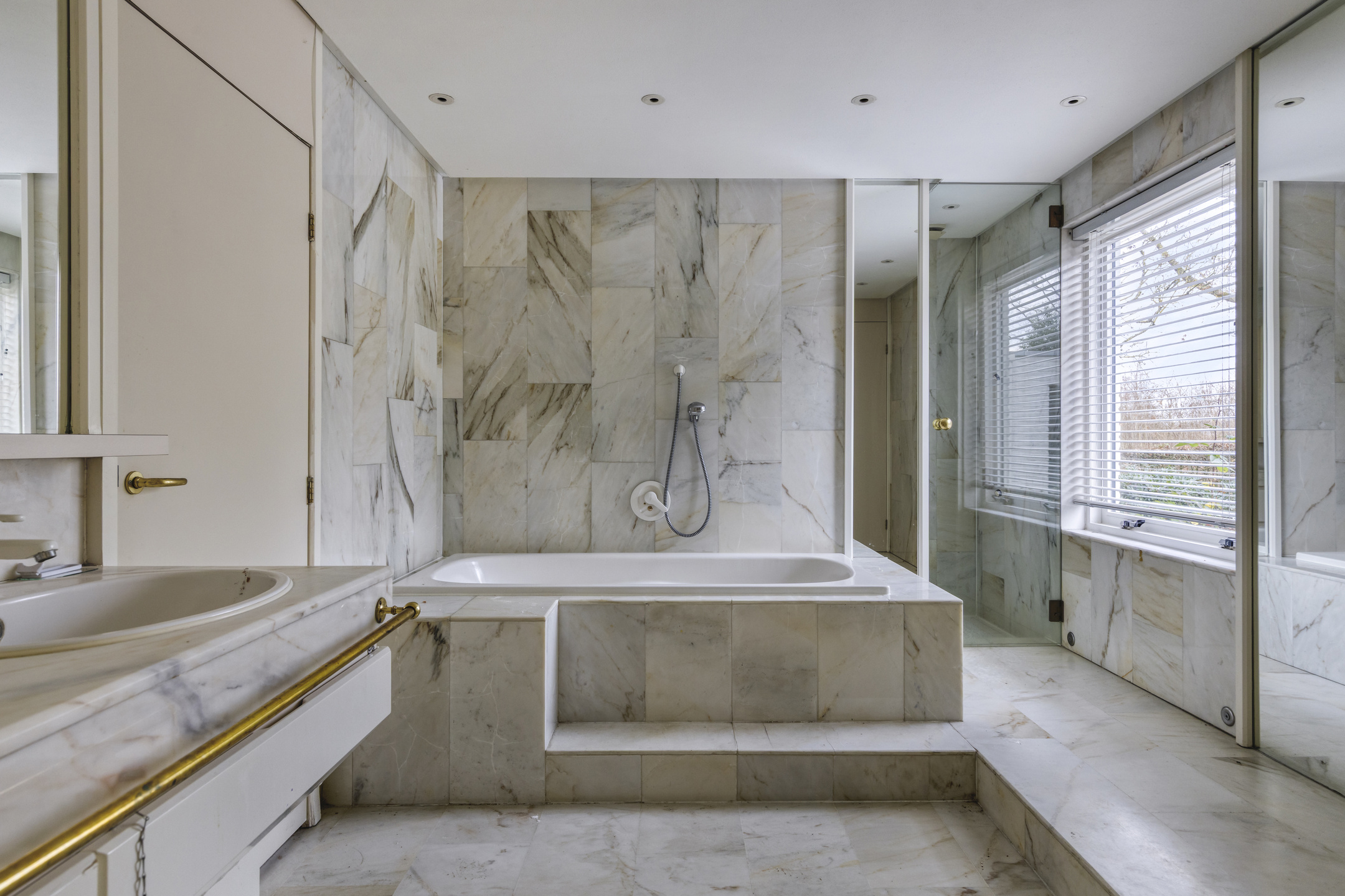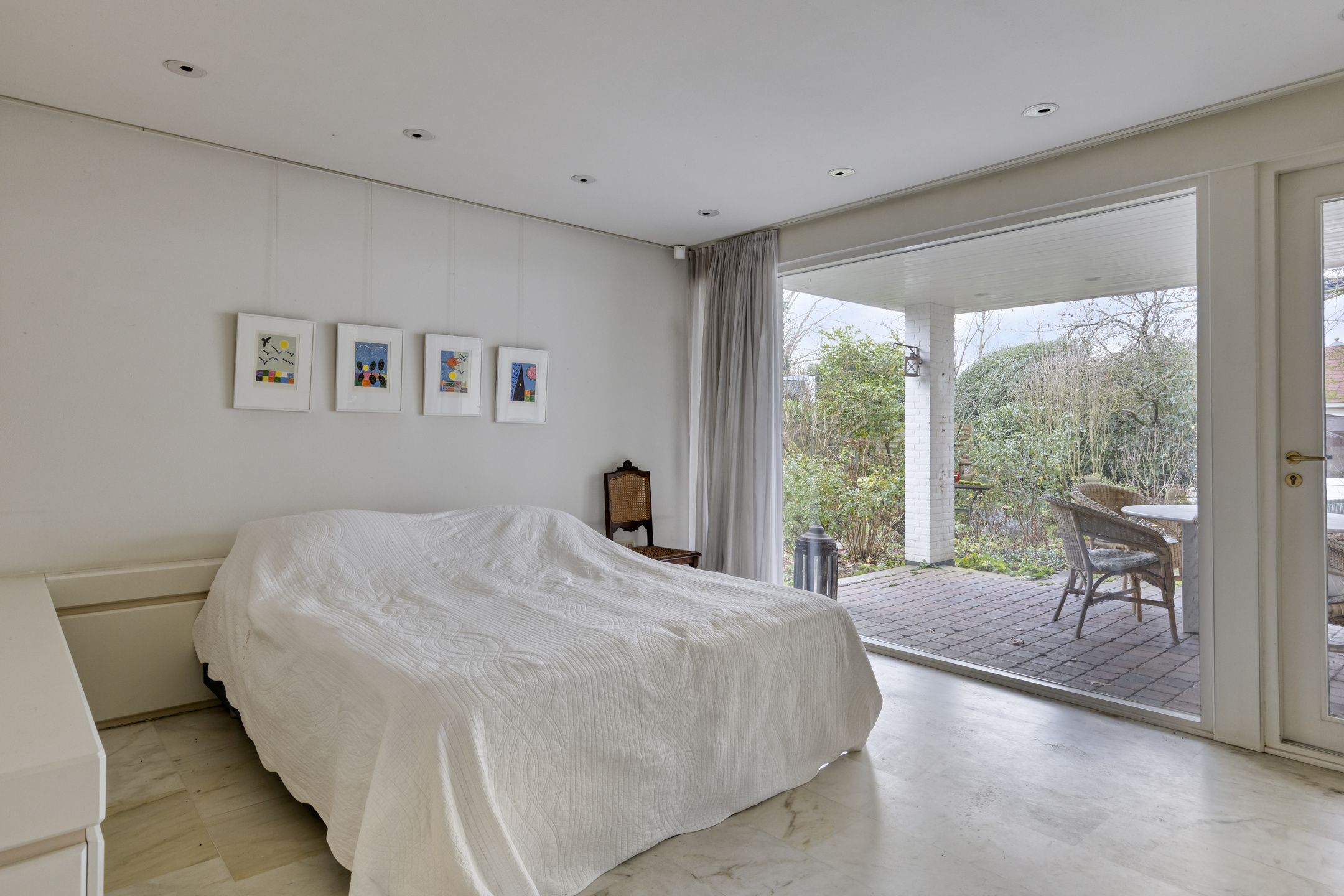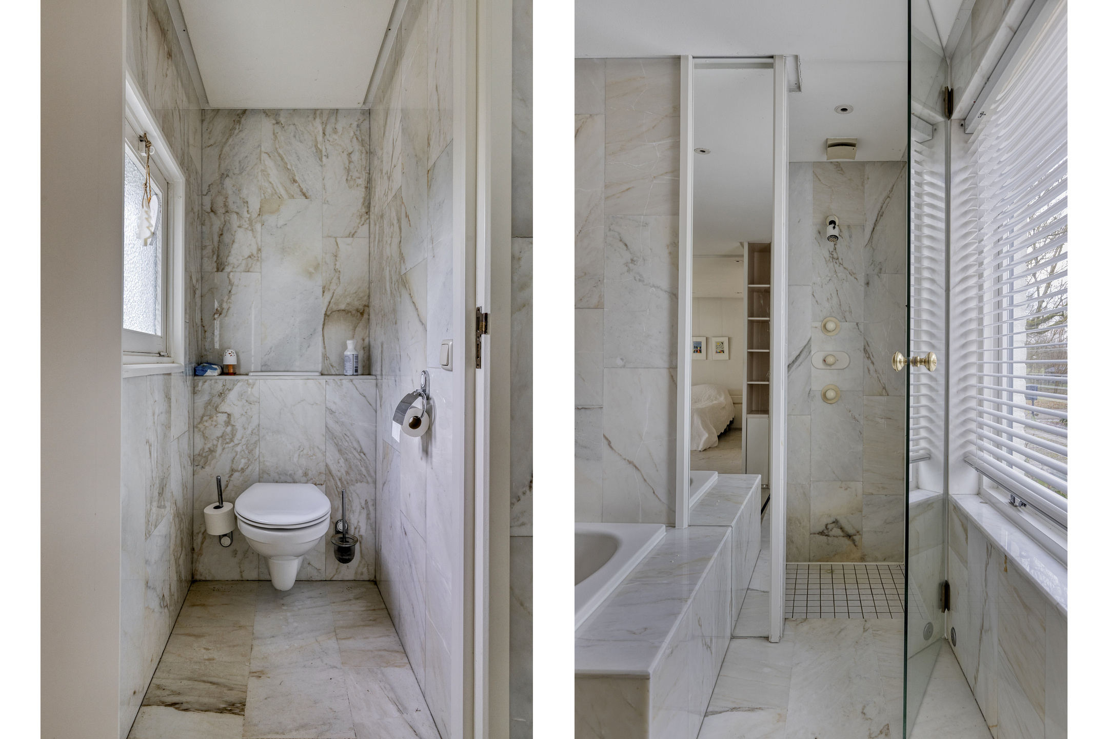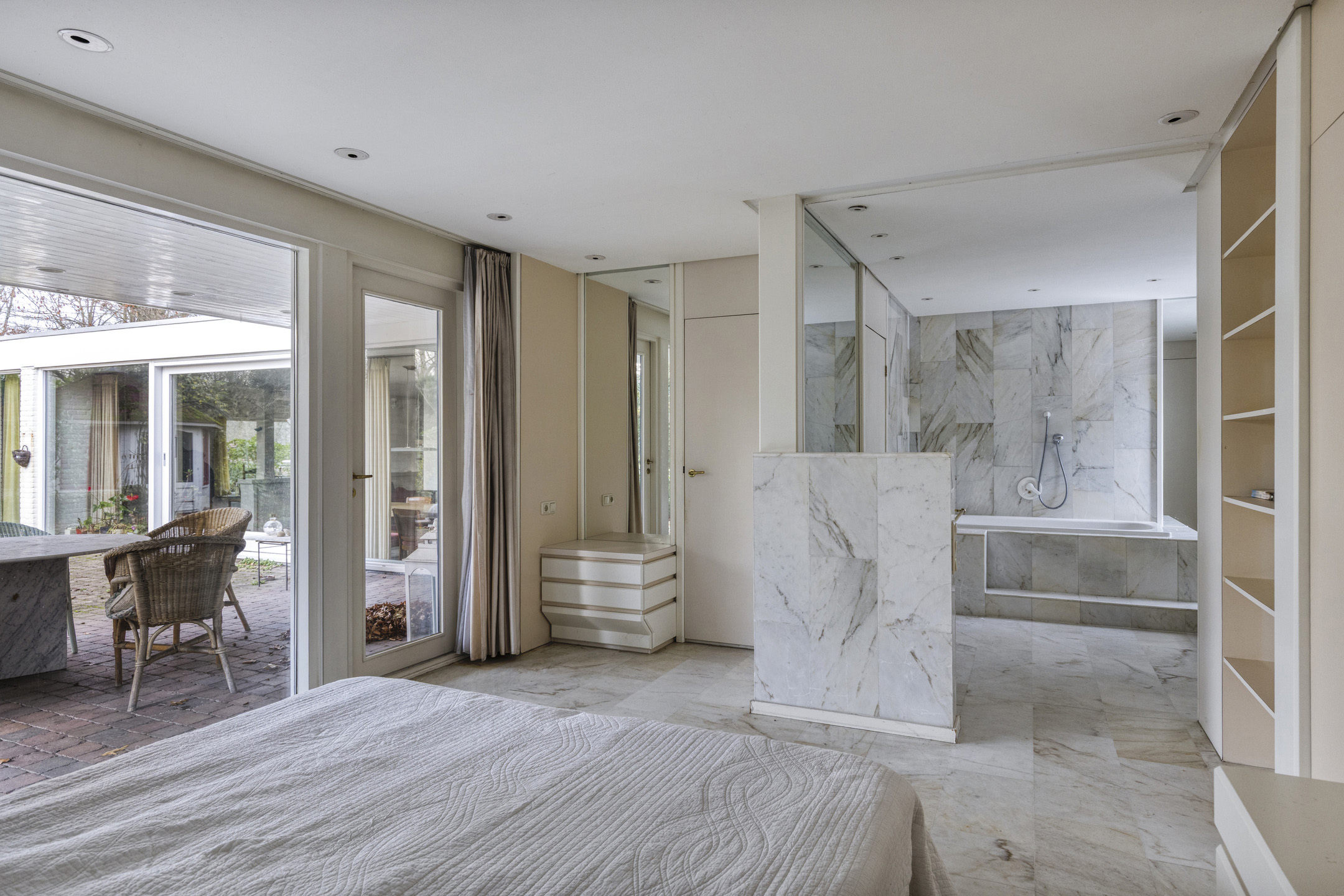 Op de begane grond bevindt zich tevens de slaapvleugel. Hier vindt u twee slaapkamers en een badkamer ensuite. De masterbedroom ligt aan de achterzijde en beschikt over een inloopkast en een ruime badkamer. Deze kamer heeft een groot raam en een loopdeur naar de tuin. De badkamer is royaal opgezet en voorzien van een ligbad, douche, dubbele wastafel en een apart toilet. De tweede slaapkamer op de begane grond is ook uitstekend geschikt als thuiswerkplek of hobbyruimte.