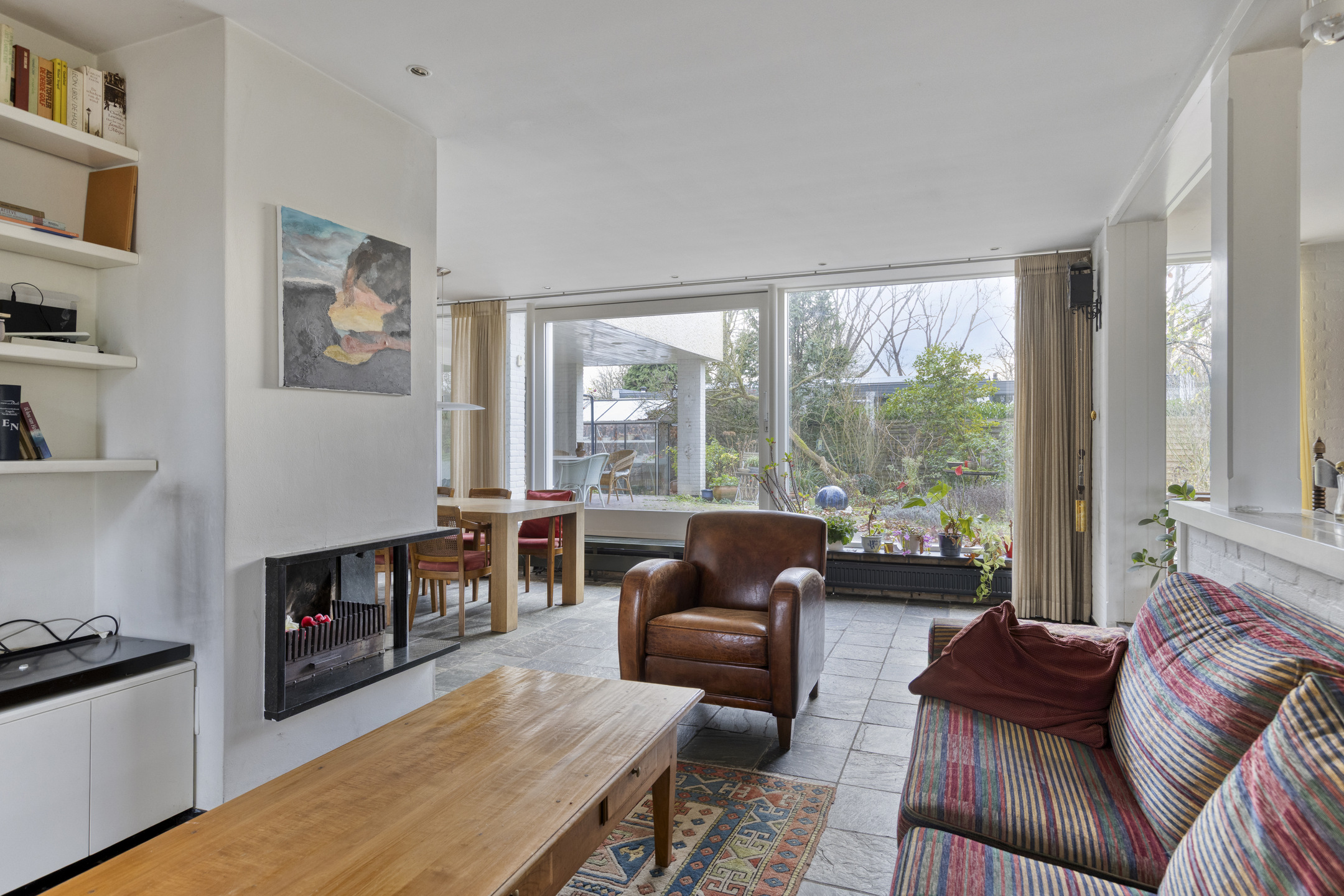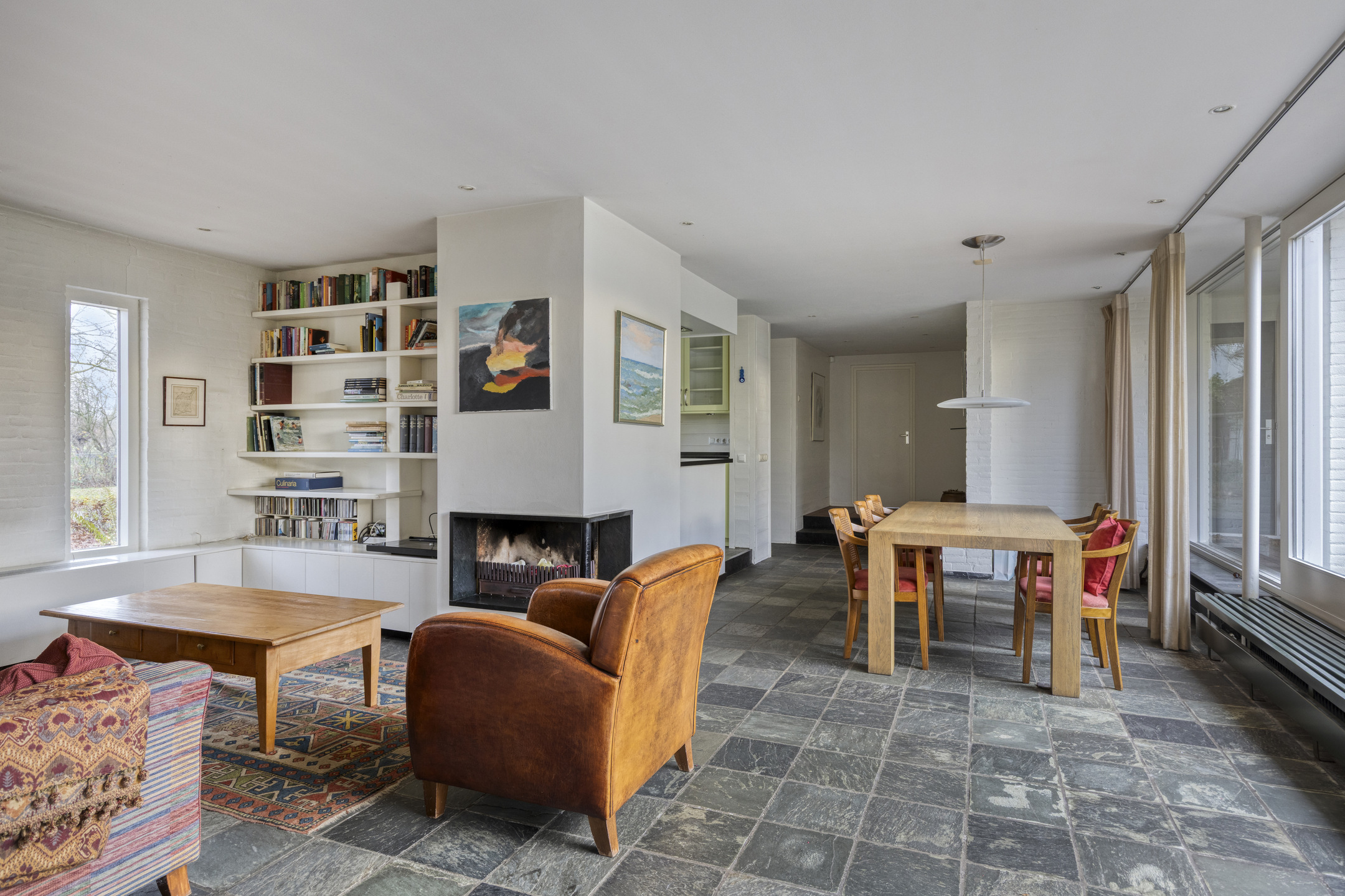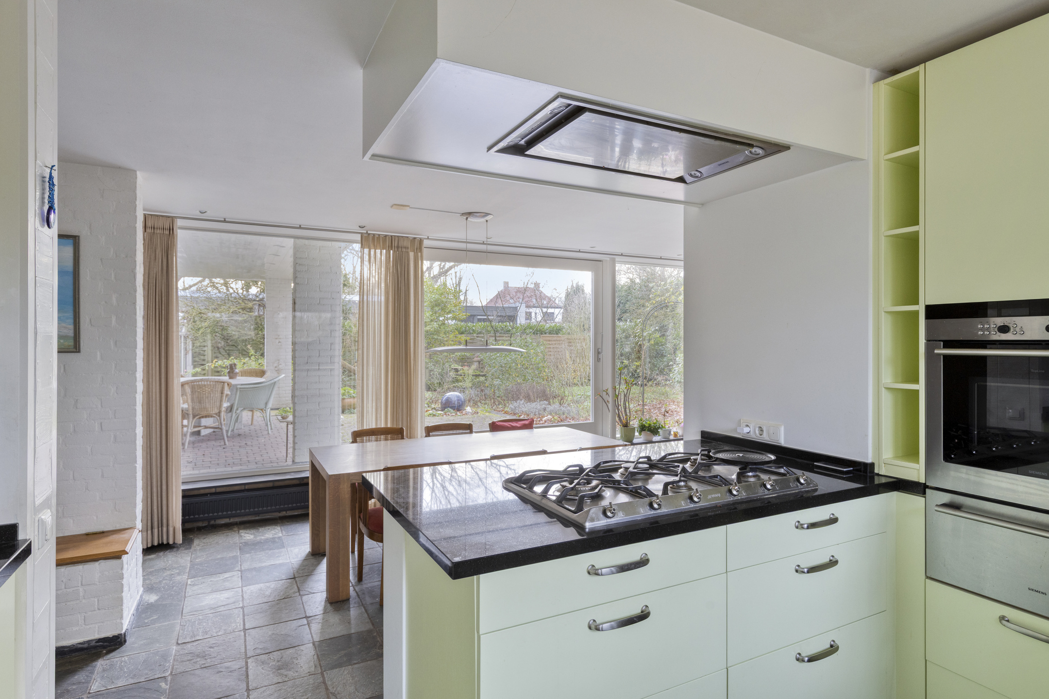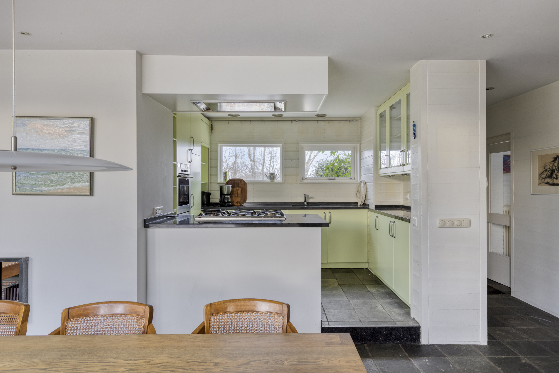 De woonkamer en keuken vormen samen een open en lichte leefruimte. Grote raampartijen zorgen voor een prettige lichtinval en bieden vanuit meerdere hoeken zicht op het groen aan de voorzijde. Aan de voorkant bevindt zich de zithoek met open haard, een fijne plek om te zitten met uitzicht op de rustige straat. Daarnaast is er een tweede zithoek, eveneens met zicht op het groen, waardoor de ruimte verschillende gebruiksmogelijkheden heeft. De eethoek ligt bij de keuken en staat via een grote schuifpui in directe verbinding met de tuin. Dit zorgt voor veel daglicht en een natuurlijke overgang tussen binnen en buiten. De keuken is compact van opzet, maar biedt volop kansen om uit te breiden of opnieuw in te delen, passend bij uw eigen wensen.