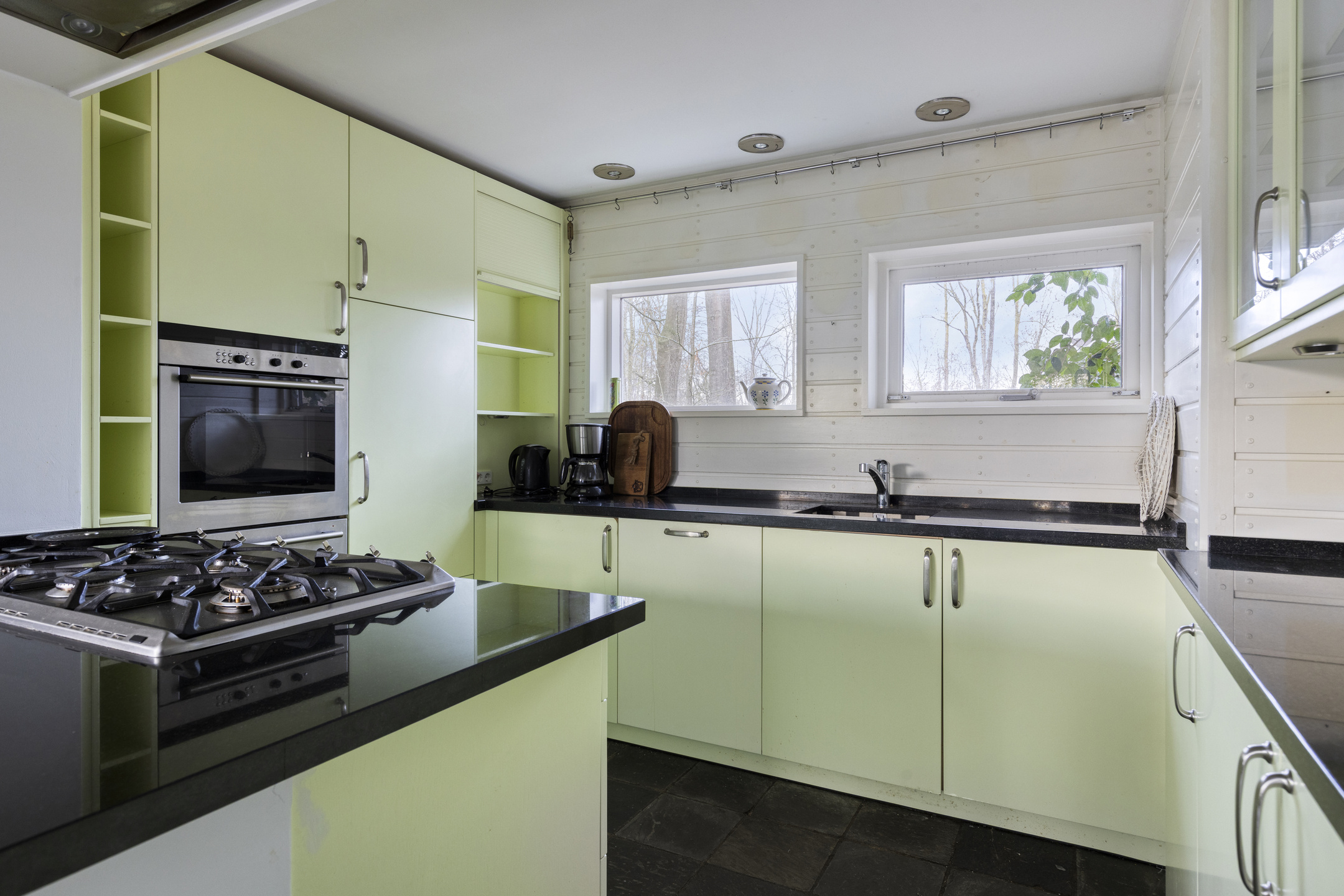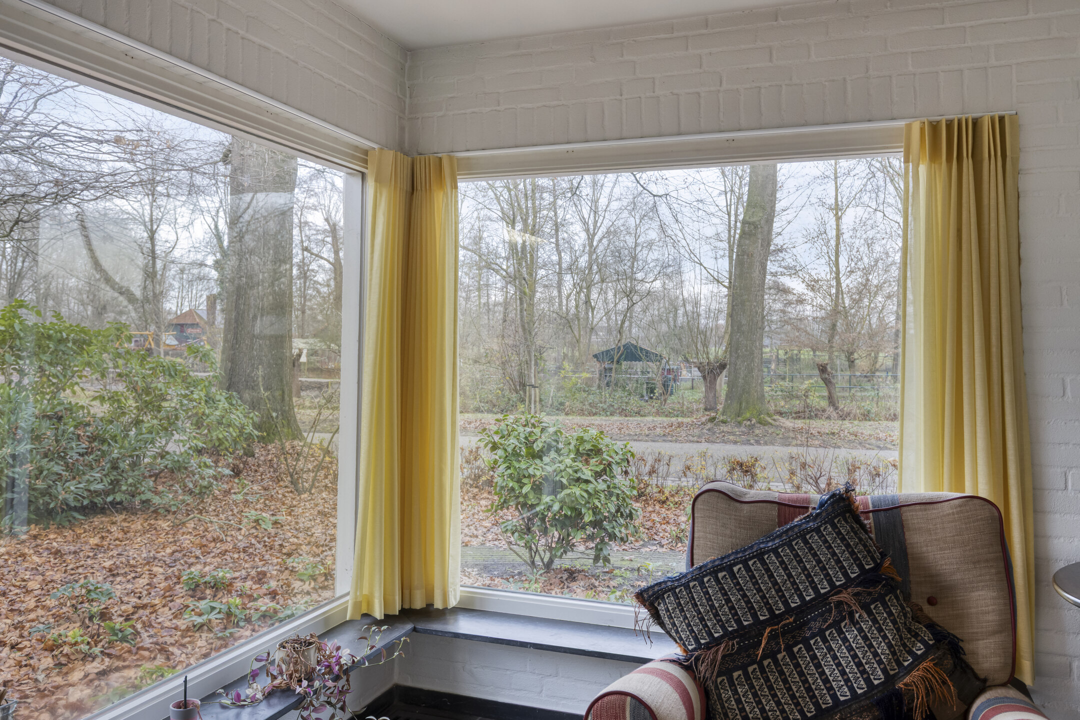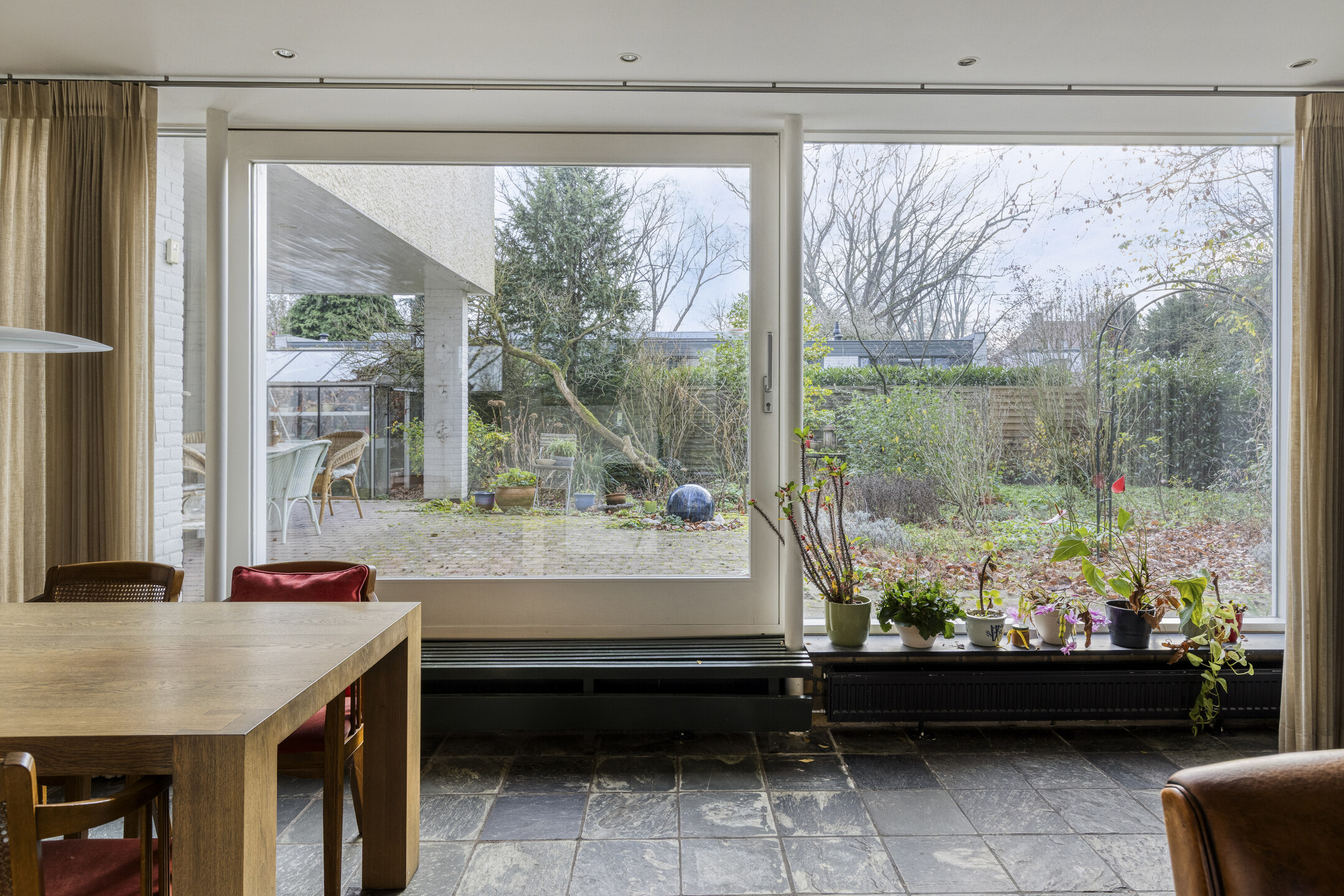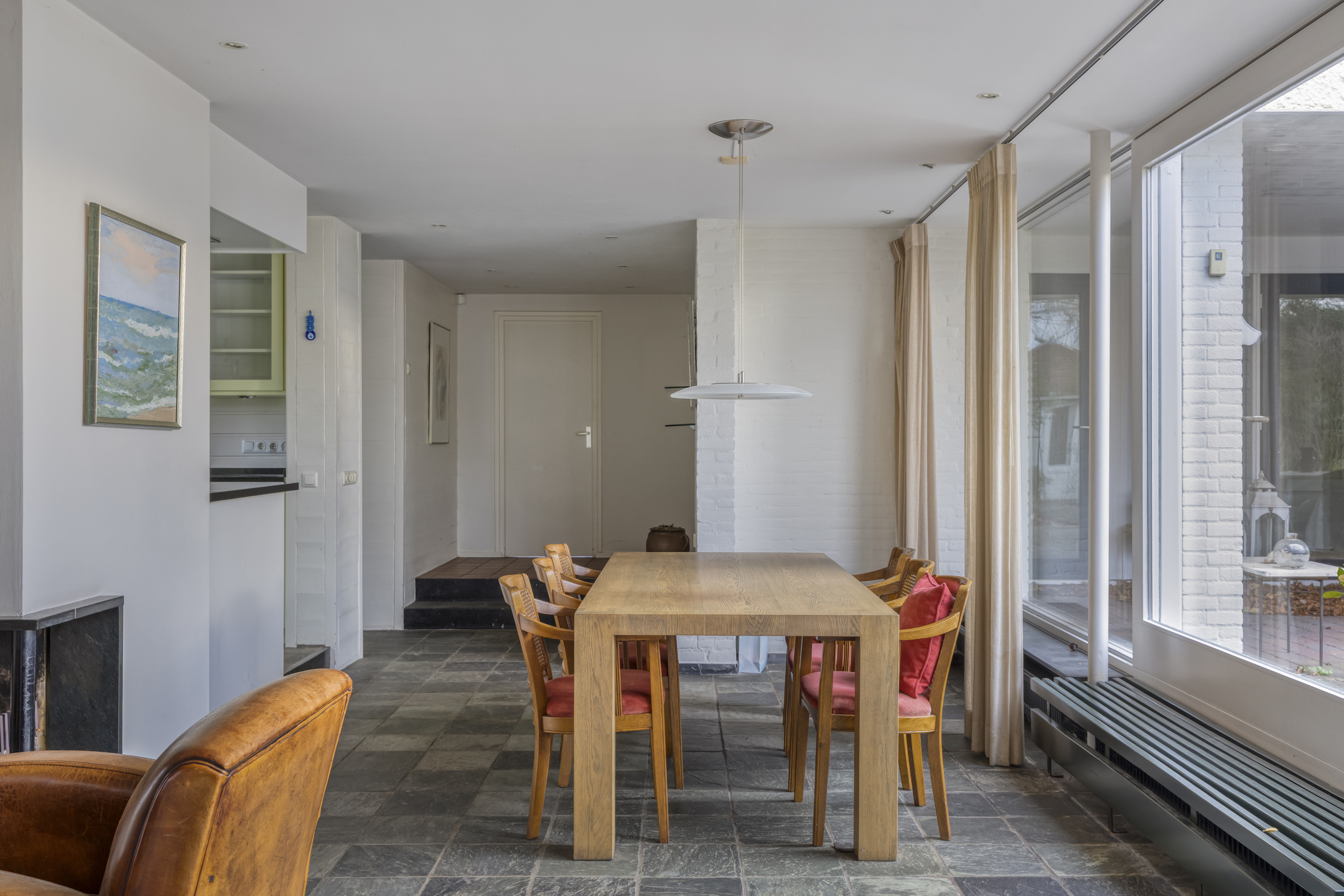 De woonkamer en keuken vormen samen een open en lichte leefruimte. Grote raampartijen zorgen voor een prettige lichtinval en bieden vanuit meerdere hoeken zicht op het groen aan de voorzijde. Aan de voorkant bevindt zich de zithoek met open haard, een fijne plek om te zitten met uitzicht op de rustige straat. Daarnaast is er een tweede zithoek, eveneens met zicht op het groen, waardoor de ruimte verschillende gebruiksmogelijkheden heeft. De eethoek ligt bij de keuken en staat via een grote schuifpui in directe verbinding met de tuin. Dit zorgt voor veel daglicht en een natuurlijke overgang tussen binnen en buiten. De keuken is compact van opzet, maar biedt volop kansen om uit te breiden of opnieuw in te delen, passend bij uw eigen wensen.