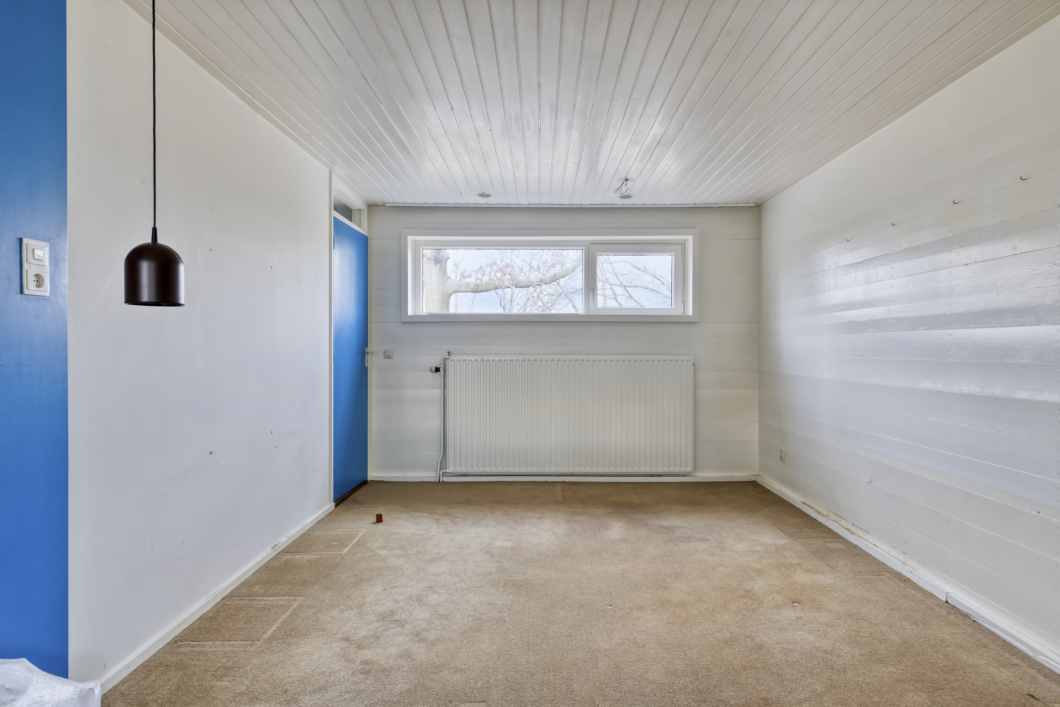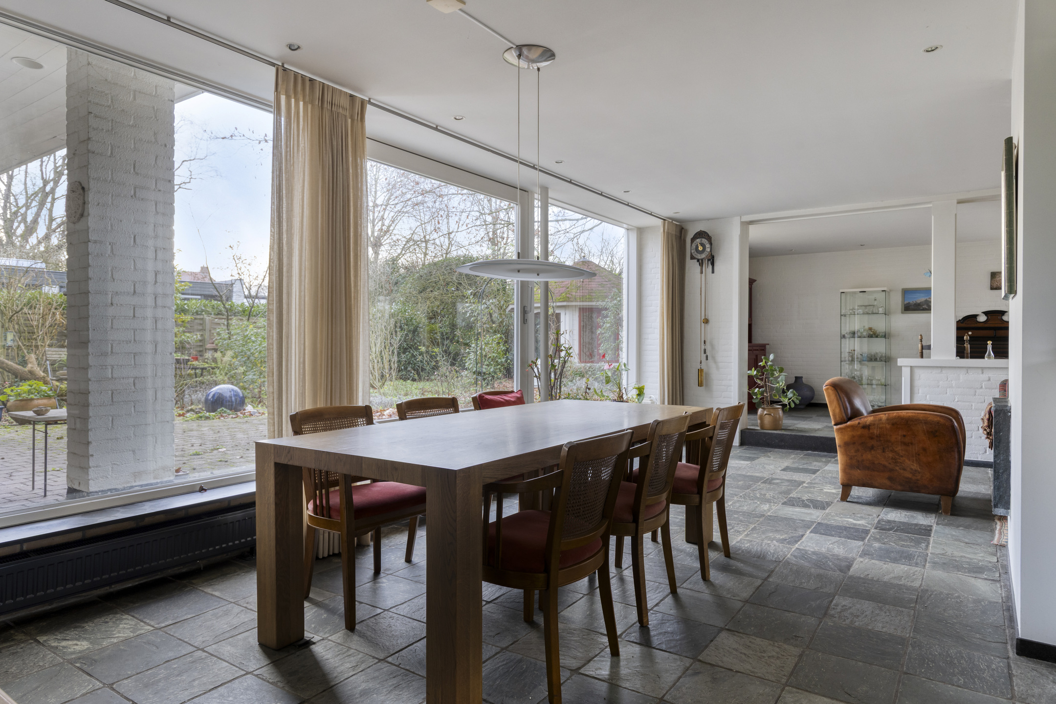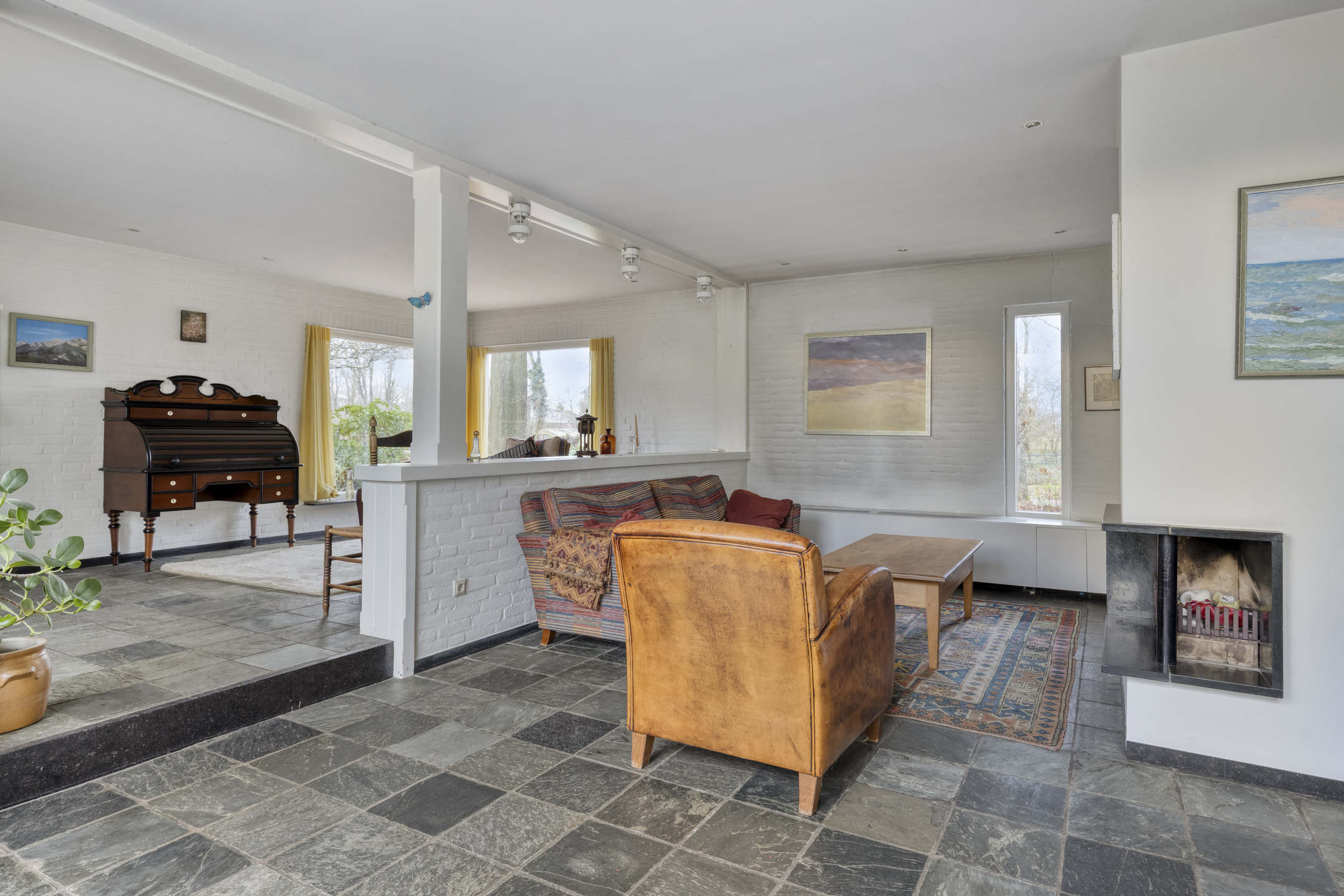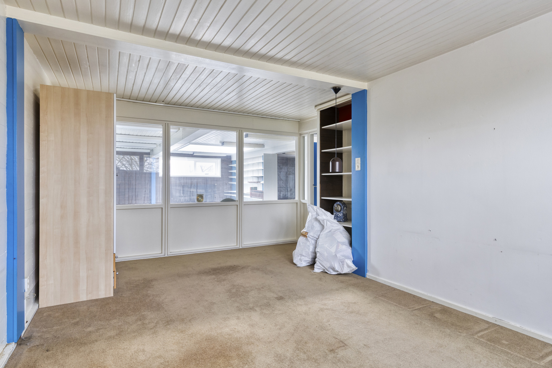 De woonkamer en keuken vormen samen een open en lichte leefruimte. Grote raampartijen zorgen voor een prettige lichtinval en bieden vanuit meerdere hoeken zicht op het groen aan de voorzijde. Aan de voorkant bevindt zich de zithoek met open haard, een fijne plek om te zitten met uitzicht op de rustige straat. Daarnaast is er een tweede zithoek, eveneens met zicht op het groen, waardoor de ruimte verschillende gebruiksmogelijkheden heeft. De eethoek ligt bij de keuken en staat via een grote schuifpui in directe verbinding met de tuin. Dit zorgt voor veel daglicht en een natuurlijke overgang tussen binnen en buiten. De keuken is compact van opzet, maar biedt volop kansen om uit te breiden of opnieuw in te delen, passend bij uw eigen wensen.
