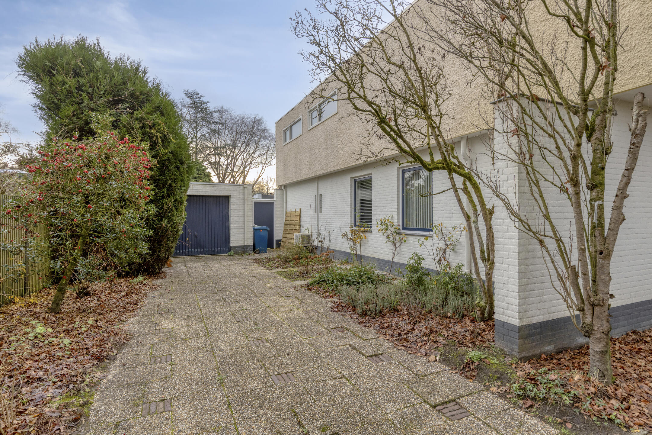 Aan de voorzijde beschikt de woning over een ruime oprit met toegang tot de garage. De garage is royaal, voorzien van een roldeur en geschikt voor het stallen van een auto. Via de oprit is er tevens een poort naar de achtertuin.