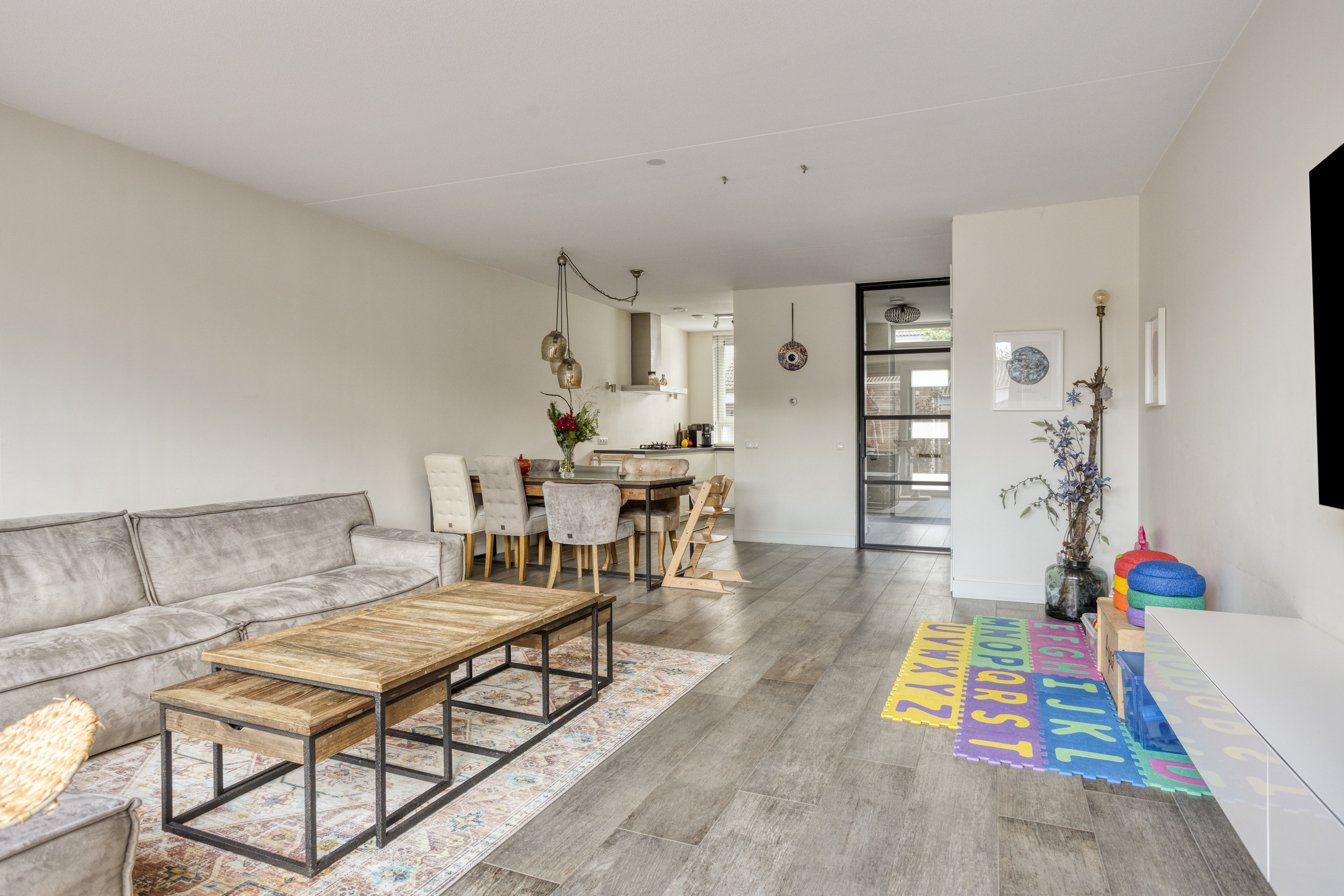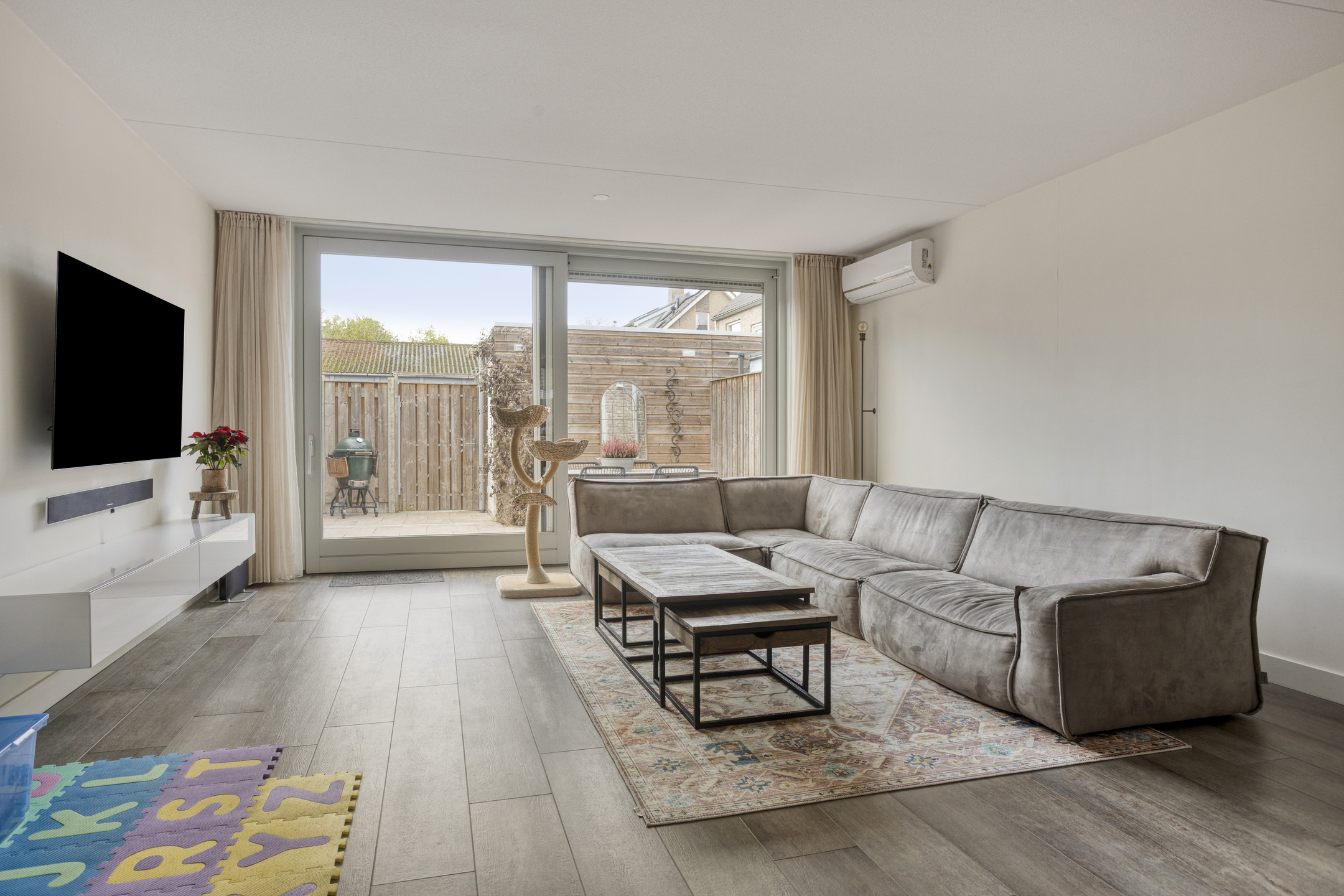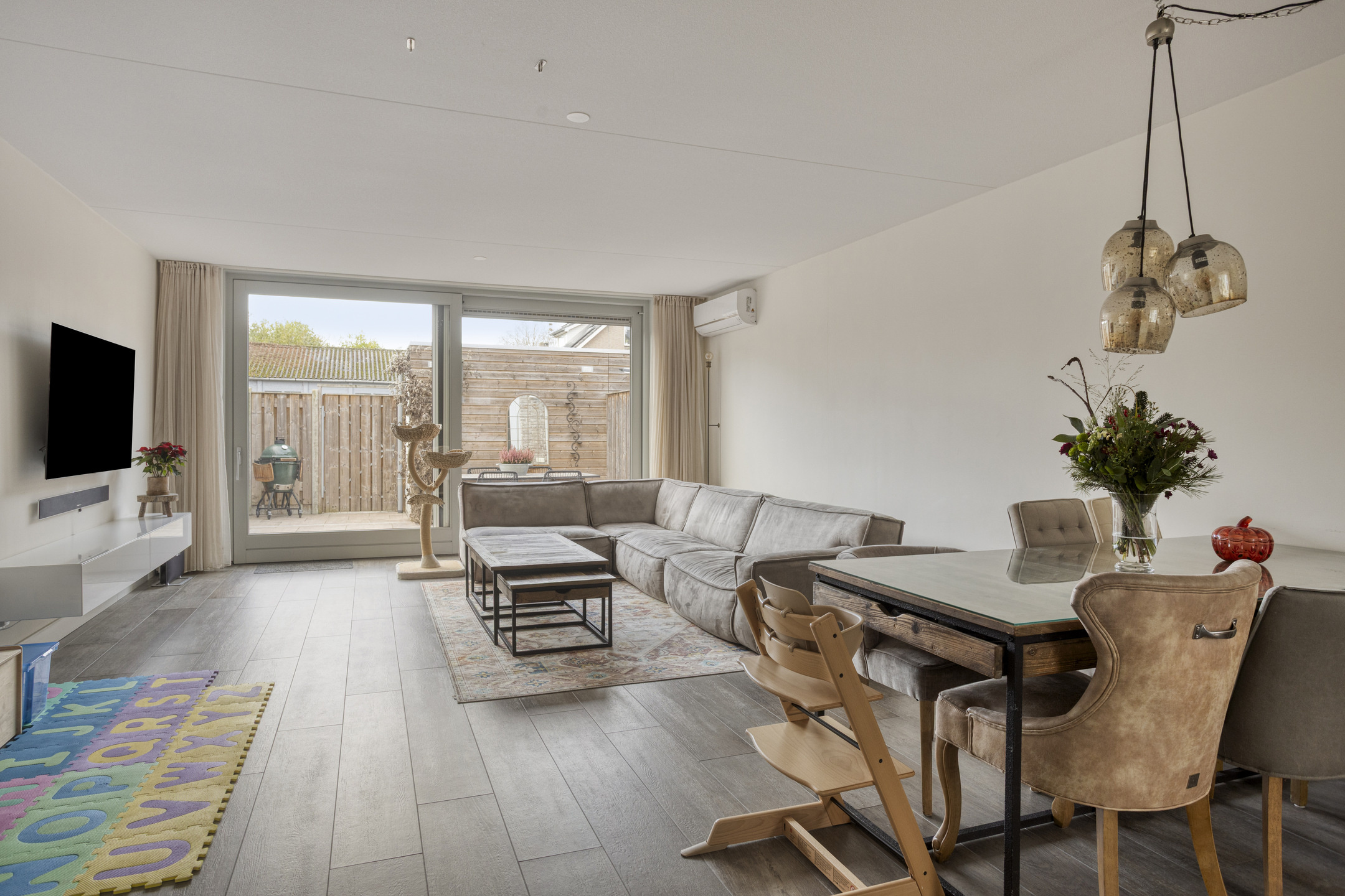 De woonkamer is ruim en licht en afgewerkt met dezelfde keramische tegelvloer. Via de brede schuifpui kijk je uit op de achtertuin. Er is een airco uit 2024 aanwezig. De woonkamer staat in open verbinding met de keuken. Onder de trap bevindt zich een praktische trapkast voor voorraad. Er is voldoende ruimte voor een fijne zithoek en een eettafel.