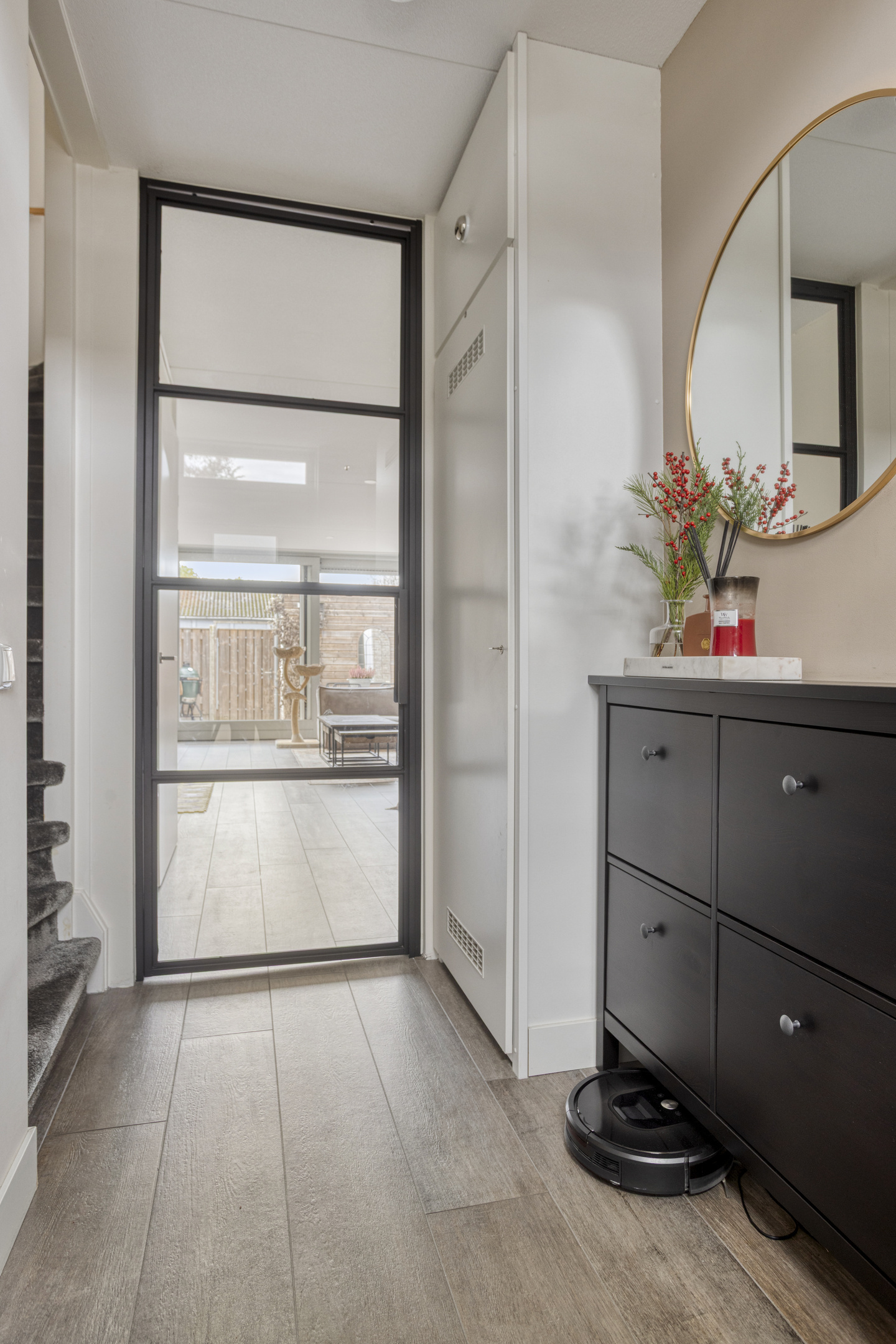 De entree geeft toegang tot het toilet en de trap naar de eerste verdieping. De trap is afgewerkt met vloerbekleding. Mooie wandpanelen zorgen voor geluidsdemping. Via een stalen deur loop je door naar de woonkamer. Op de vloer ligt een keramische tegelvloer die onderhoudsvriendelijk is.