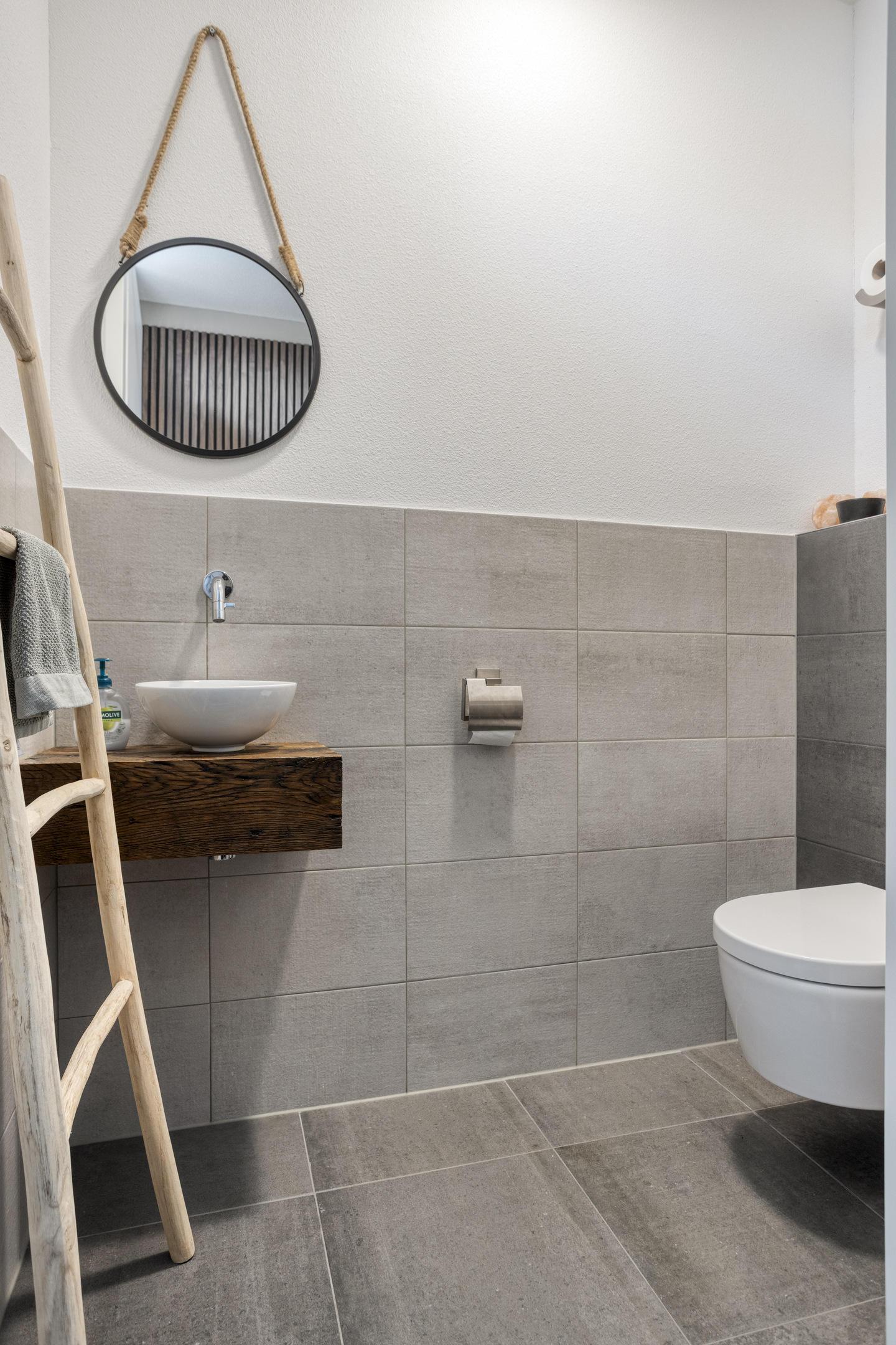 Het toilet is ruim en halfhoog betegeld. Er is een wandcloset en een fonteintje met een houten accent, wat zorgt voor een nette uitstraling.