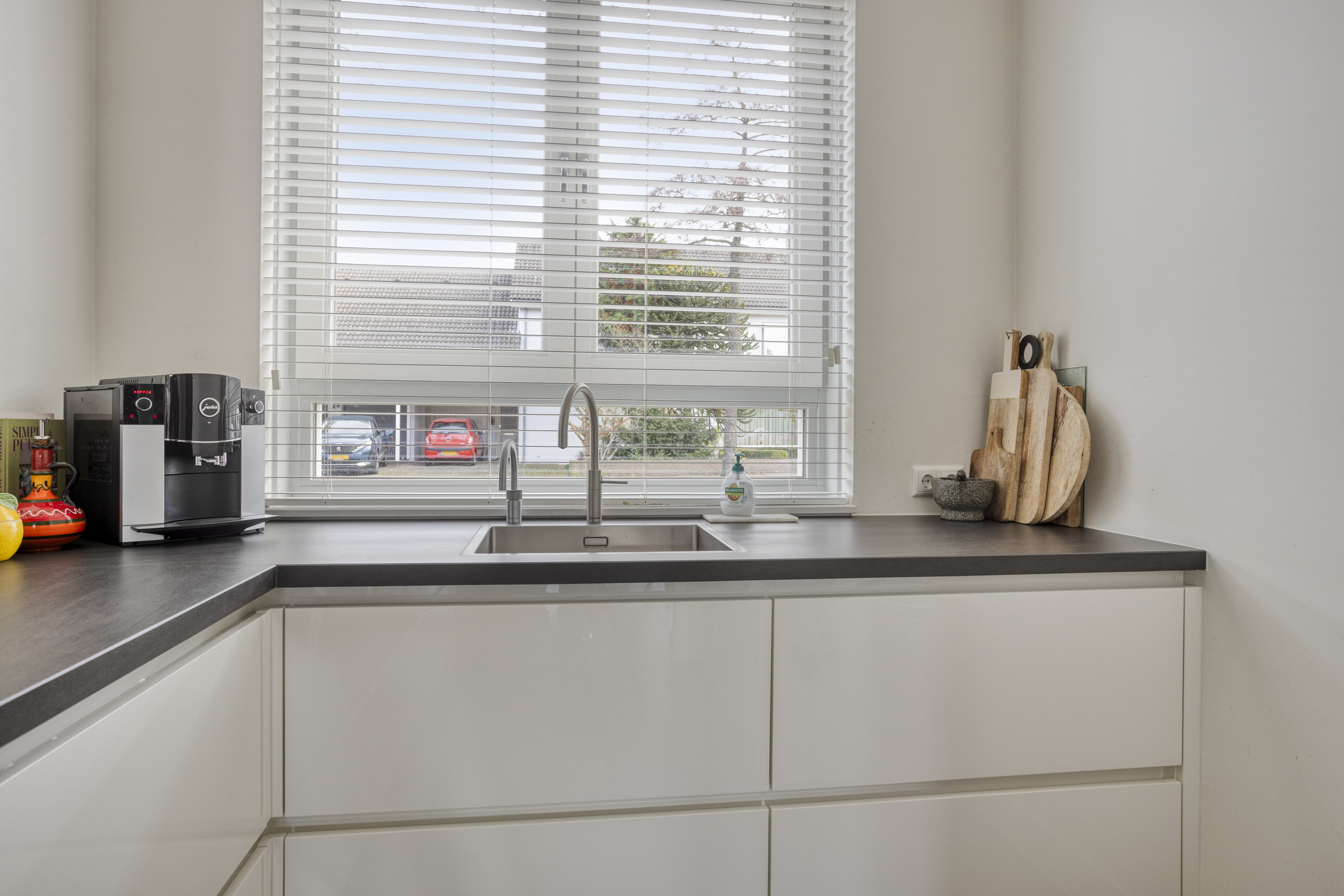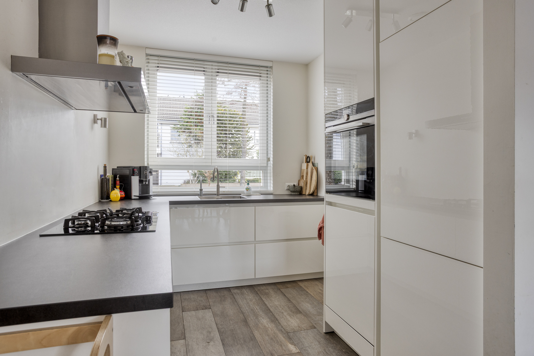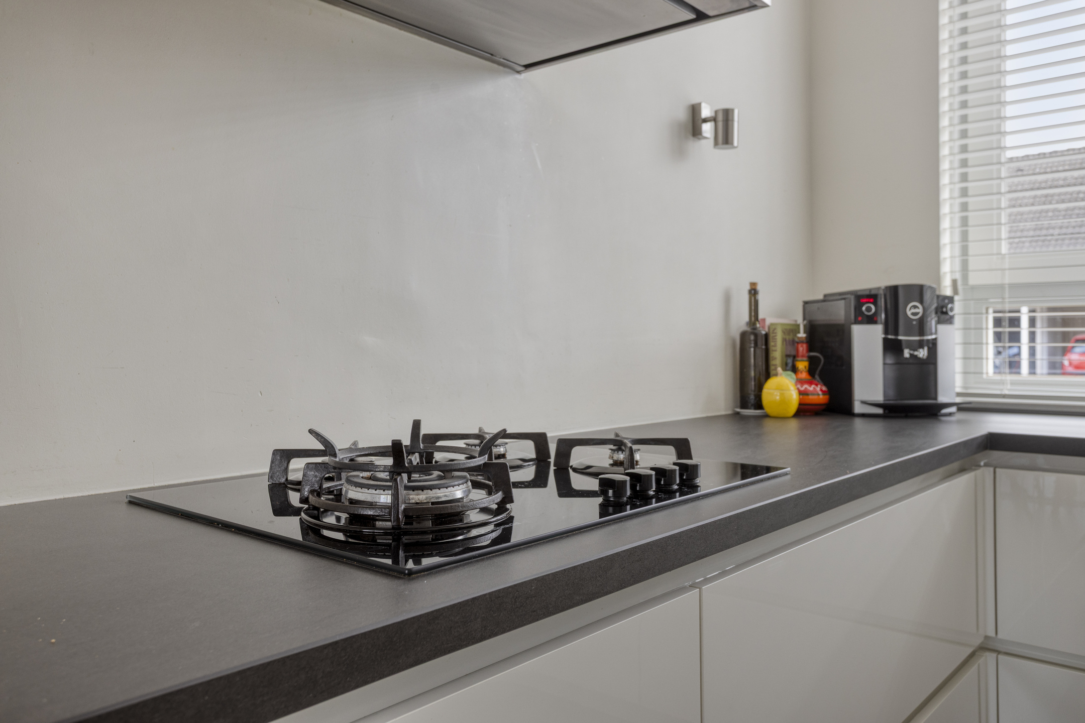 De design Van Diessen keuken staat open in verbinding met de woonkamer en heeft witte fronten. De keuken is voorzien van een vriezer, koelkast, oven, 4-pits gasfornuis, spoelbak, afzuigkap en vaatwasser. De Quooker-kraan is praktisch in dagelijks gebruik. Wandlampen zorgen voor extra sfeer.