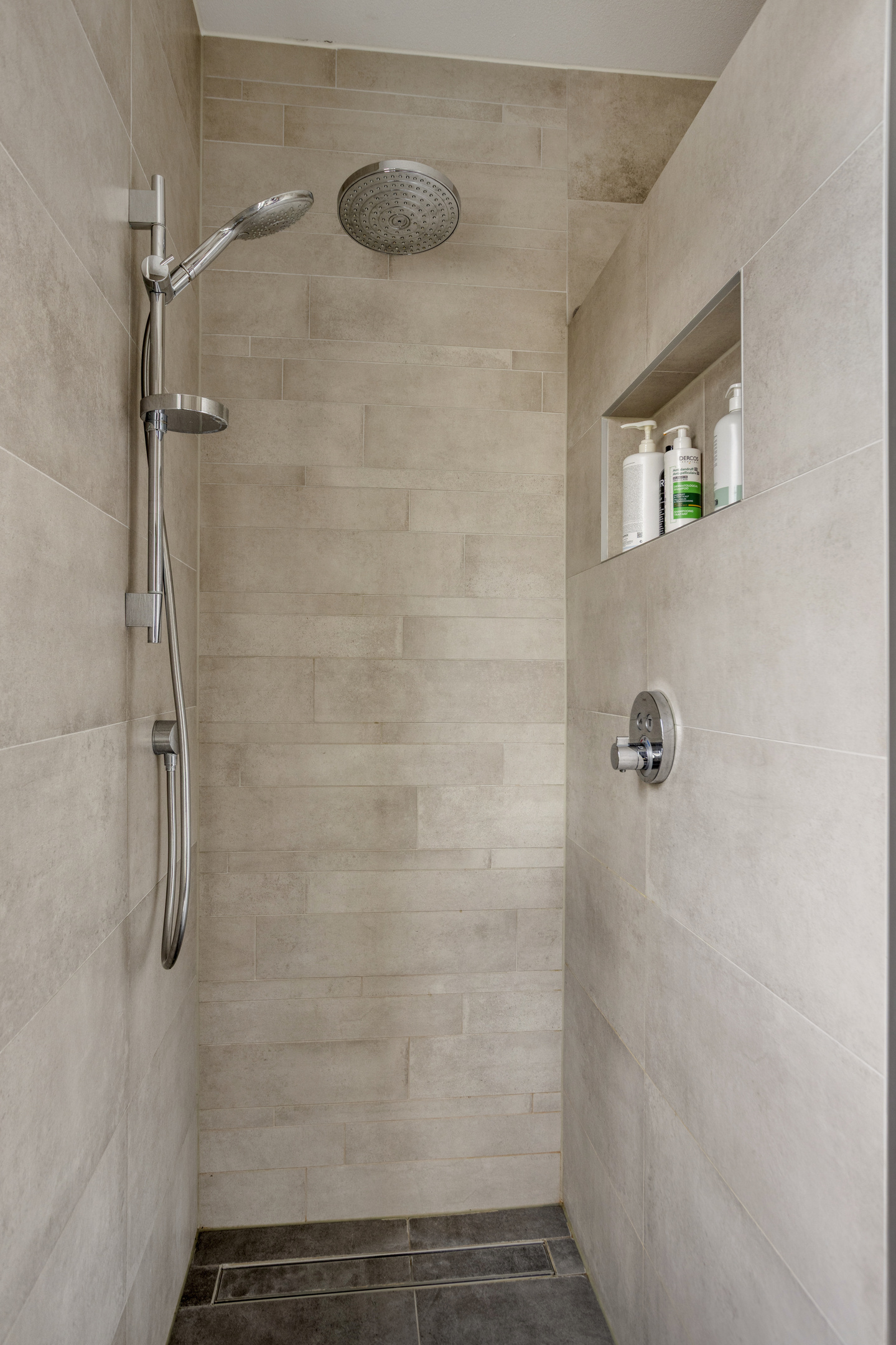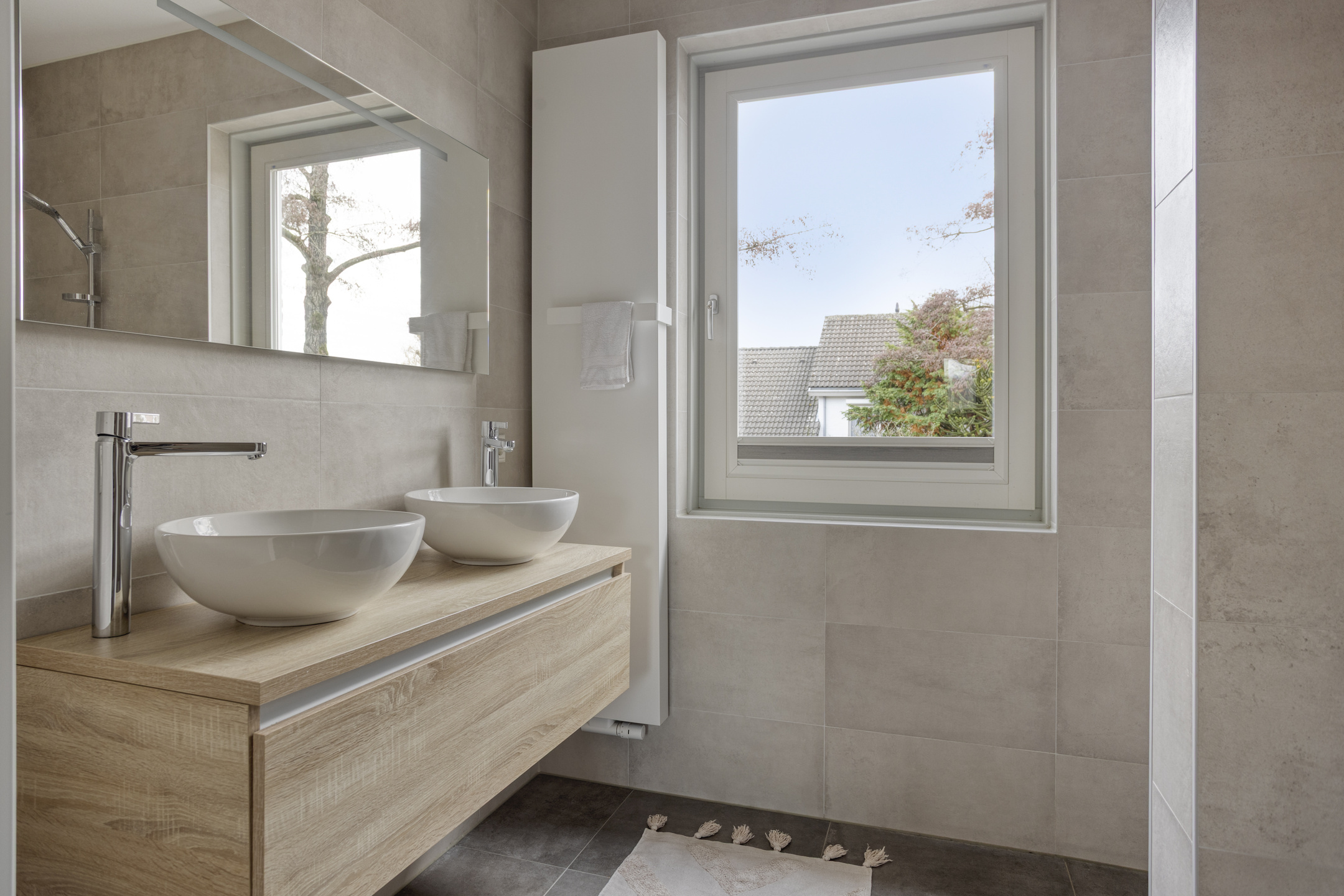 De badkamer is volledig tot wandhoogte betegeld. Er is een inloopdouche met aparte handdouche, een wandcloset en een design radiator. Het grote raam zorgt voor daglicht. Het dubbele wastafelmeubel met houtmotief geeft de badkamer een stijlvolle uitstraling.