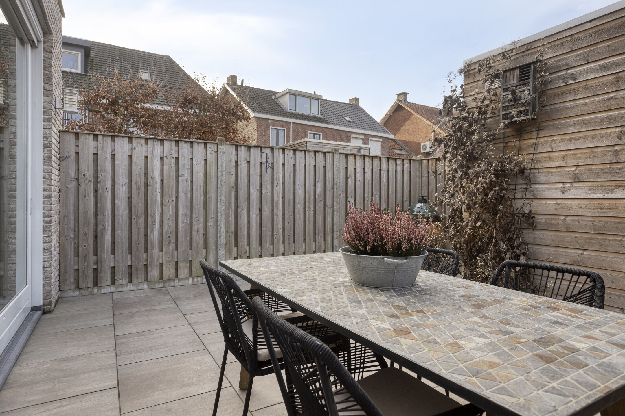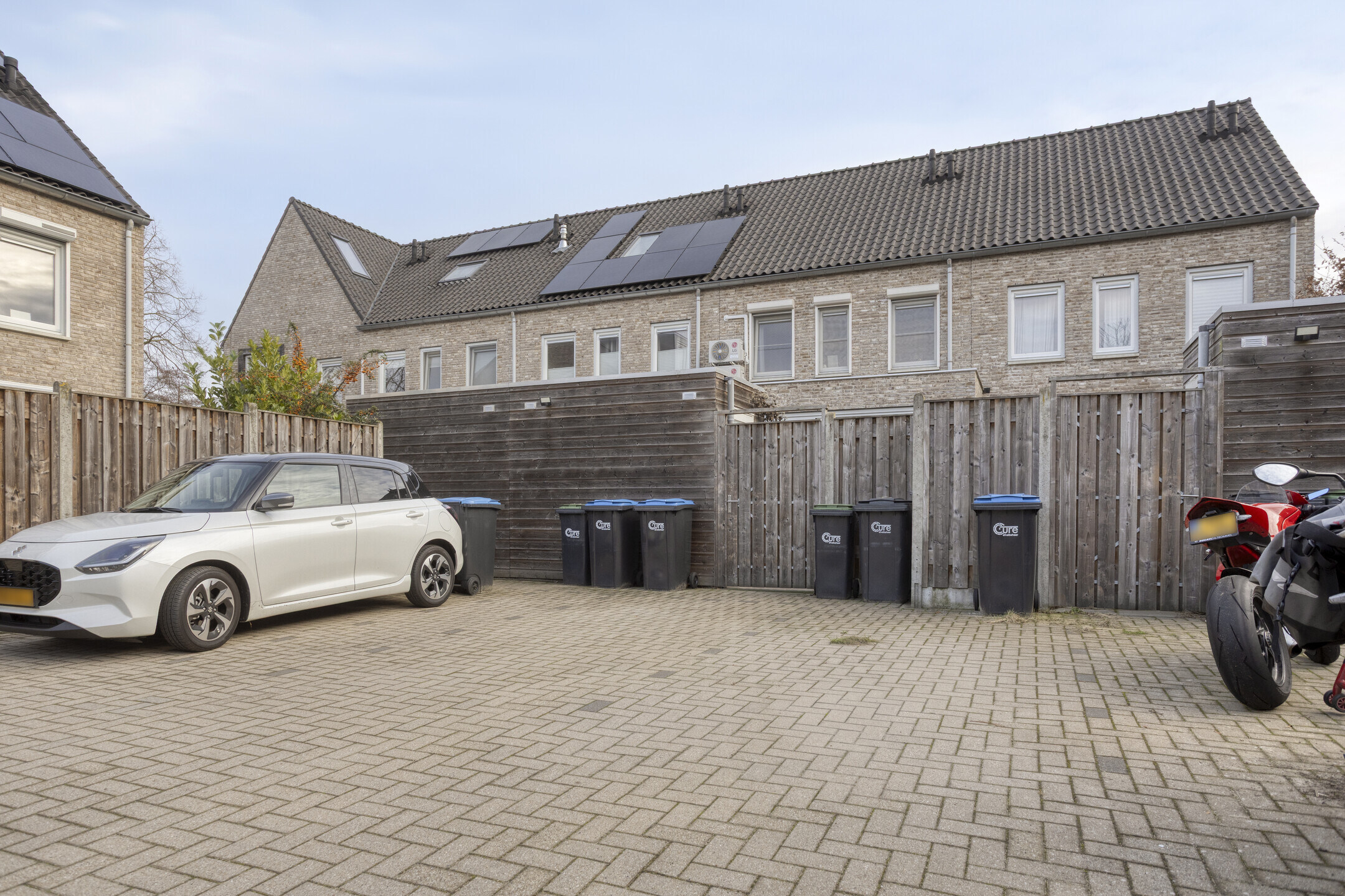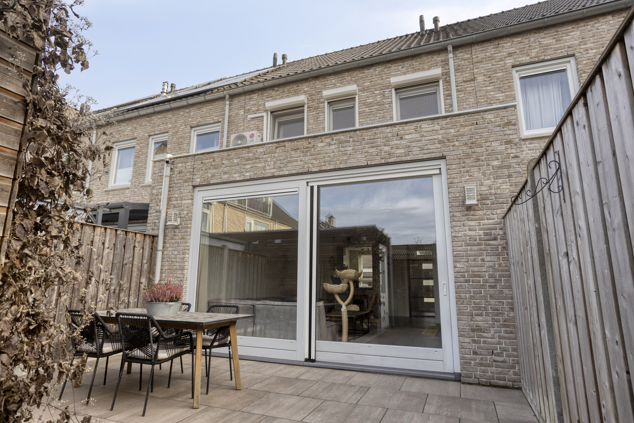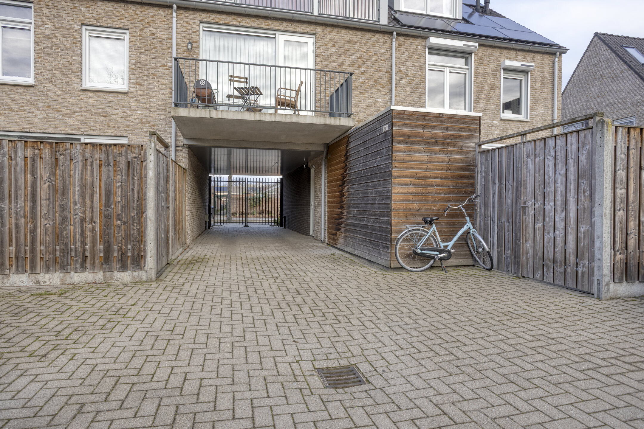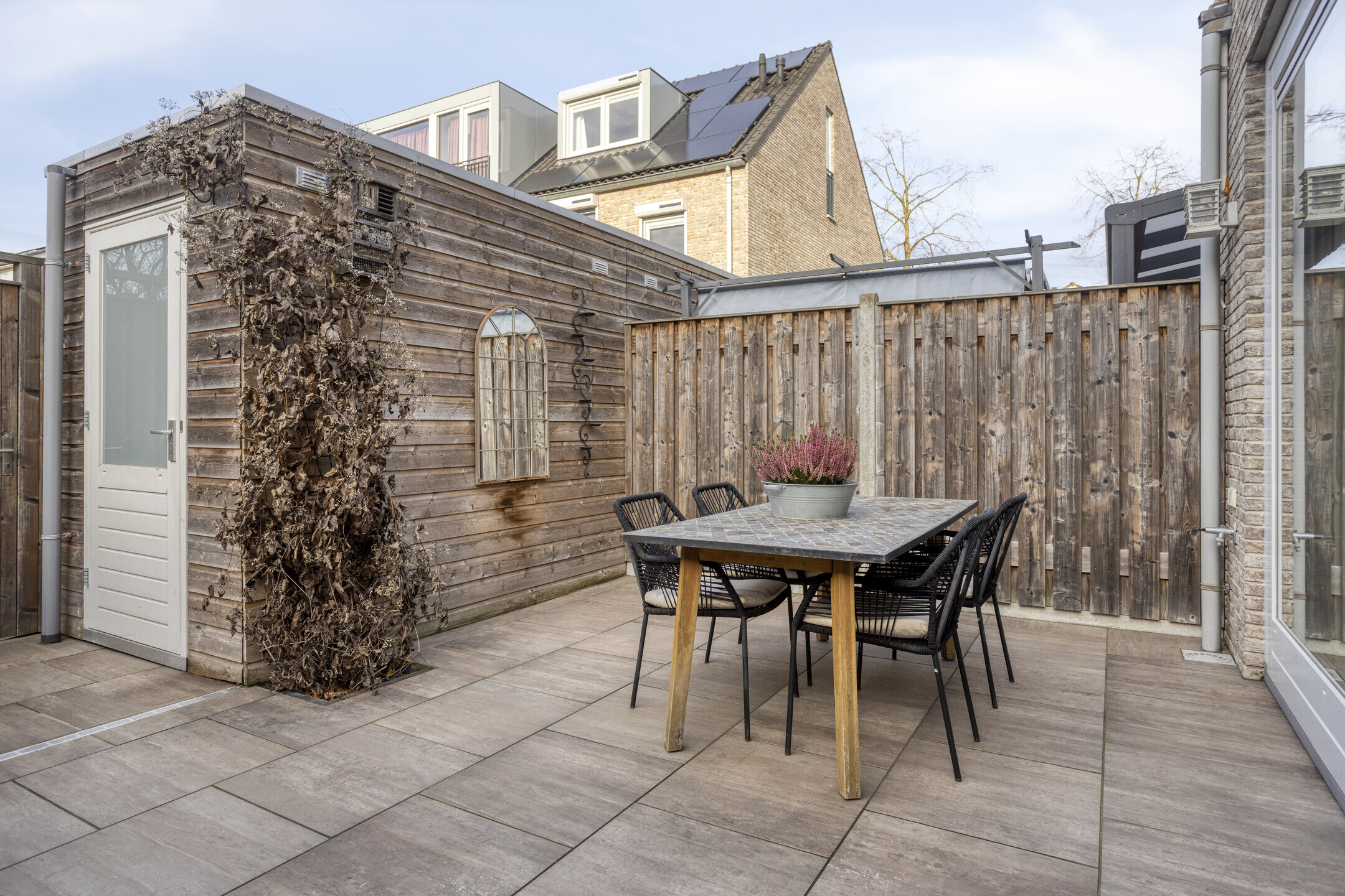 De achtertuin is volledig betegeld en bereikbaar via een grote schuifpui vanuit de woonkamer. Er is een eigen achterom naar een prive parkeerplaats en 3 gedeelde parkeerplaatsen. Achter in de tuin staat een berging met ruimte voor fietsen en het opbergen van tuingereedschap.