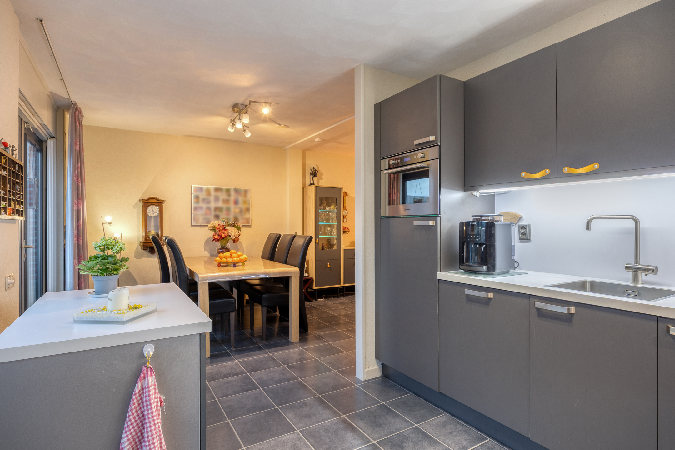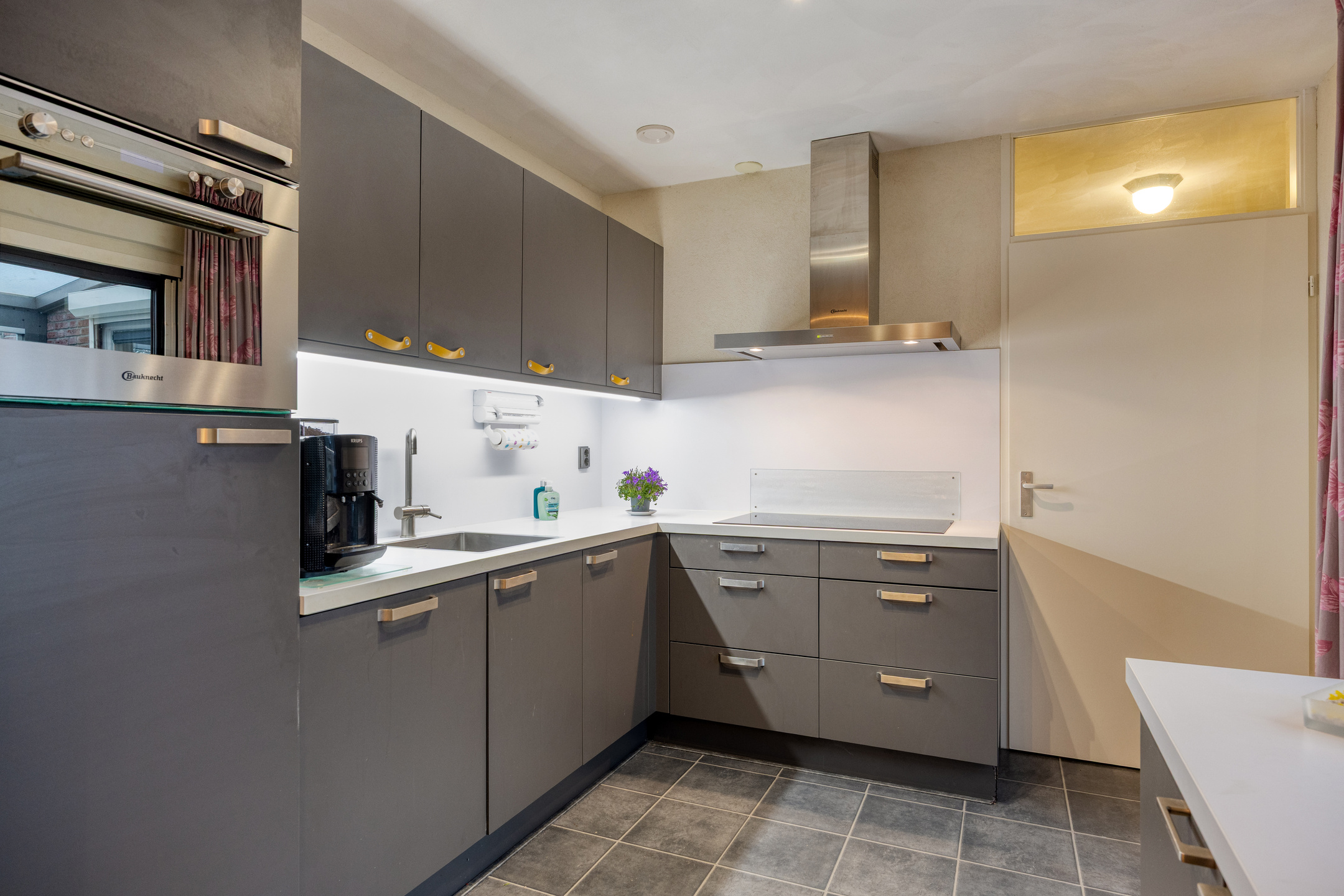 De keuken heeft donkere fronten met een wit werkblad en is opgesteld in een L-vorm met een klein eiland voor extra bergruimte. De keuken is tevens voorzien van een koelkast, combi-oven, vaatwasser, grote inductiekookplaat en een afzuigkap. Vanuit de keuken is er toegang tot de bergruimte, de badkamer en de slaapkamer op de begane grond.