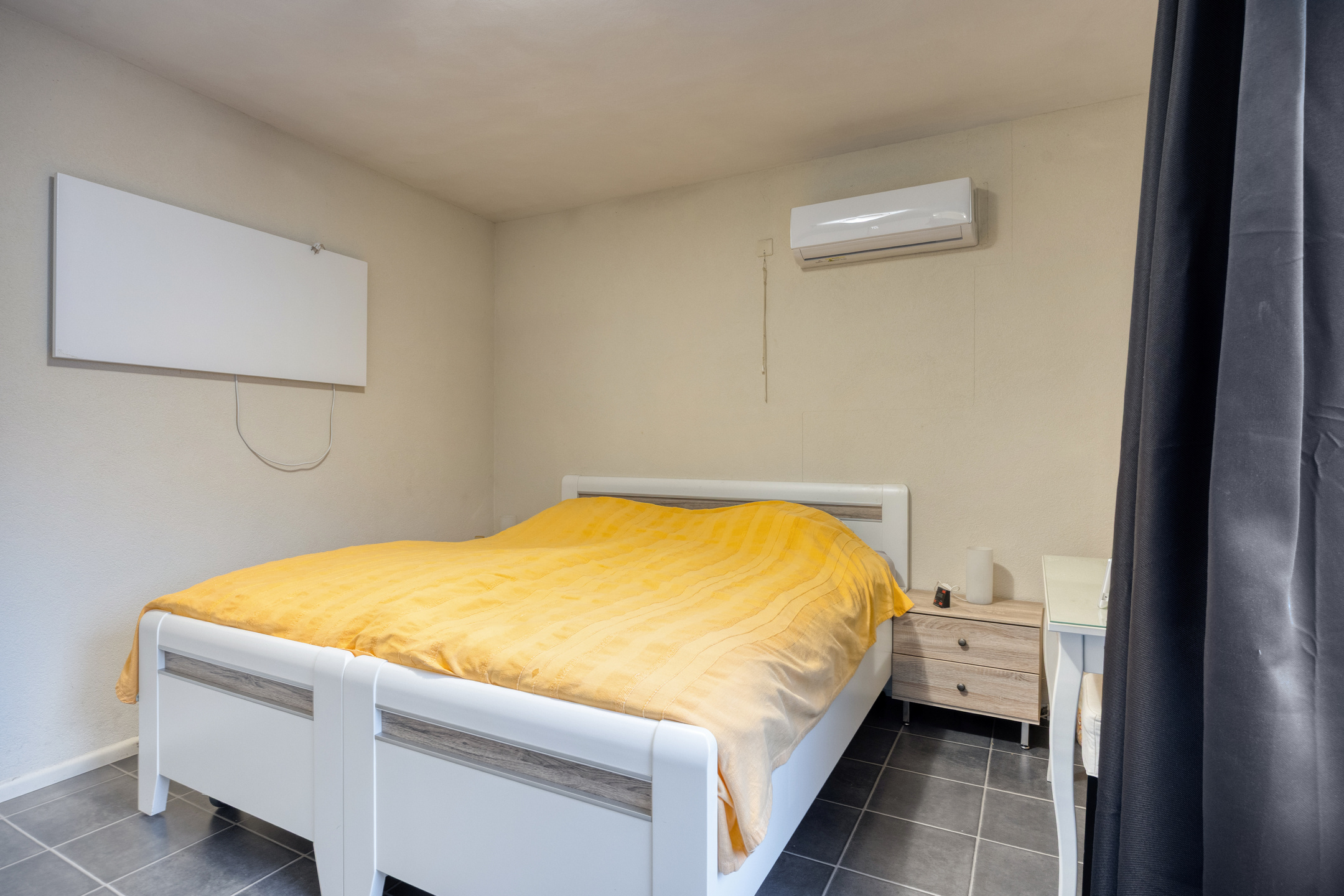 De slaapkamer ligt aan de achterzijde en kijkt uit op de tuin. De vloer is afgewerkt met dezelfde laminaatvloer. Voor verwarming en verkoeling is er een airco geplaatst, hierdoor is de ruimte altijd een behaaglijke temperatuur. Het raam is voorzien van een elektrisch bedienbaar rolluik voor extra privacy.