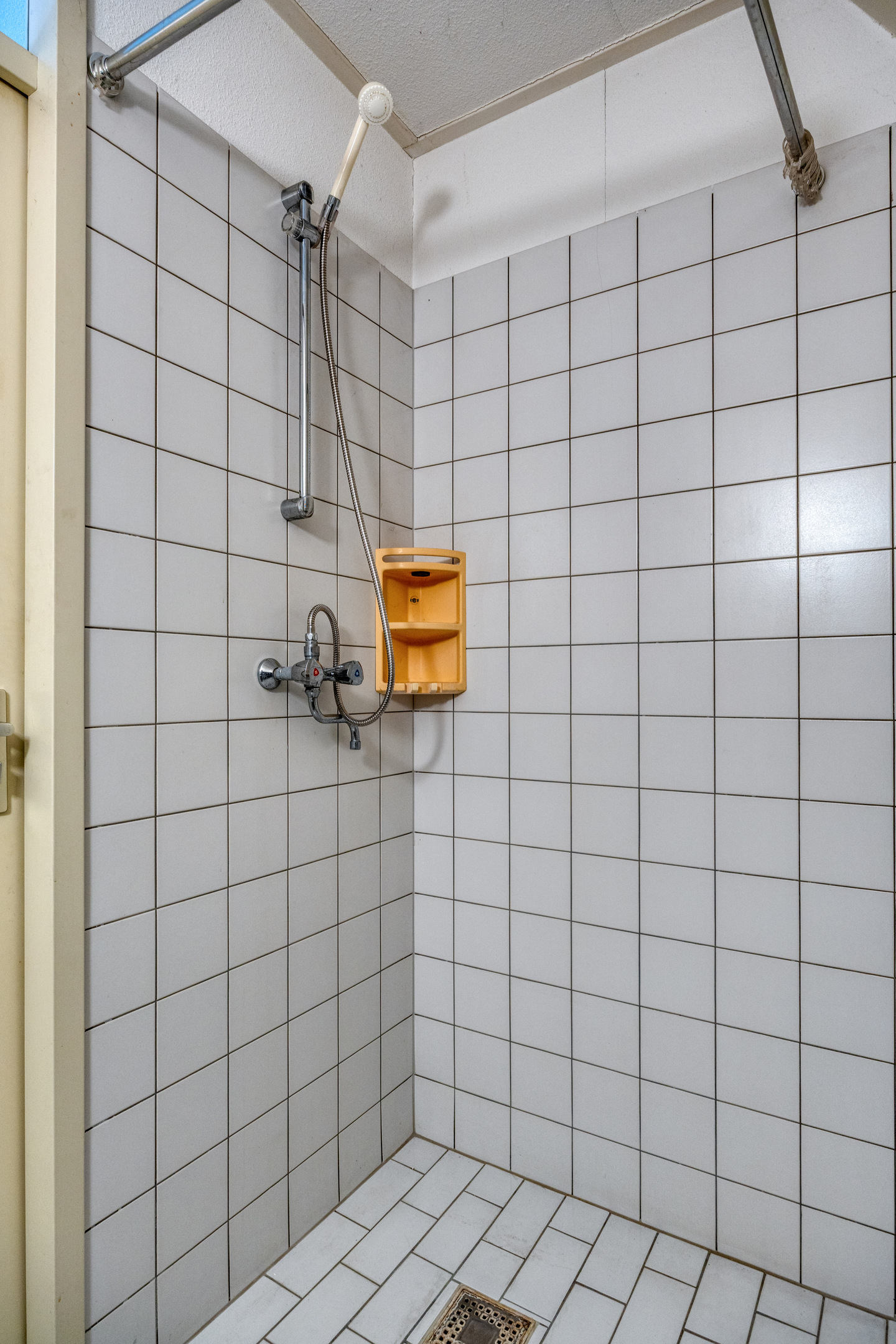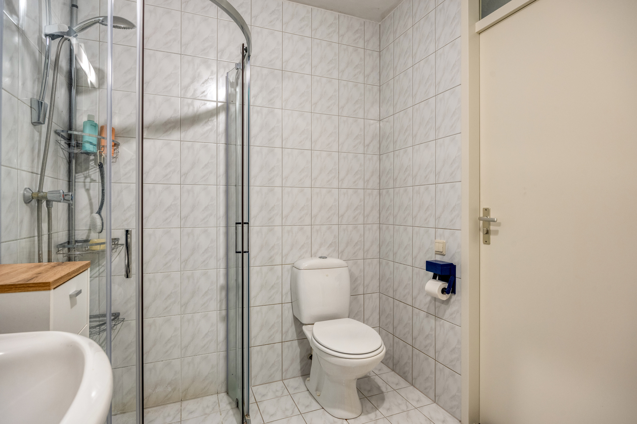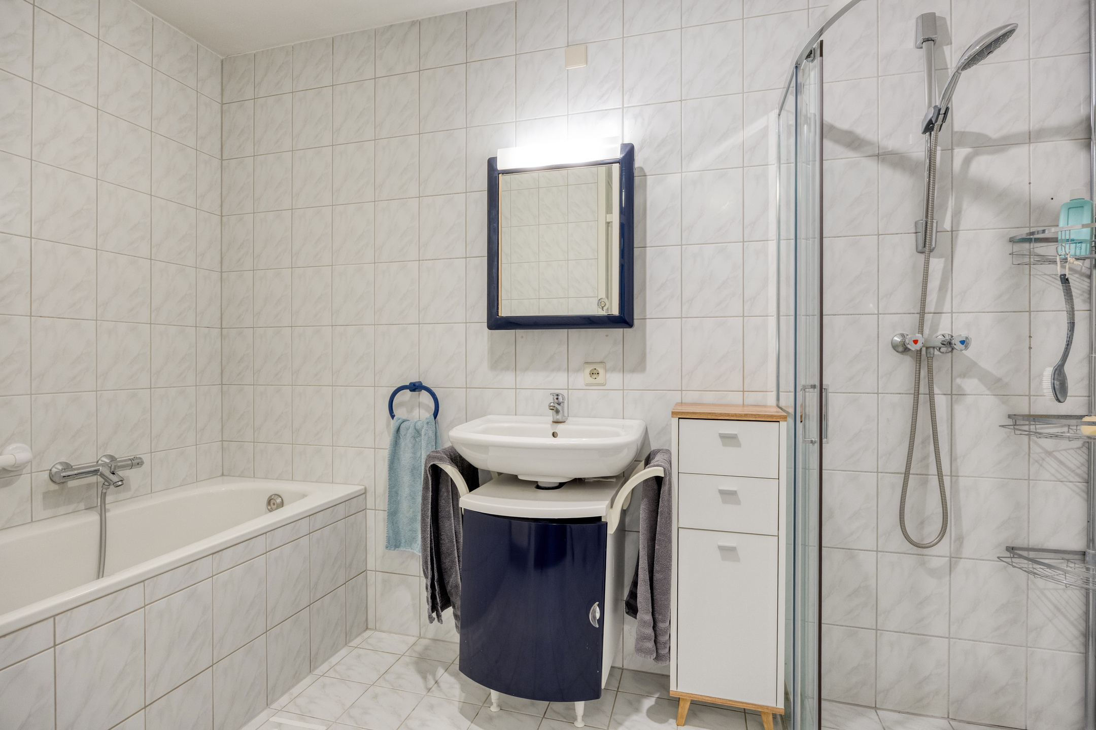 De tweede badkamer is volledig betegeld en voorzien van een douche en een wastafel.