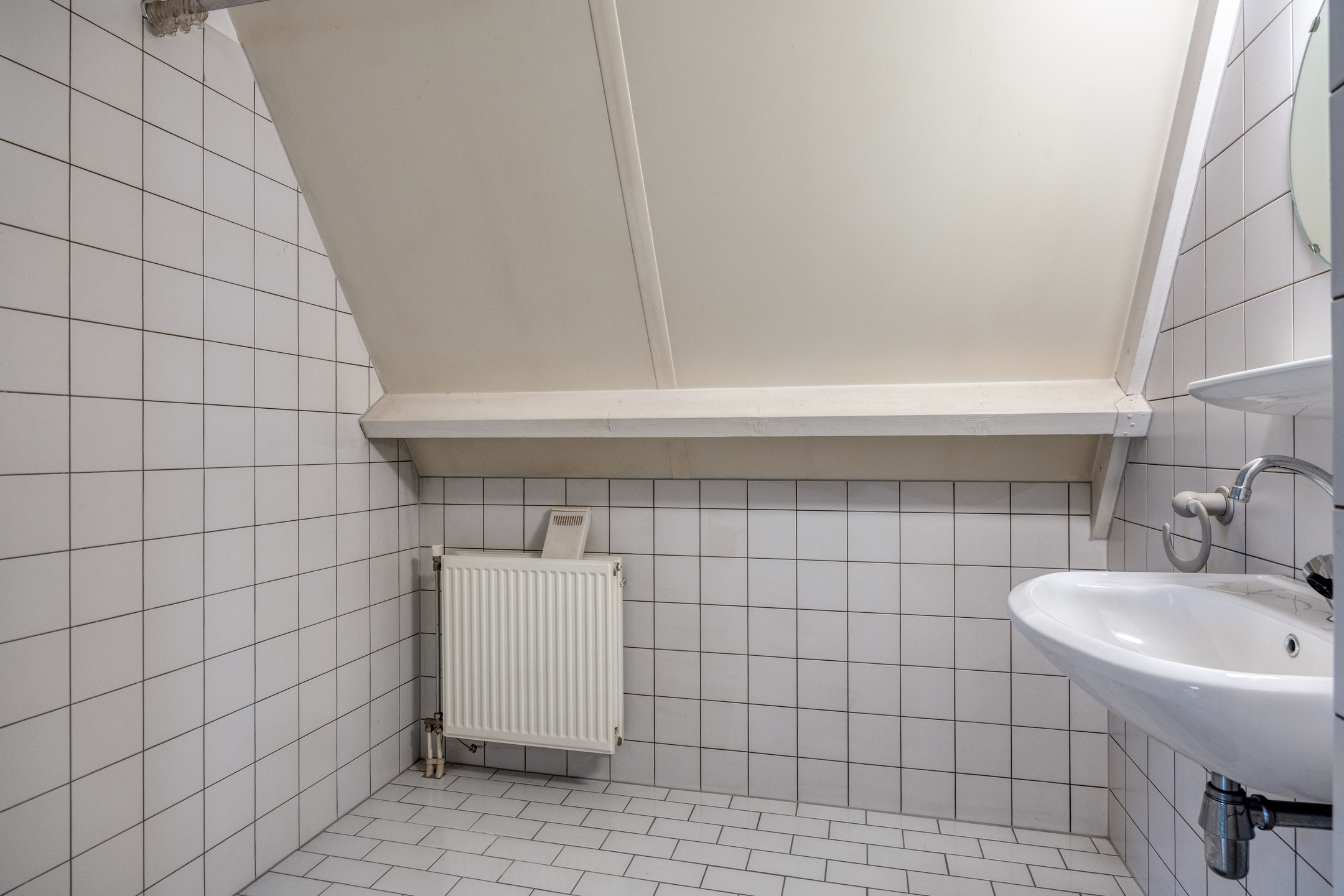 Het toilet is halfhoog betegeld en voorzien van een staand toilet en een fonteintje. De ruimte wordt geventileerd via mechanische ventilatie.