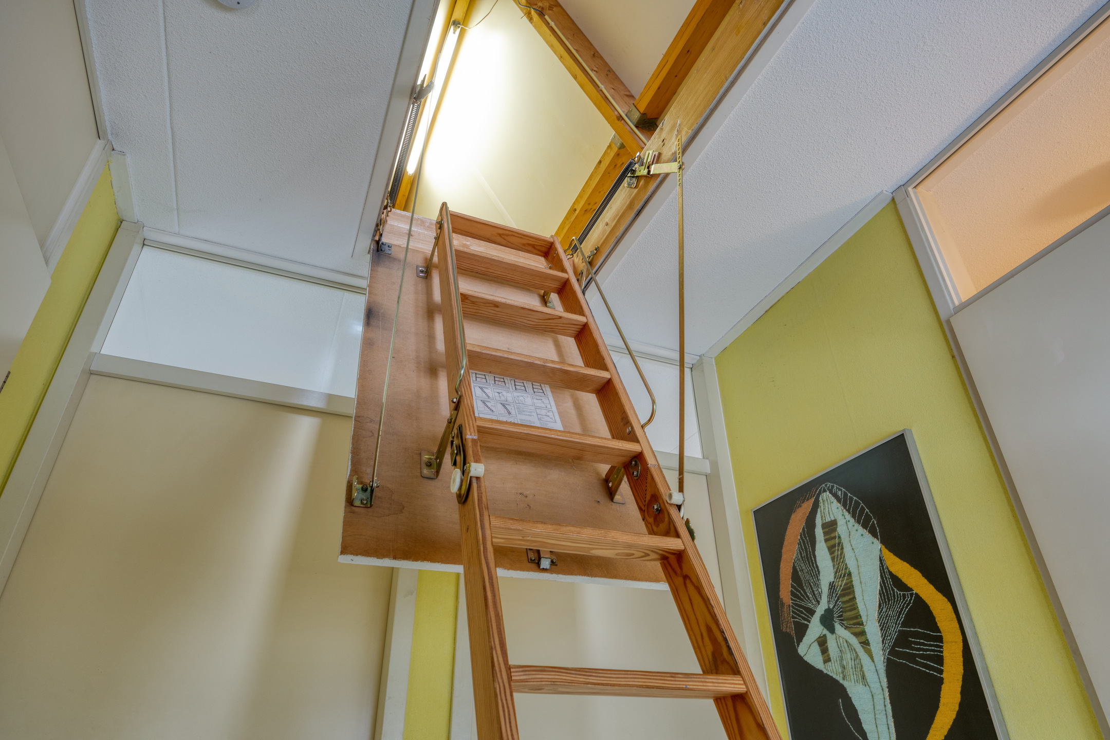Via een vlizotrap is de bergzolder bereikbaar. Hier komt daglicht binnen via glastegels in de muur. Ideaal voor extra opslag.