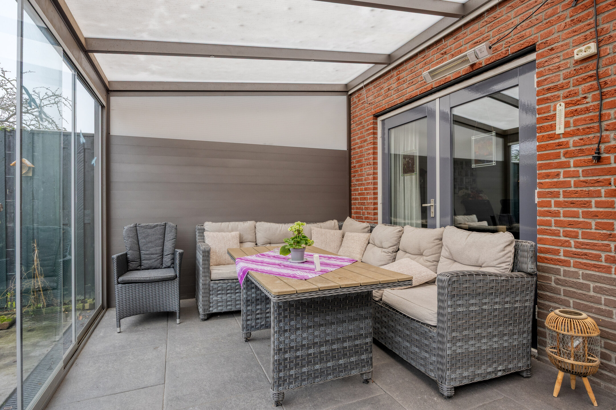 Via openslaande deuren en een loopdeur is de achtertuin bereikbaar. De aangebouwde overkapping is voorzien van ingebouwde spots, een tegelvloer en een heater. Een fijne plek voor lange avonden.