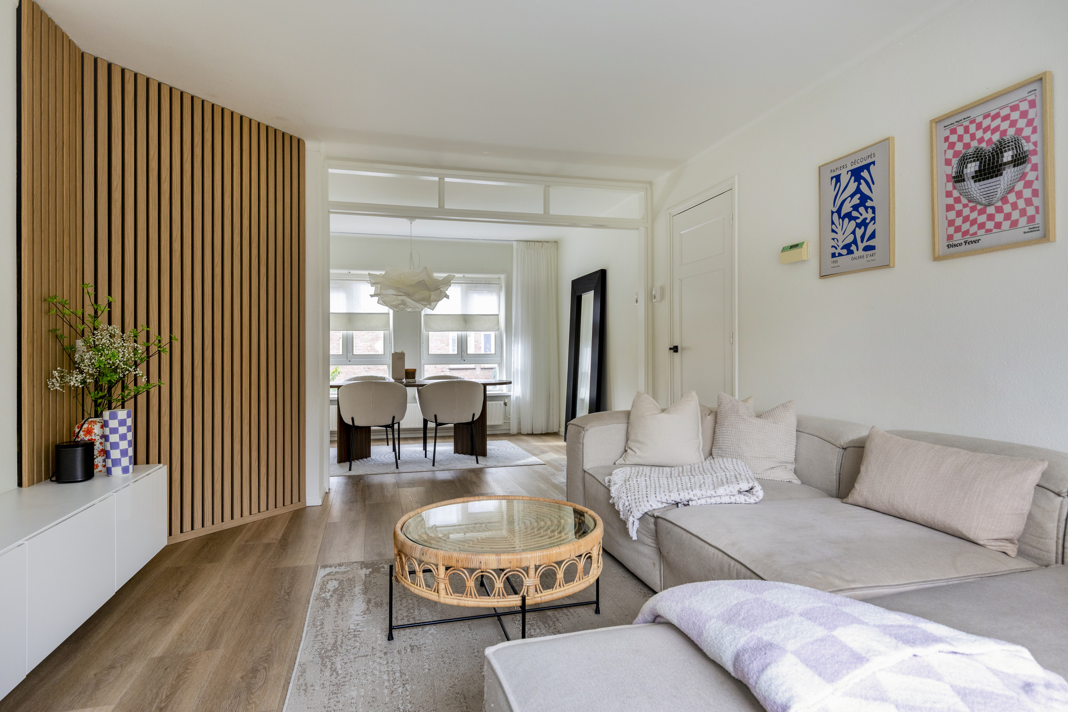 De muren zijn gestuct en voorzien van sierpanelen. Grote ramen aan de voor- en achterzijde laten veel daglicht binnen. Aan de achterkant kijk je uit op het groen en het balkon, wat de kamer een ruimtelijk gevoel geeft.