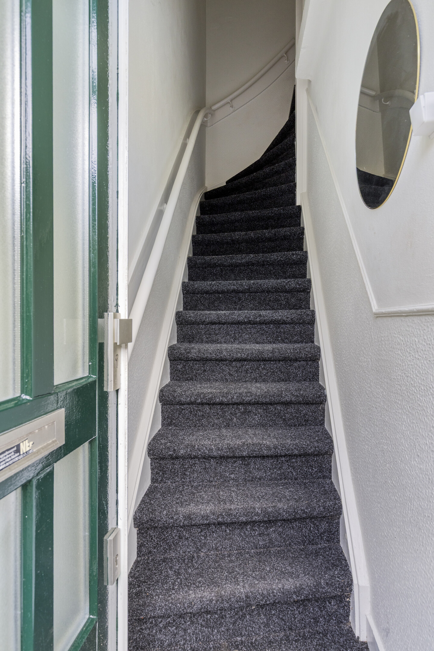 De entree maakt direct een verzorgde indruk. De trap is netjes bekleed en leidt naar de eerste verdieping.