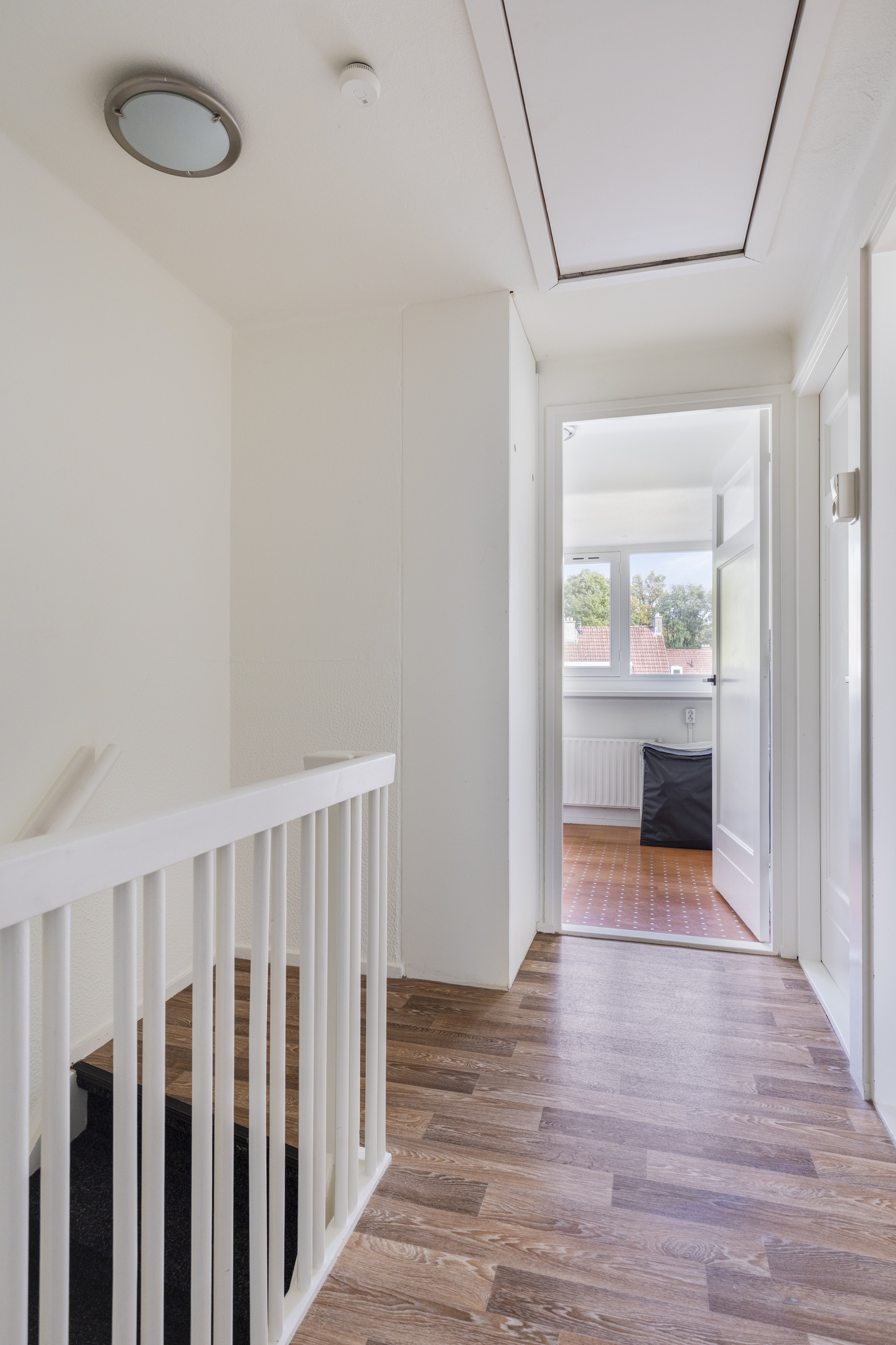 Via de trap kom je op de overloop van de eerste verdieping. Vanaf hier heb je toegang tot de woonkamer, keuken en badkamer.