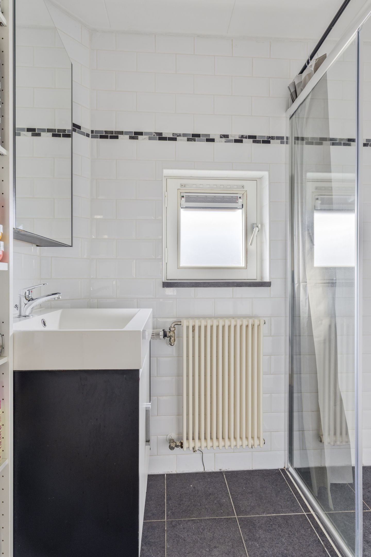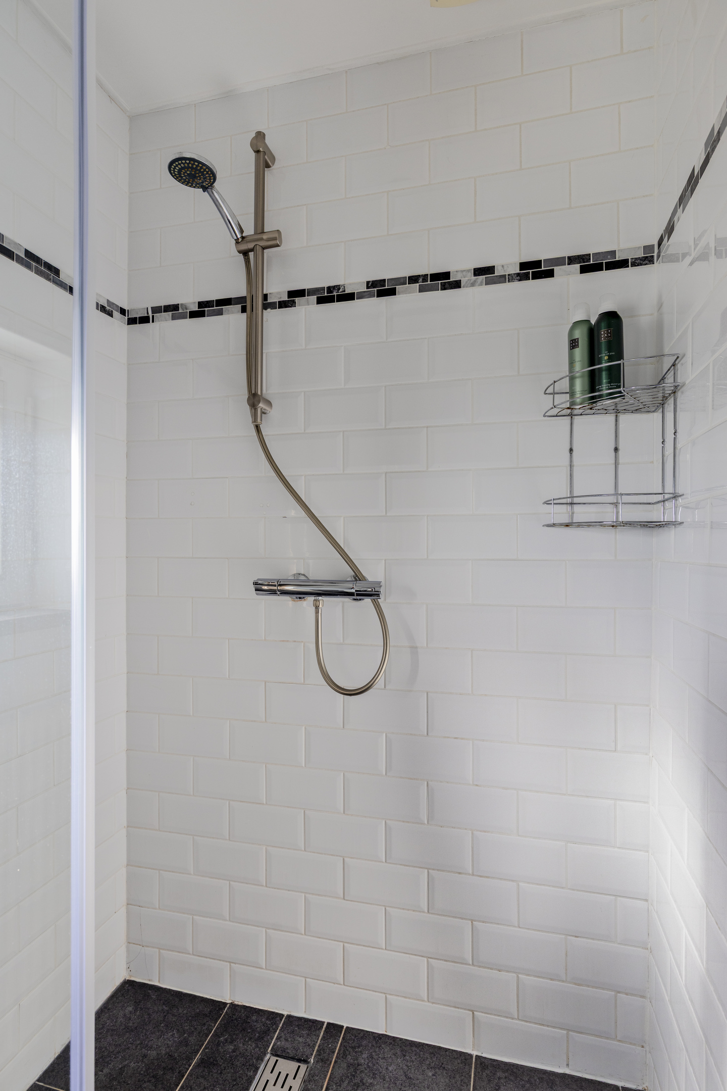 De badkamer is volledig betegeld en praktisch ingedeeld.