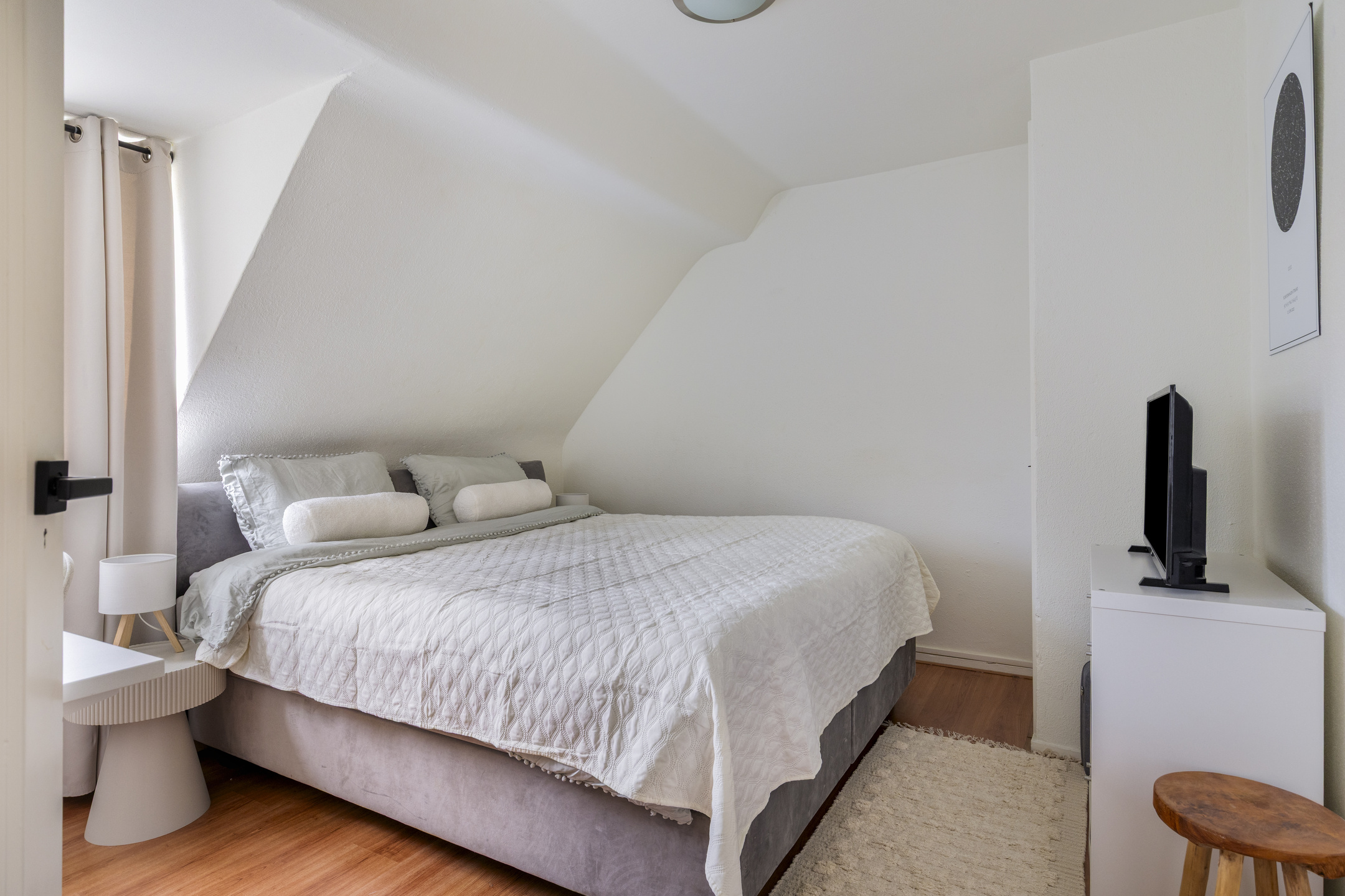 De tweede slaapkamer ligt daarnaast en heeft eveneens een dakkapel.