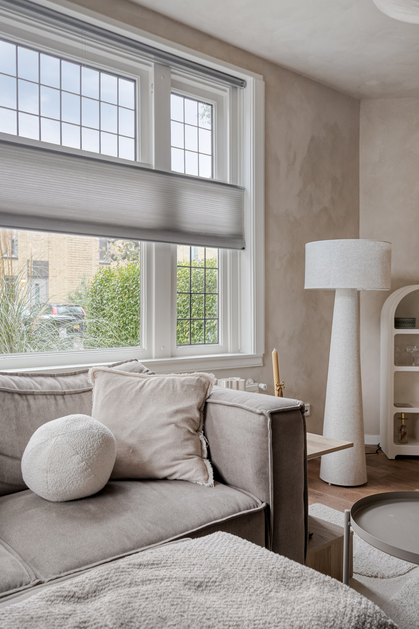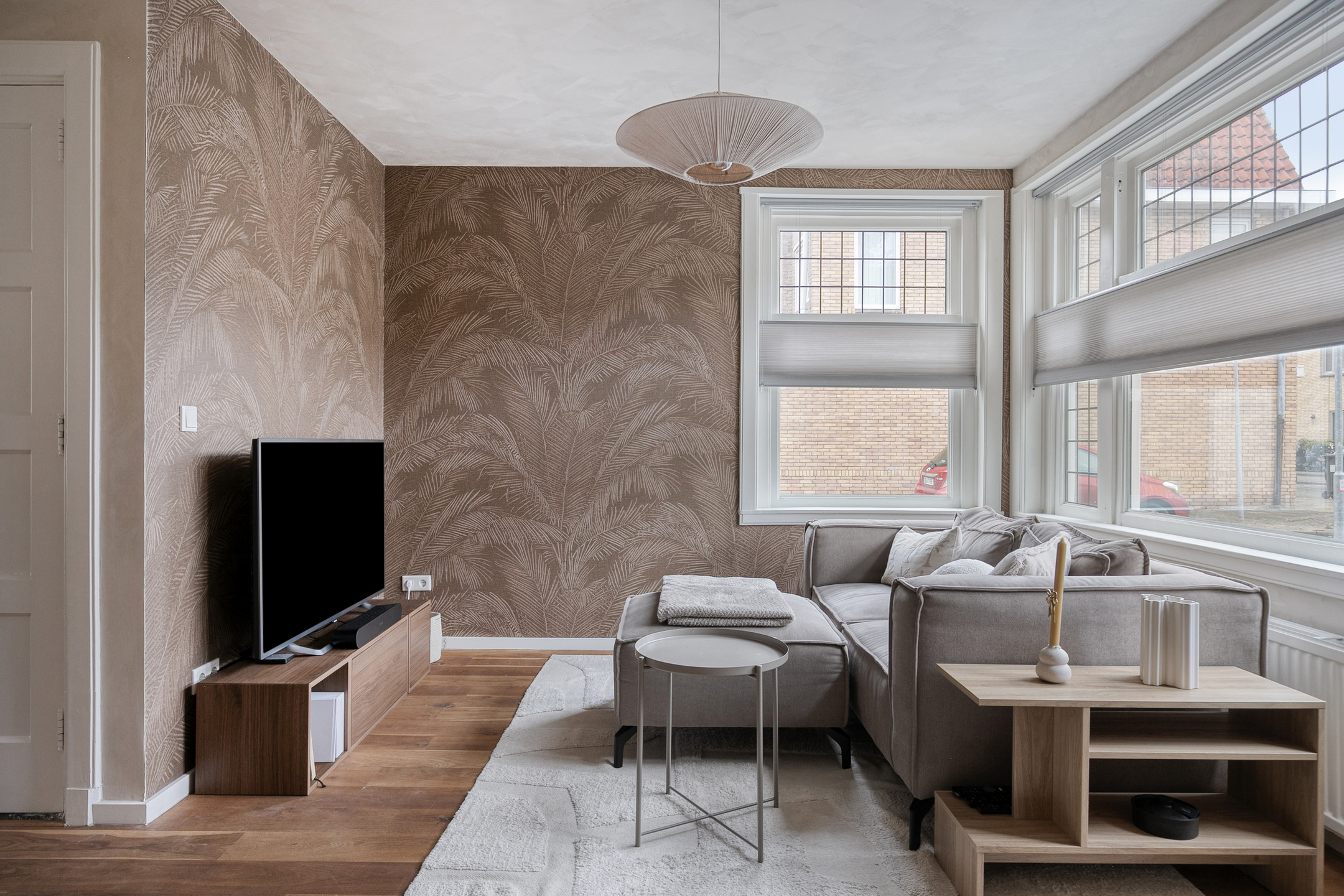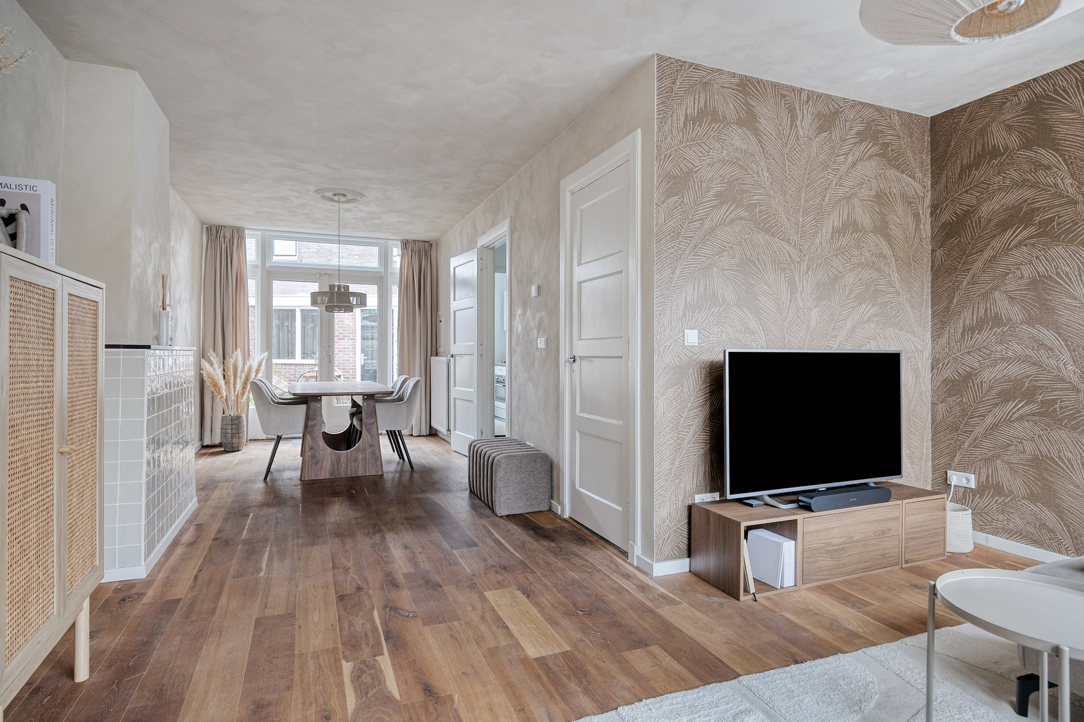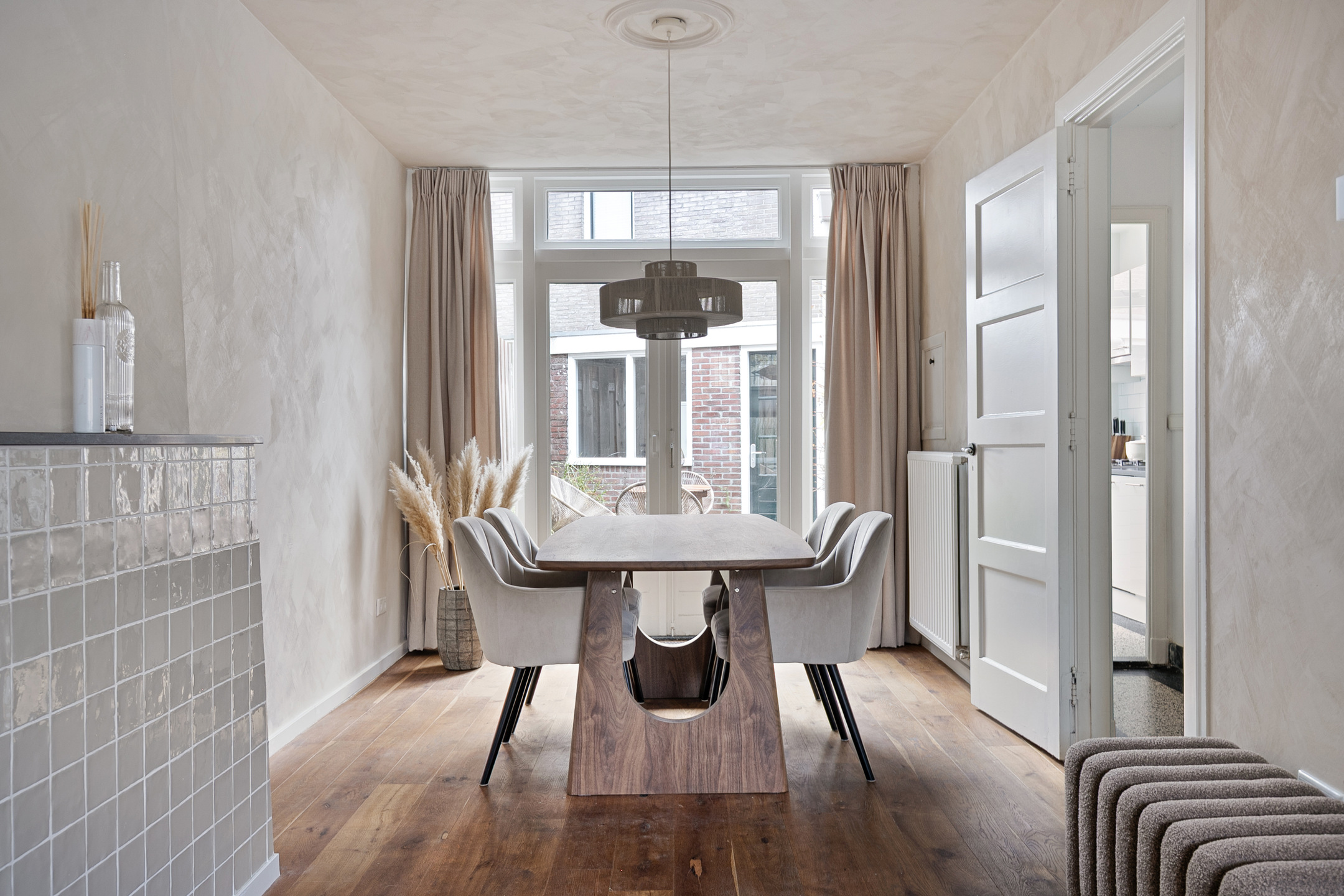 De woonkamer voelt licht en rustig aan door de ramen aan twee kanten. Aan de voorzijde is ruimte voor een zithoek, terwijl aan de achterzijde plaats is voor een eettafel. De schouw met lichte tegels zorgt voor extra sfeer. De openslaande deuren naar de tuin maken het makkelijk om binnen en buiten met elkaar te verbinden.