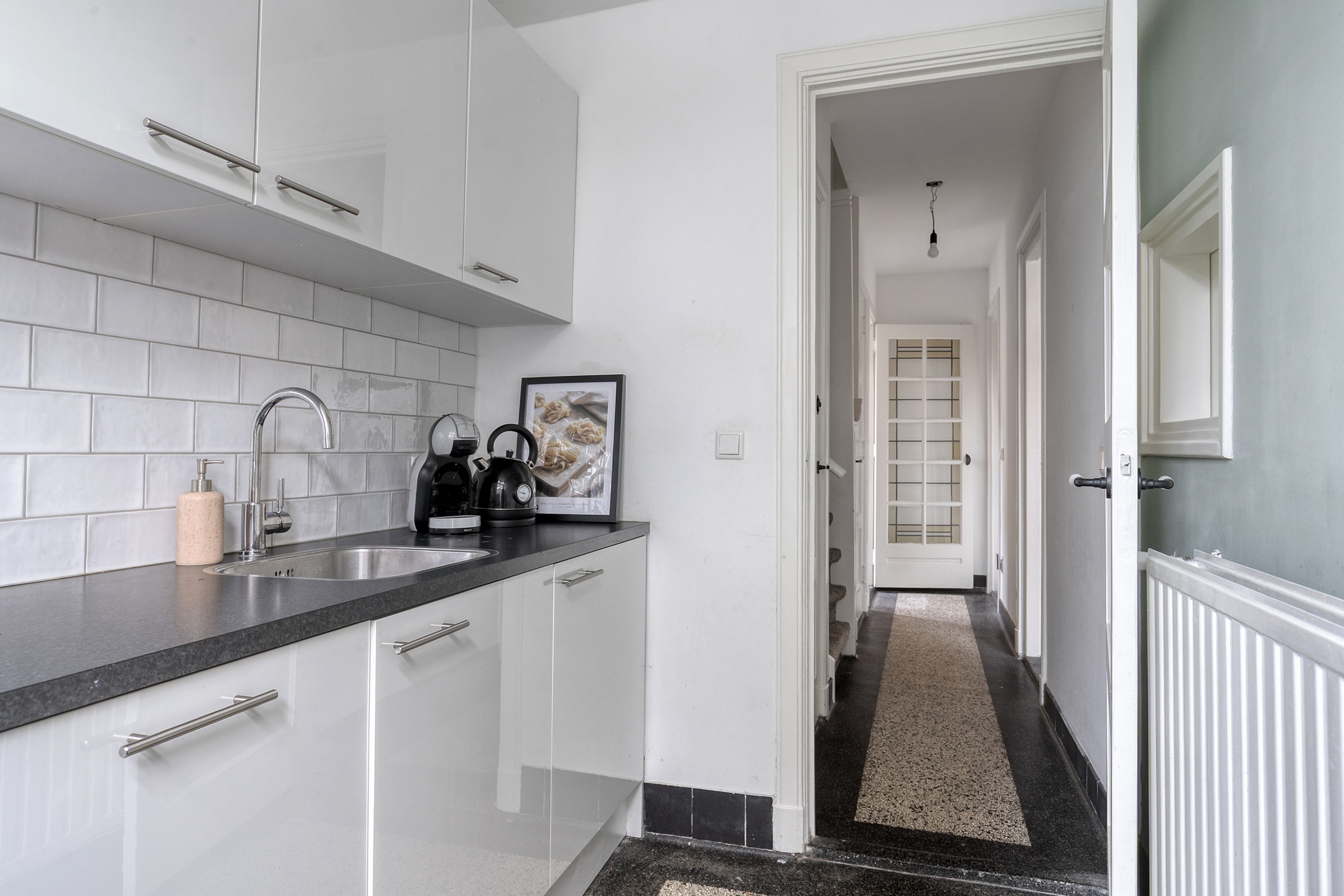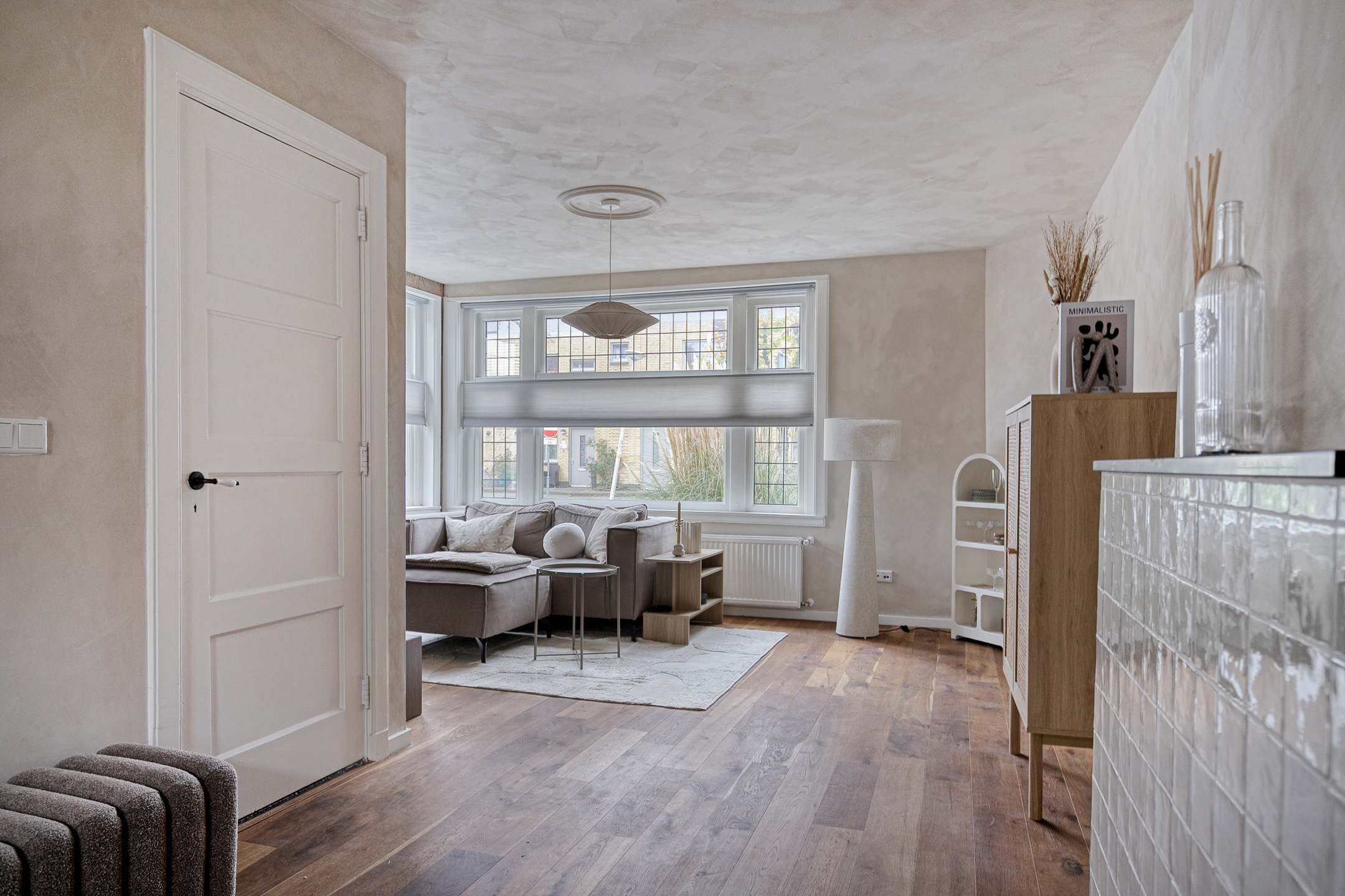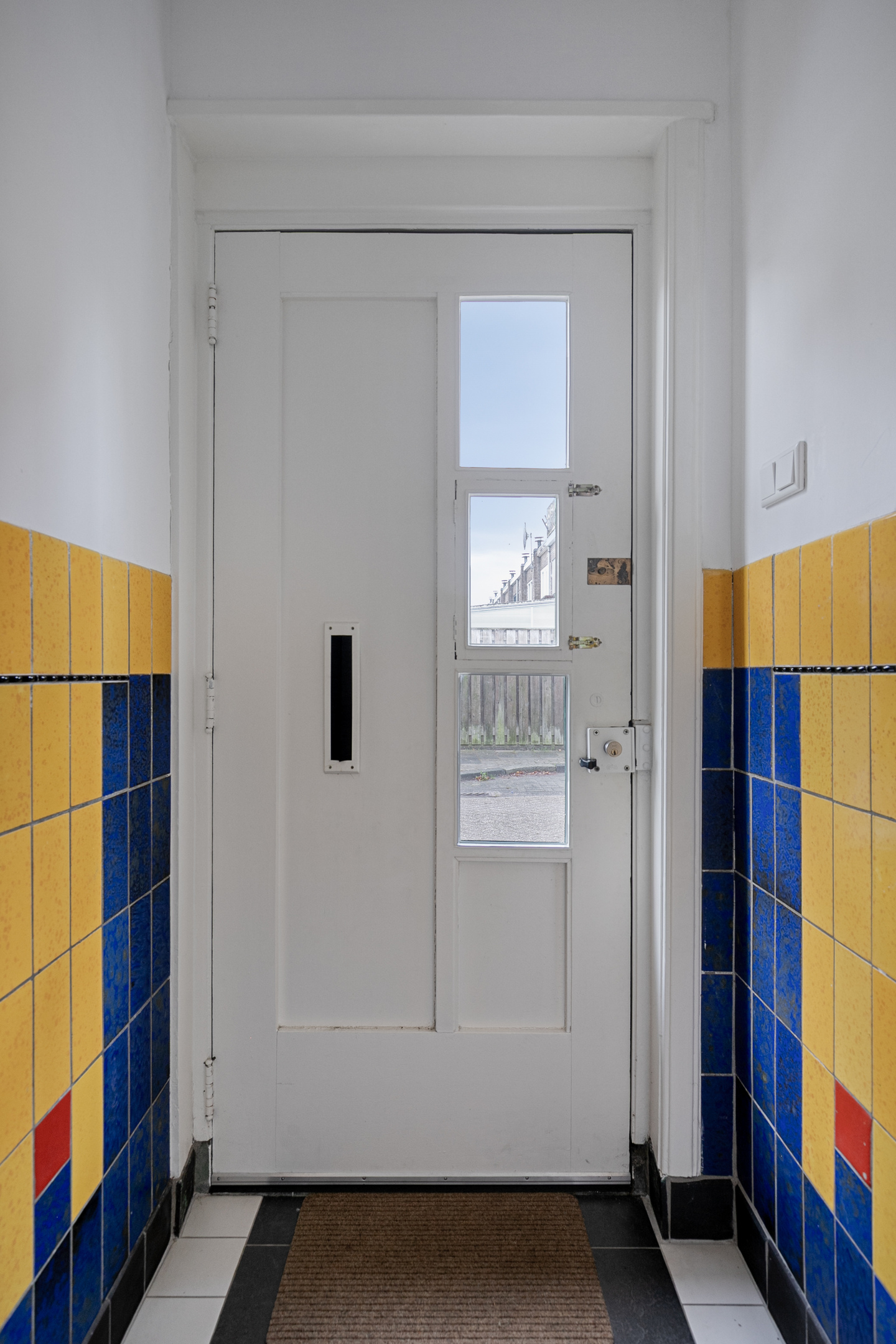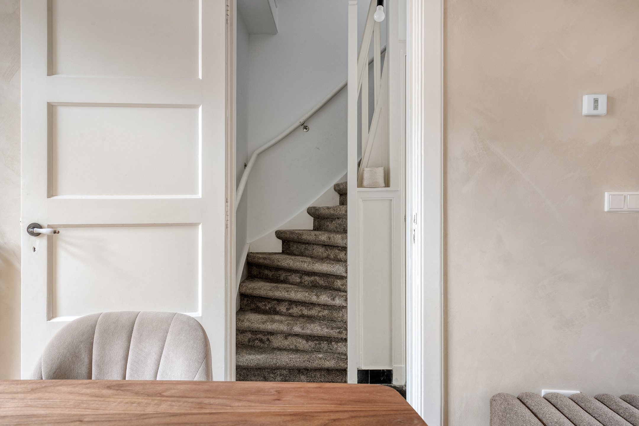 Via het tochtportaal stap je de hal in. Hier vind je de deuren naar de woonkamer, keuken, trapkast en het toilet. Op de vloer ligt terrazzo, wat de ruimte een authentieke uitstraling geeft. De trap naar de eerste verdieping is netjes bekleed.