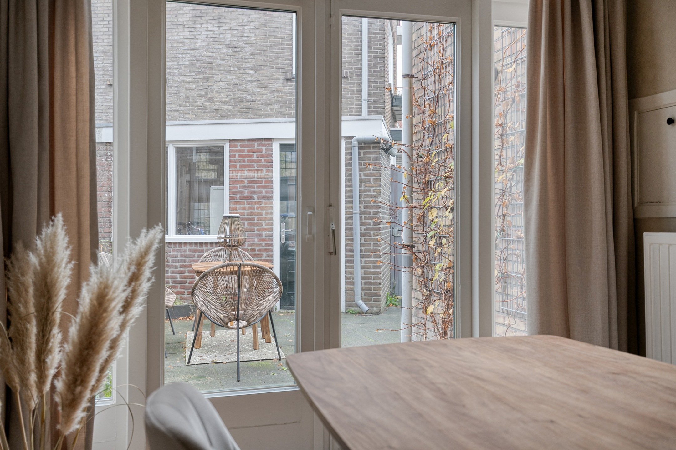 In de keuken ligt dezelfde terrazzo vloer als in de hal, wat zorgt voor een rustig geheel. De witte fronten en het donkere blad vormen een tijdloze combinatie. De keuken is voorzien van een vaatwasser, koelkast, 4-pits gaskookplaat en hoge kastjes voor extra bergruimte. Via de deur naar buiten loop je gemakkelijk naar de tuin, wat handig is voor je fiets. Het doorgeefluik zorgt voor contact met de eethoek in de woonkamer.