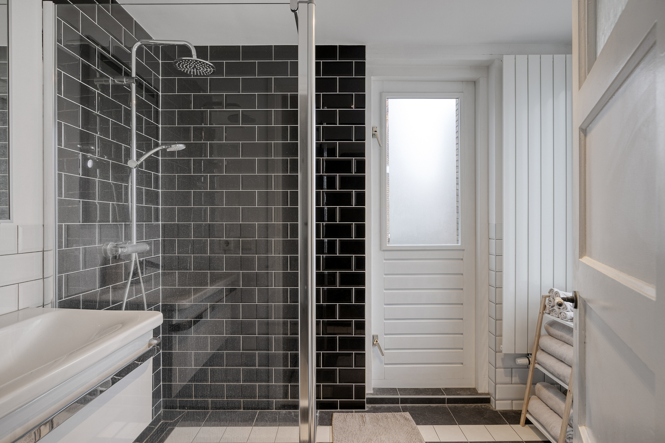 Het toilet is halfhoog betegeld en heeft een wandcloset, fonteintje en een raam dat voor natuurlijke ventilatie zorgt. De moderne tegel op de vloer maakt het geheel netjes af.