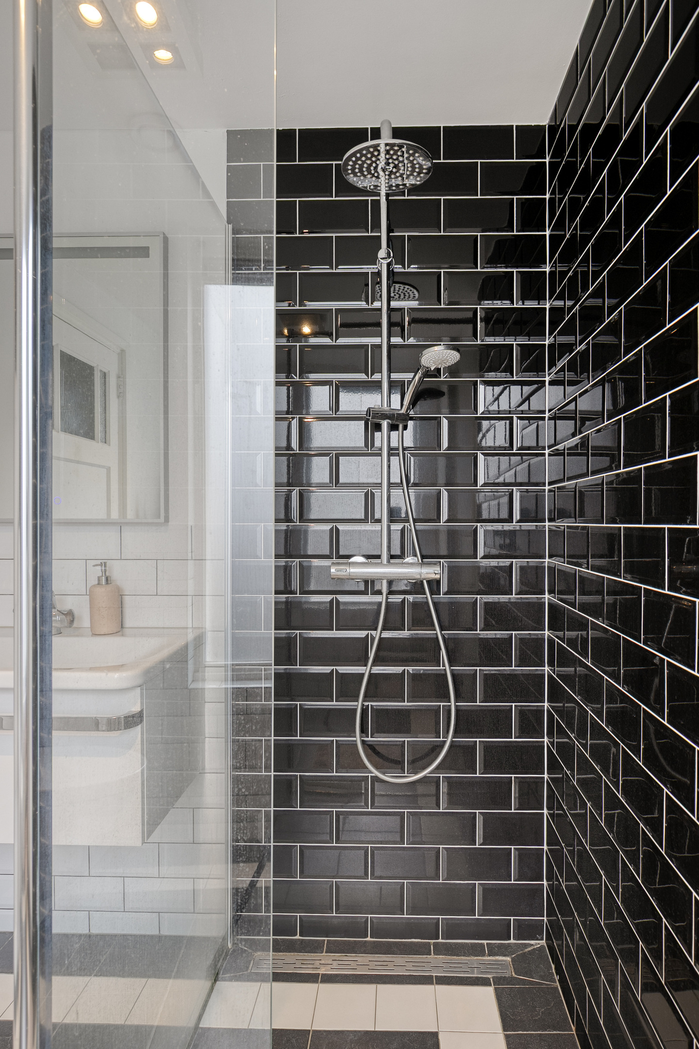 De badkamer is volledig betegeld en voorzien van een inloopdouche, wandcloset en wastafelmeubel. Via de deur stap je zo het balkon op. De mechanische ventilatie en het raam zorgen voor frisse lucht.