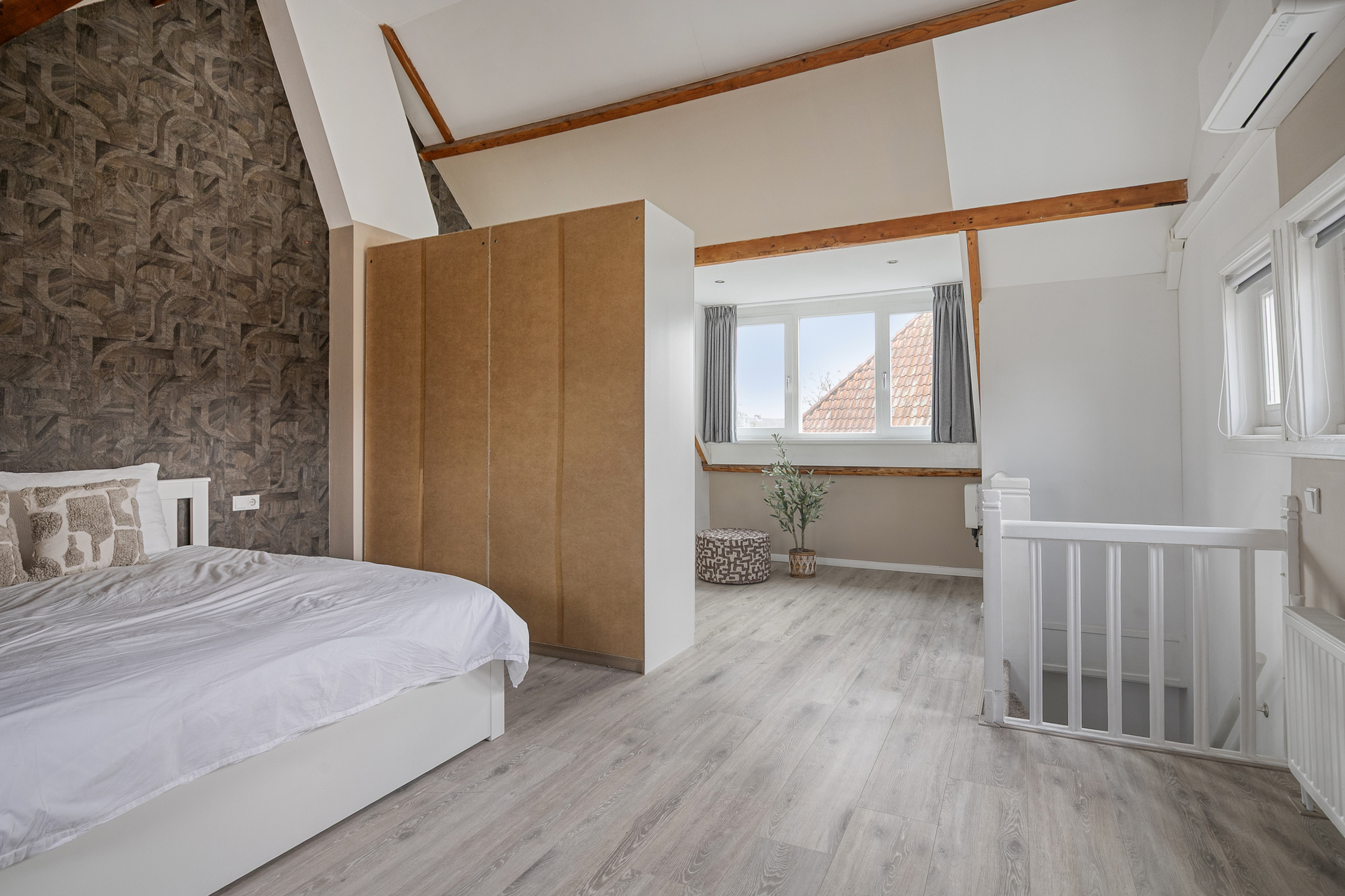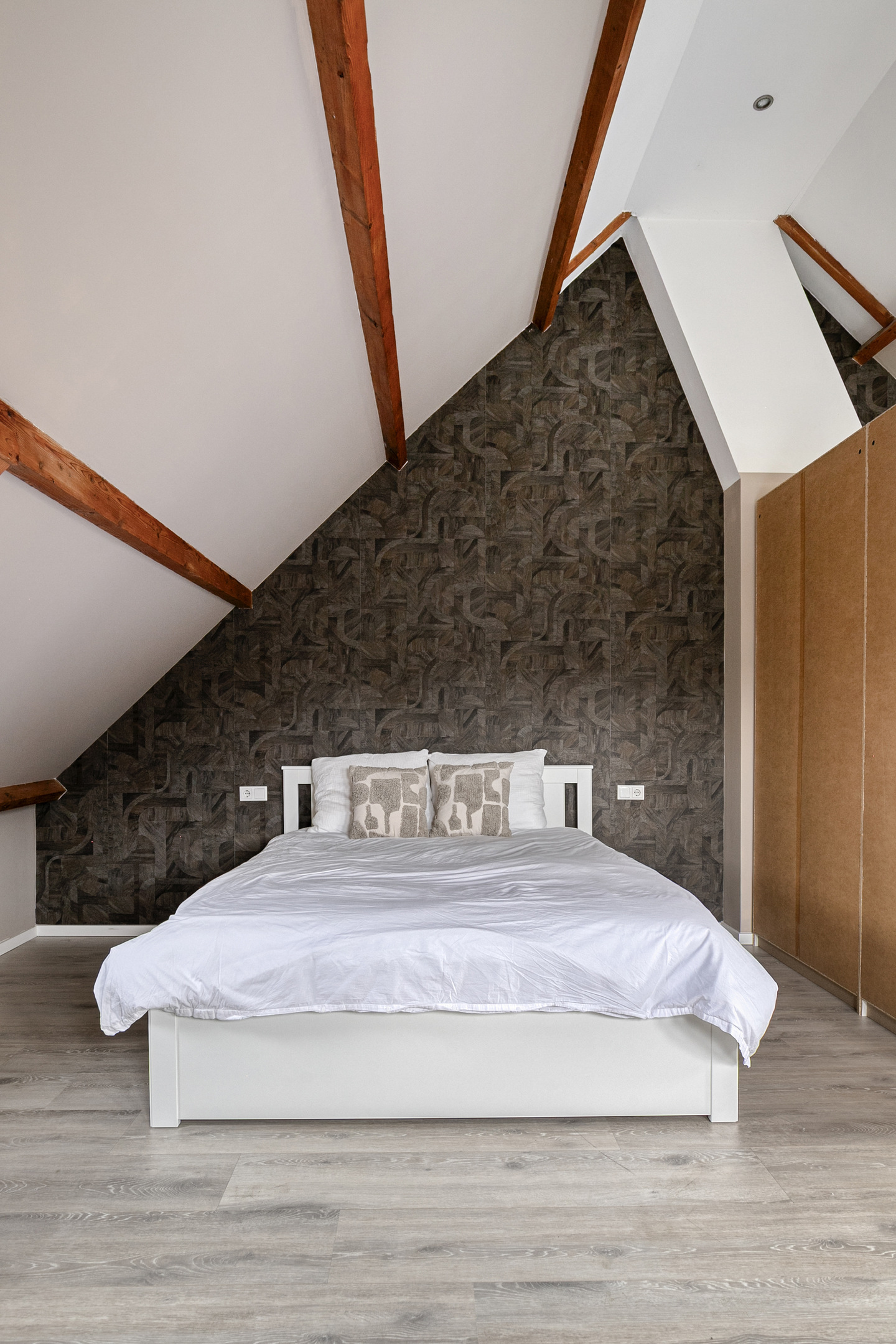 De vaste trap brengt je naar de ruime zolder, die dienst kan doen als vierde slaapkamer of als werk- of hobbyruimte. De omvormer voor de 8 zonnepanelen, de Intergas HRE-ketel uit 2024 en de Fujitsu airco staan hier opgesteld. De ramen aan drie kanten zorgen voor veel licht en door de hoogte tot aan de nok voelt deze verdieping extra ruim aan.