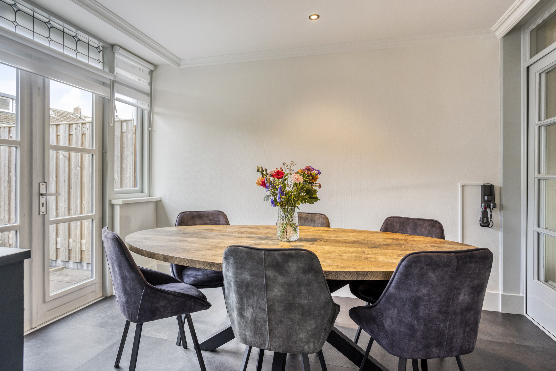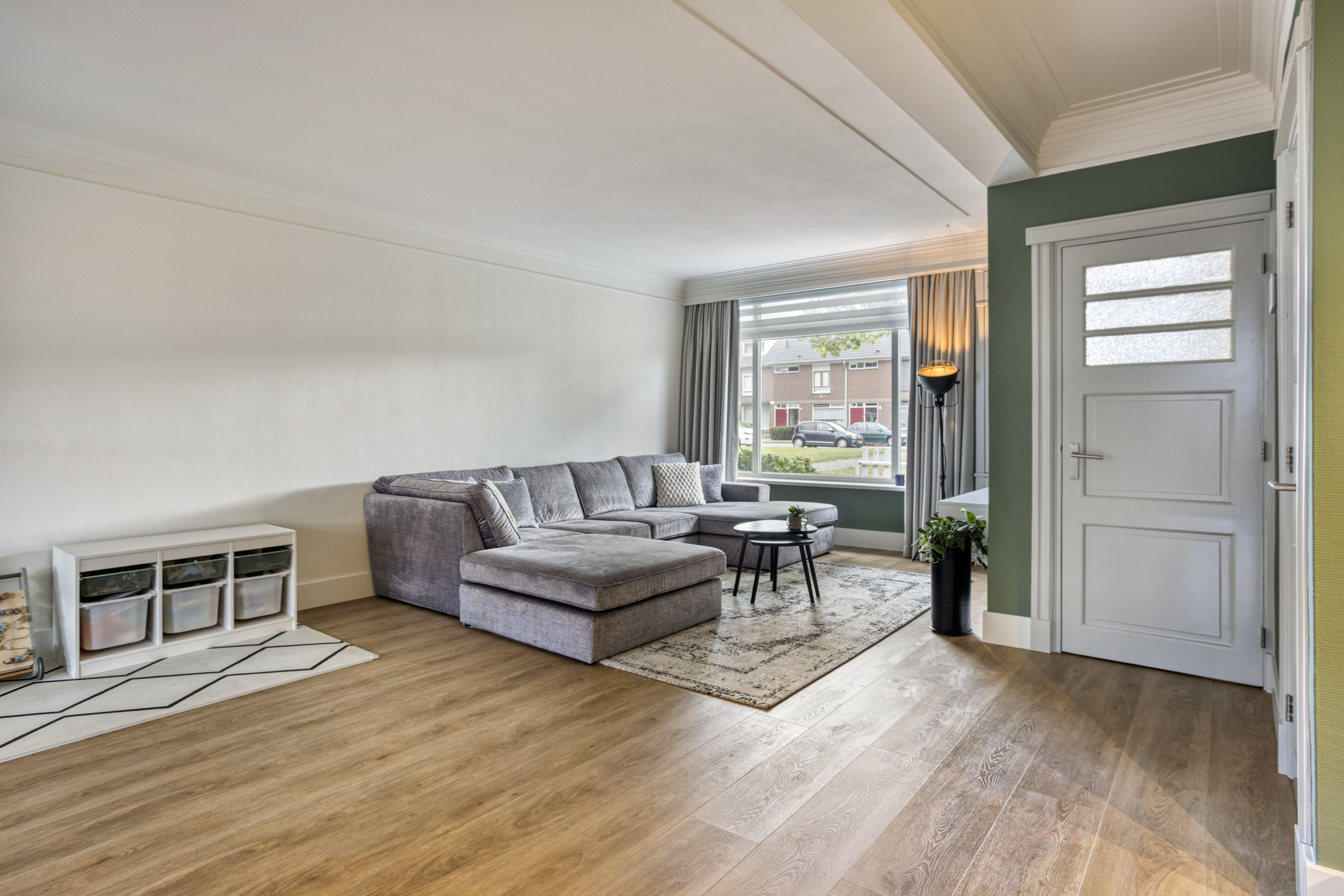 De woonkamer is het hart van het huis: een plek waar licht en ruimte samenkomen. Het grote raam aan de voorzijde laat veel daglicht binnen en geeft uitzicht op de straat. De pvc vloer in houtmotief en de sierlijsten aan het plafond geven een warme en nette uitstraling. Handige details zoals de trapkast, schuifdeuren en ingebouwde kast zorgen voor sfeer én extra bergruimte. Er is ruimte genoeg voor een grote zithoek om samen te ontspannen en een royale eettafel om uitgebreid te tafelen.