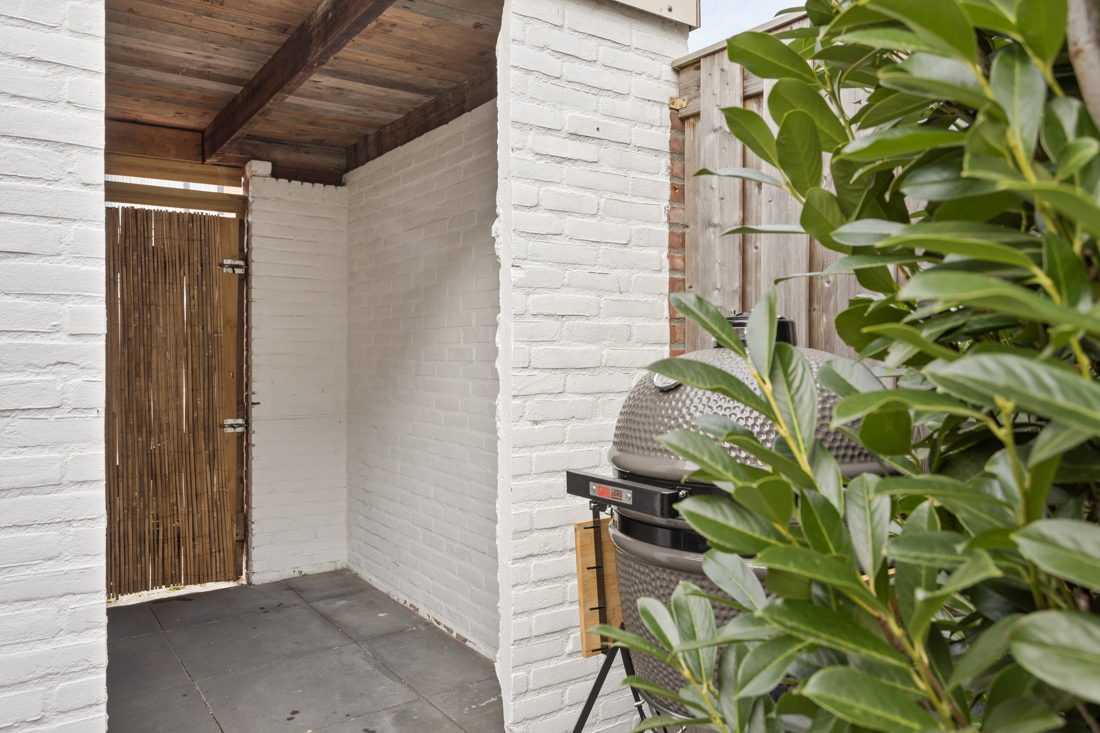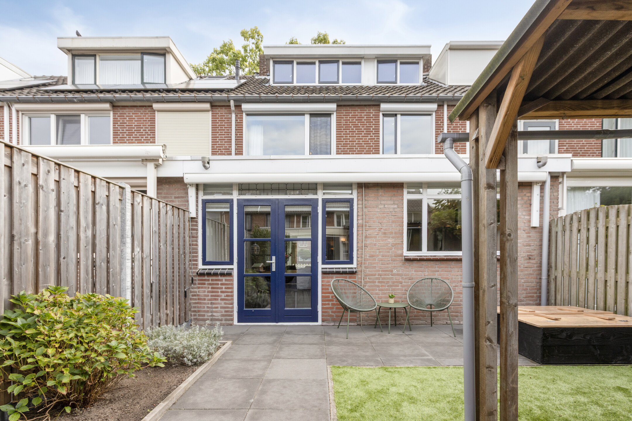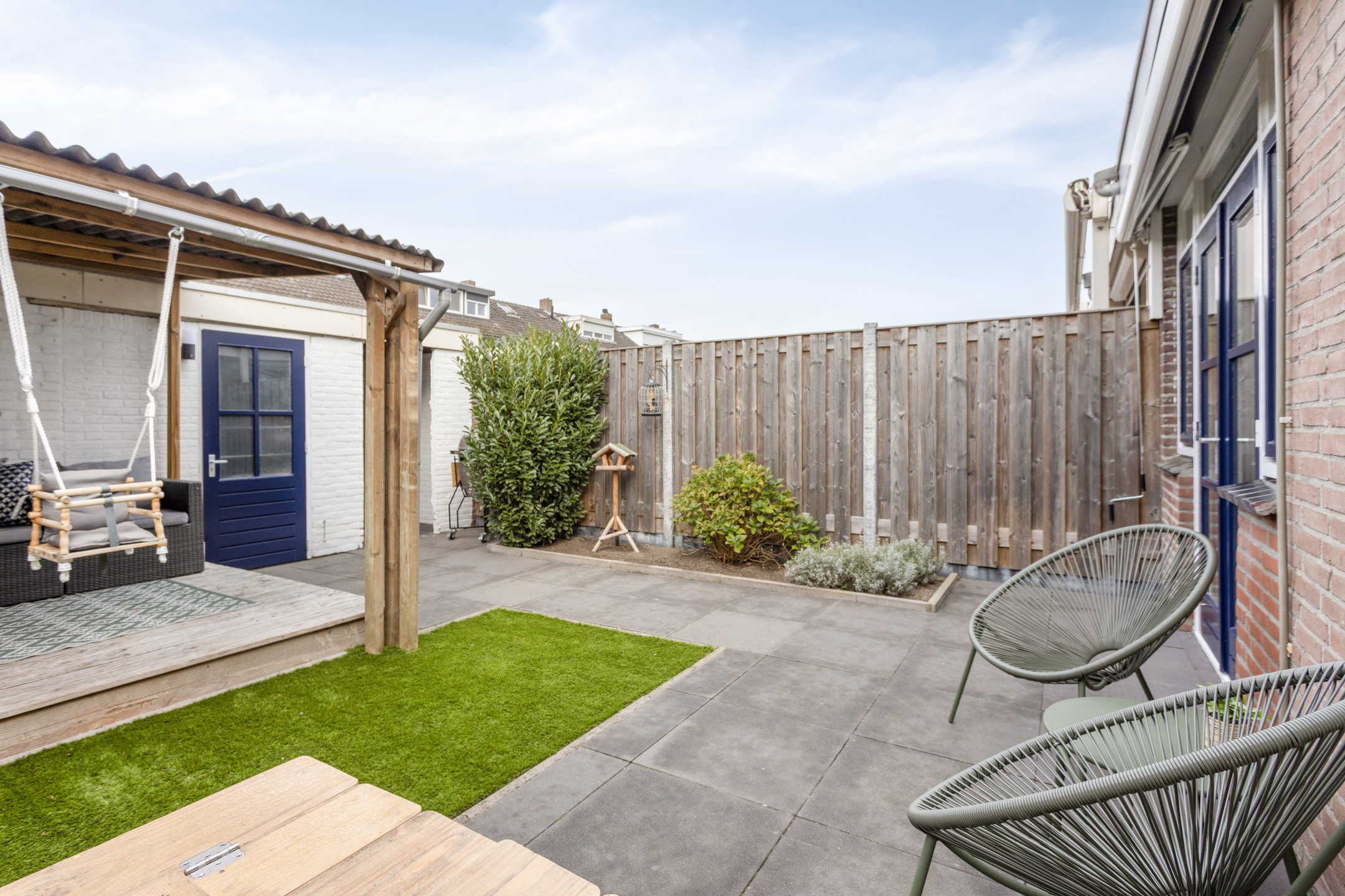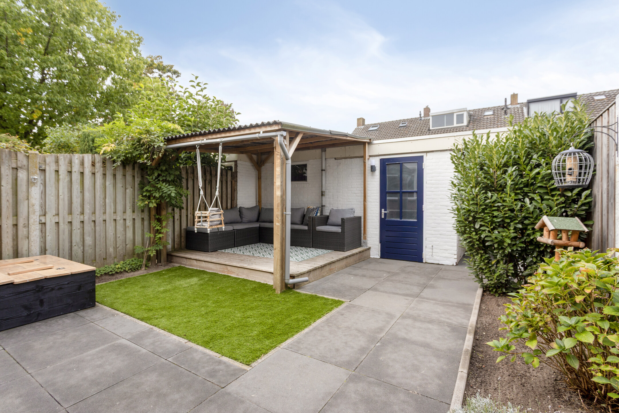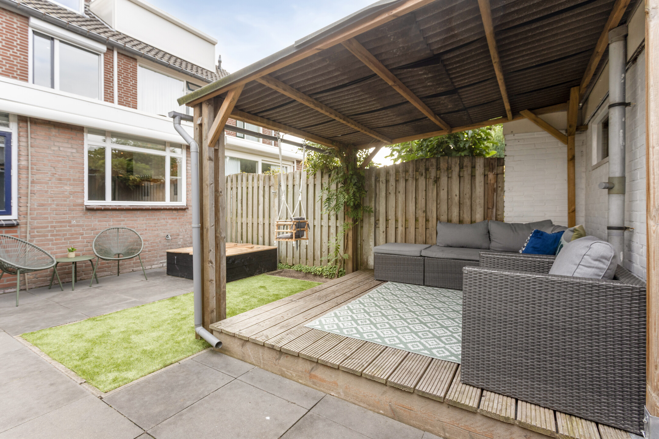 Achtertuin met terras, overkapping, stenen berging en achterom