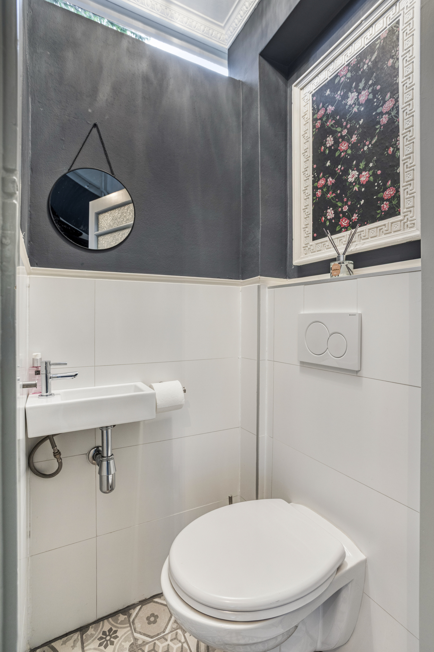 Het toilet is praktisch en fris met een fonteintje, tegelvloer en een raam voor ventilatie.
