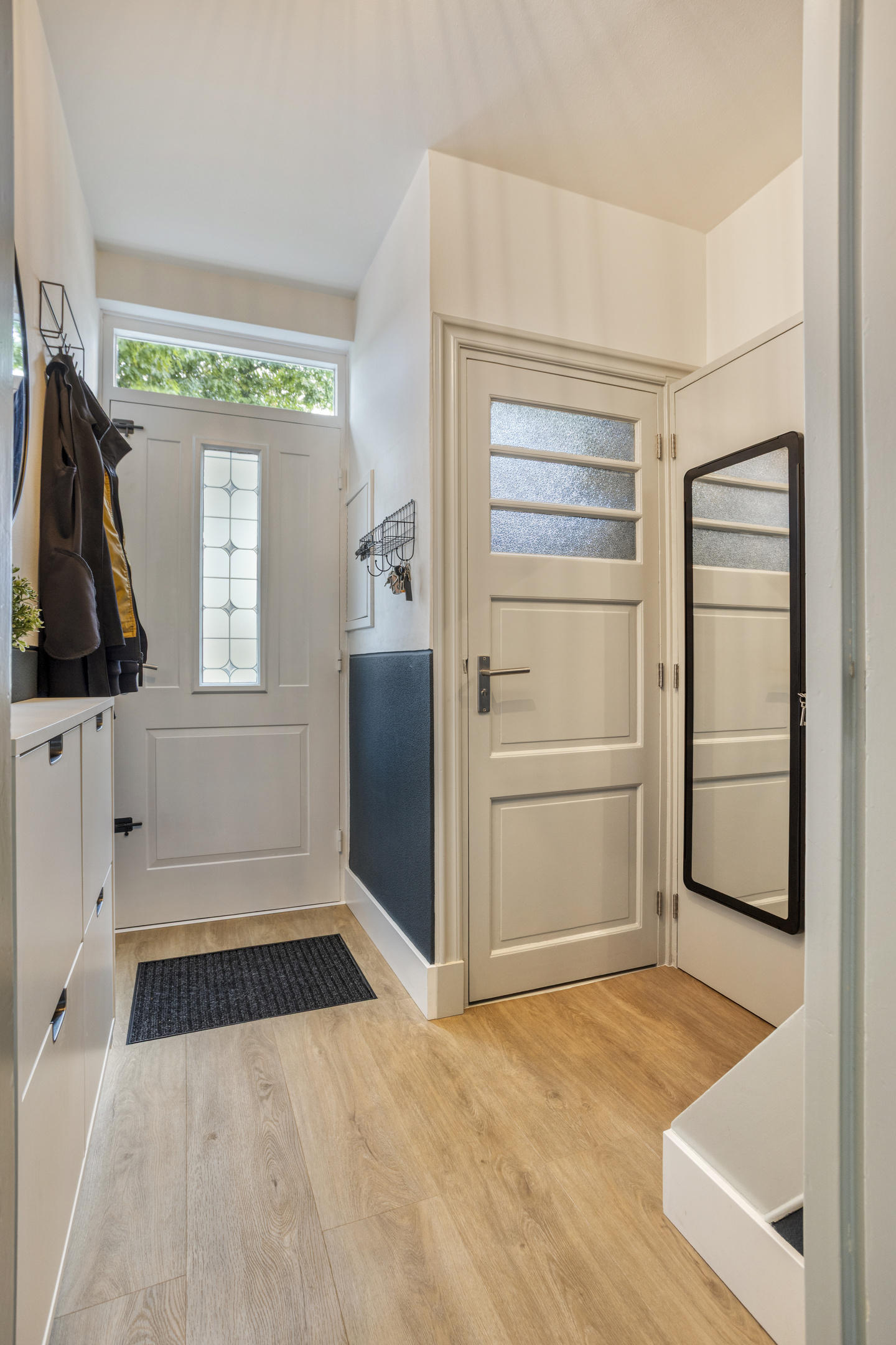 De entree geeft meteen een verzorgde indruk. Vanaf hier heb je toegang tot de woonkamer, het toilet, de trap naar boven en de meterkast. De pvc vloer met vloerverwarming zorgt voor een nette uitstraling en loopt mooi door.