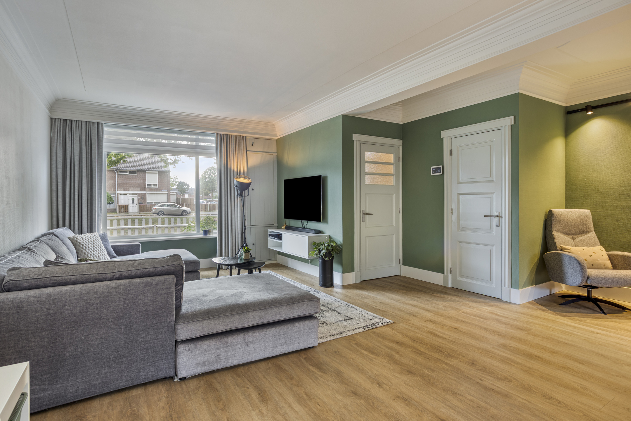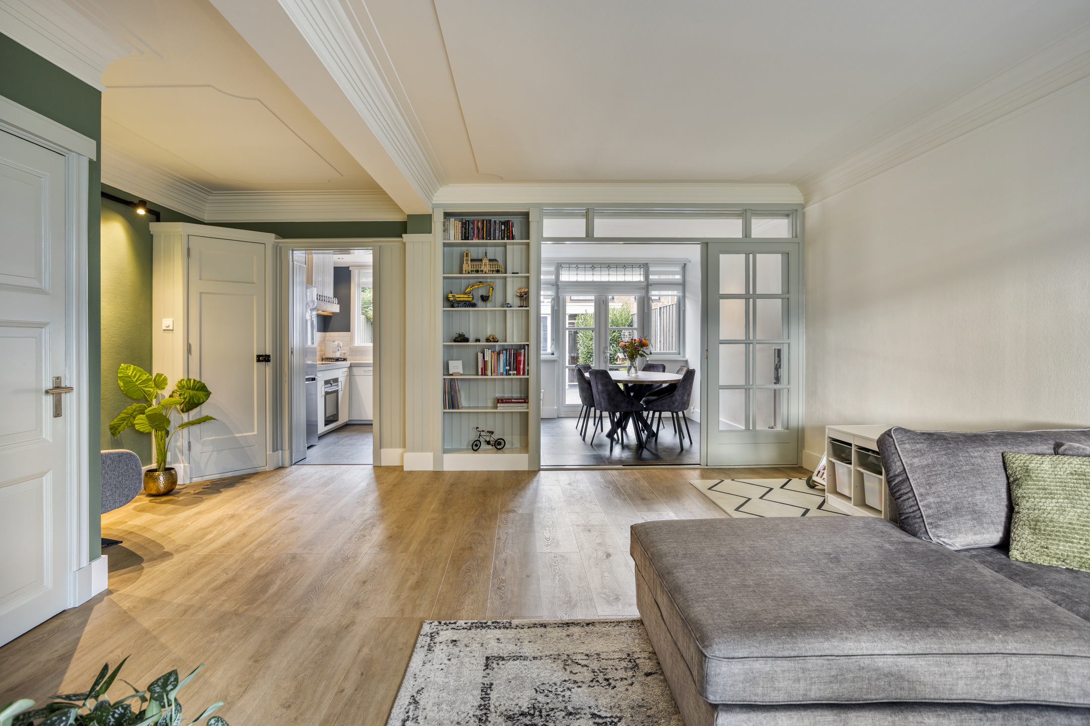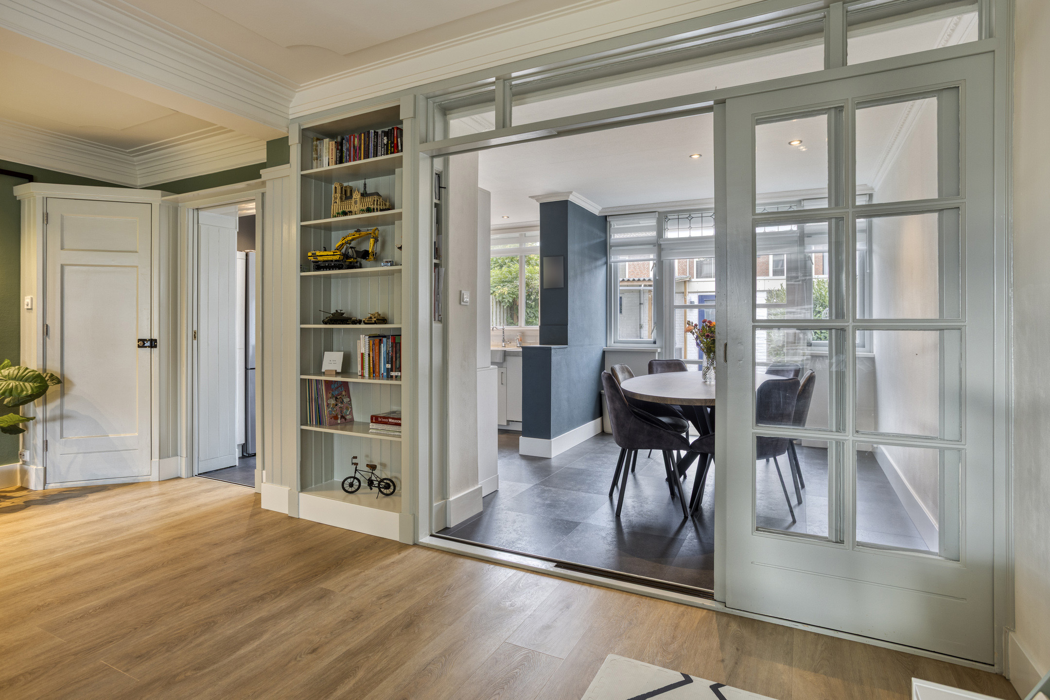 Lichte woonkamer met schuifdeuren en handige bergruimte