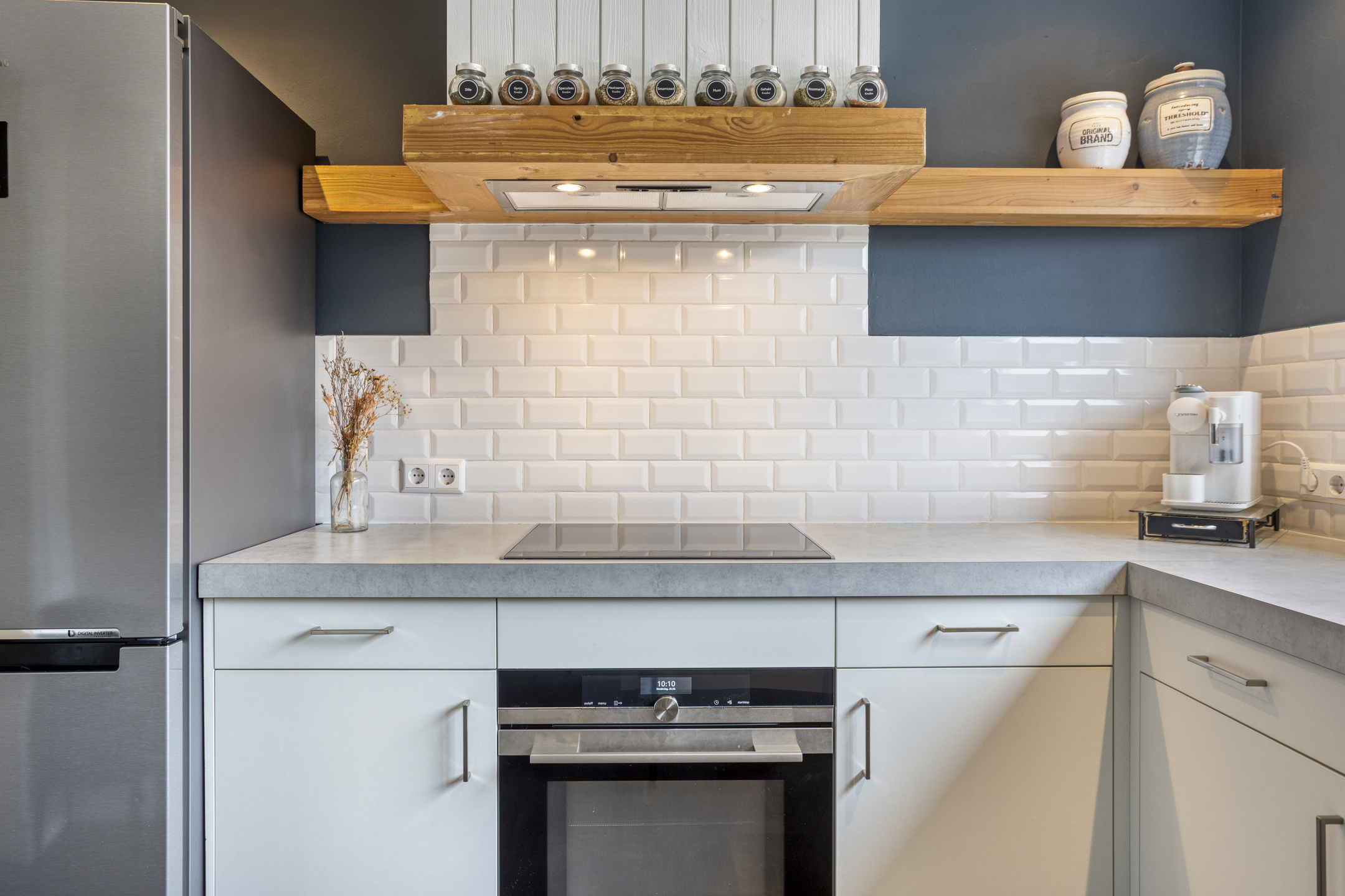 Via een schuifdeur kom je in de keuken. Hier kook je met plezier: een nette witte inrichting met inductiekookplaat, oven, afzuigkap en inbouwspots. Terwijl je staat te koken, kijk je uit op de tuin. Aan de andere kant is er plek voor een gezellige eettafel, ideaal voor ontbijt of een snelle kop koffie. En met de openslaande deuren naar de achtertuin verleng je het woongedeelte op mooie dagen naar buiten.