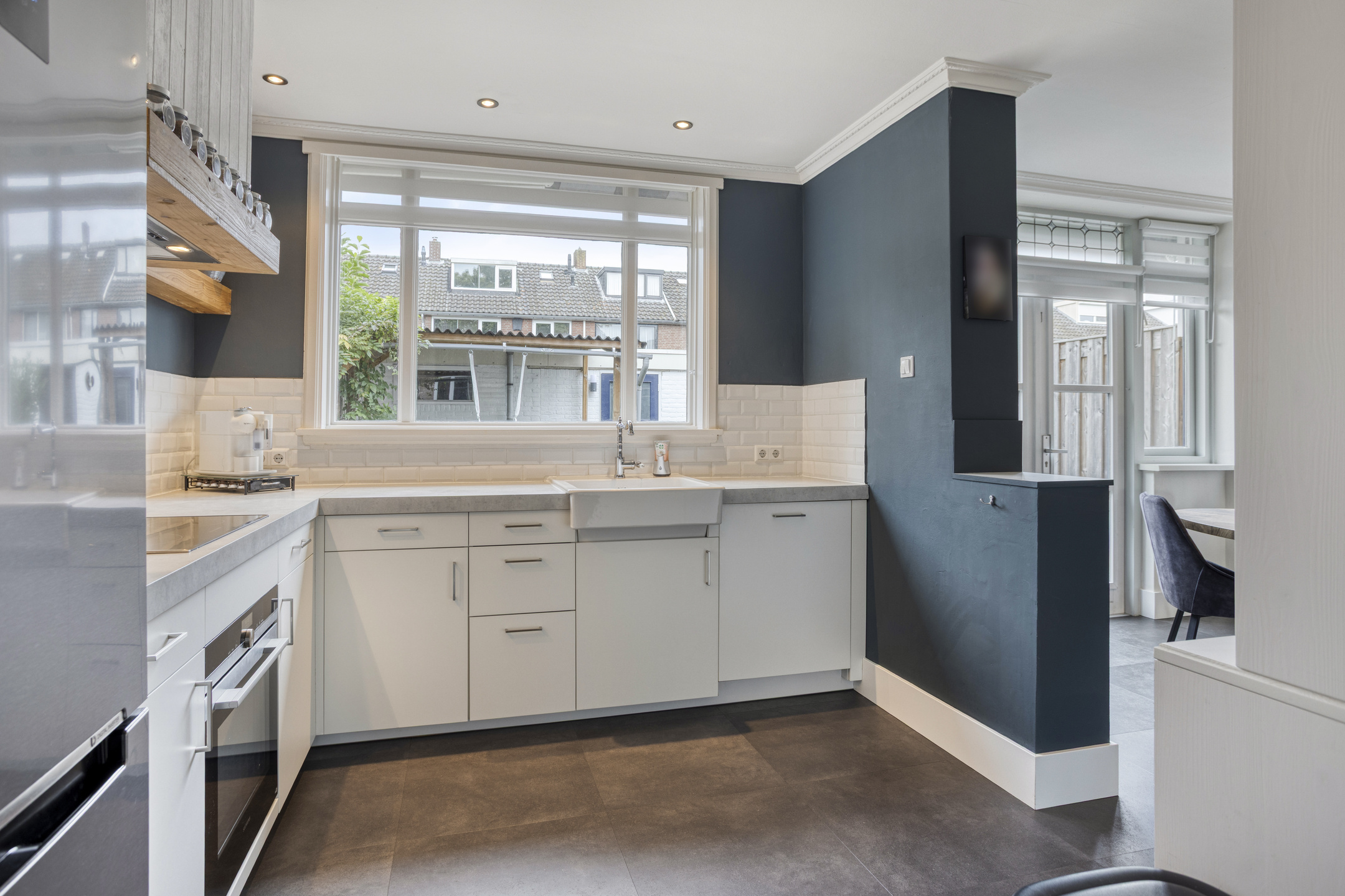 Nette keuken met inbouwapparatuur en openslaande deuren naar de tuin