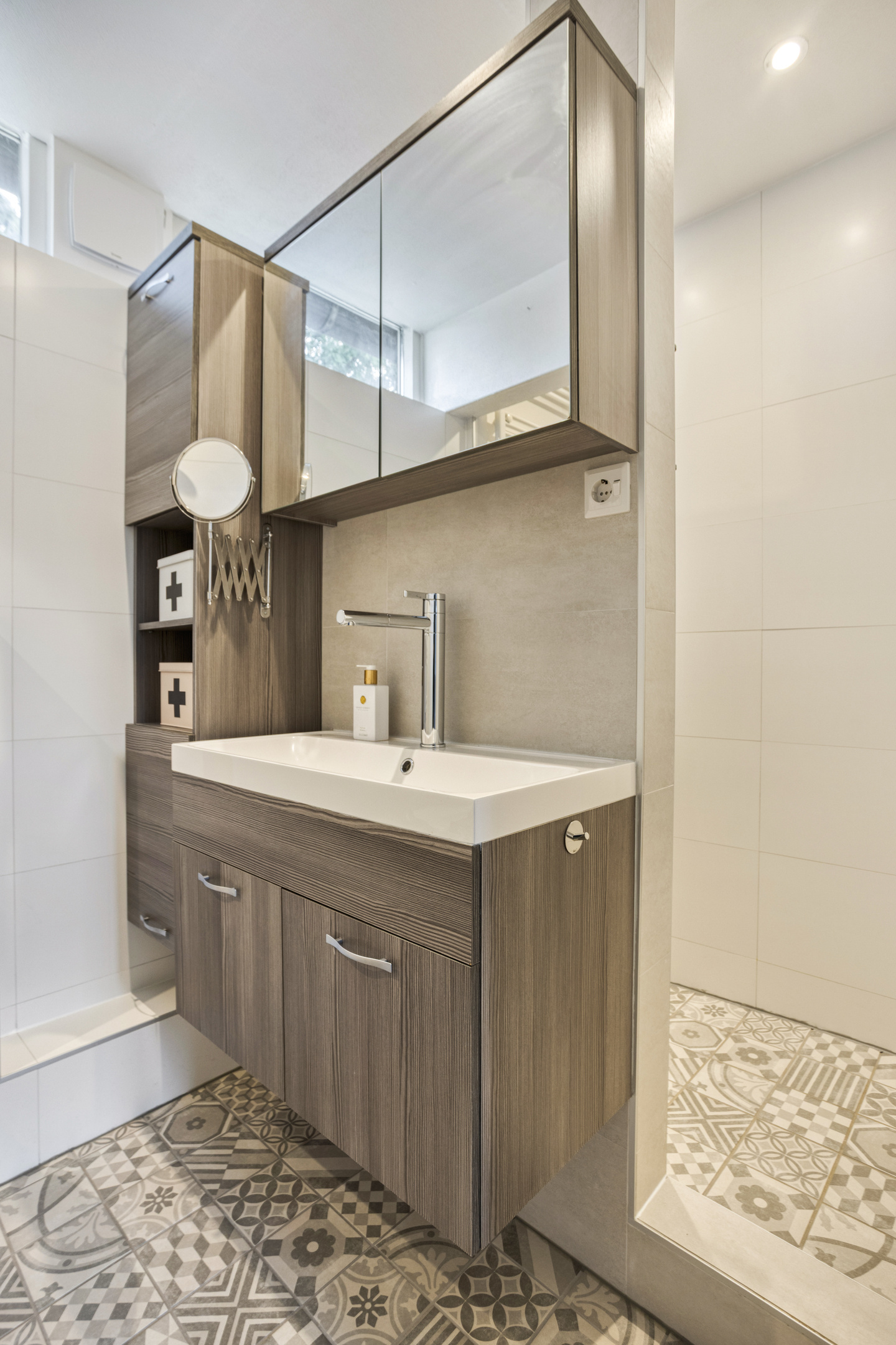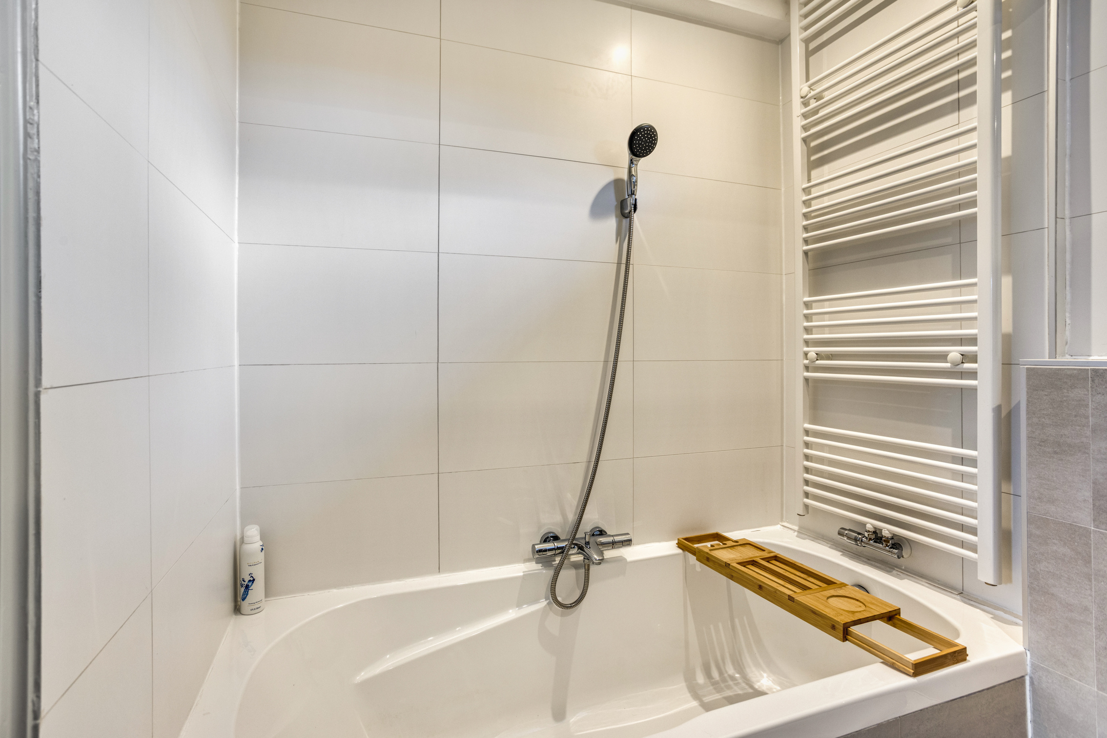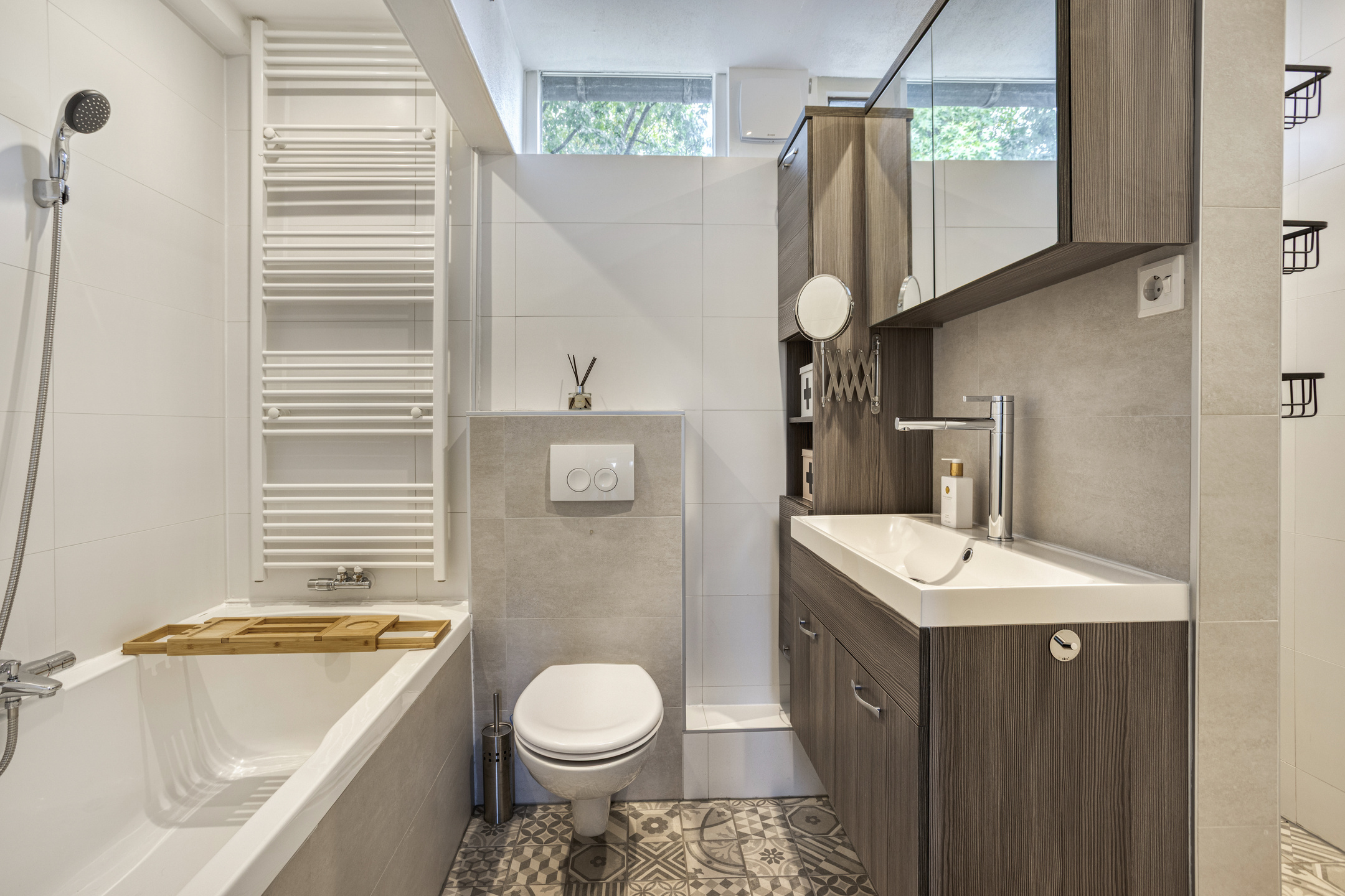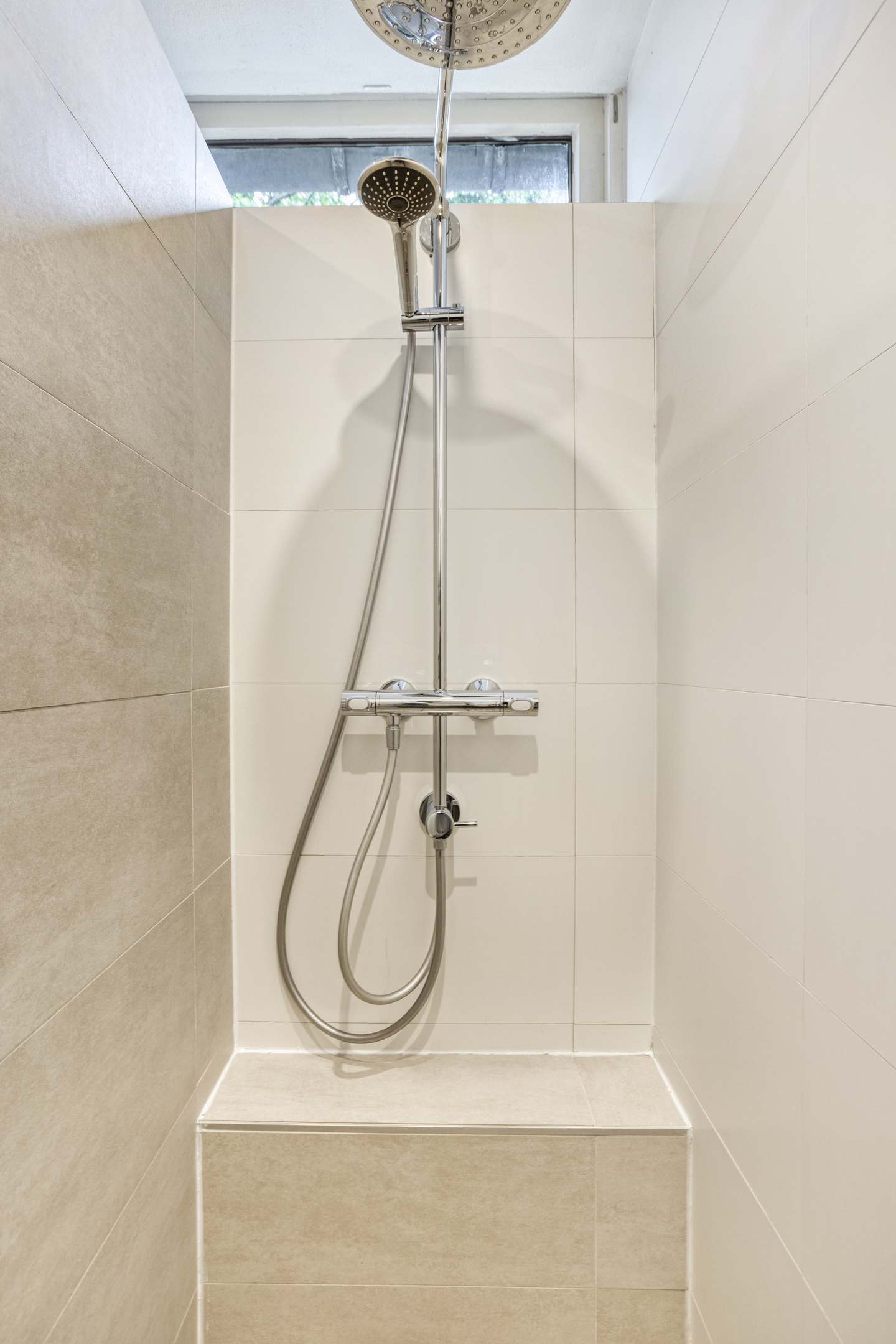 De badkamer is modern en compleet. Hier geniet je van het ligbad voor een ontspannen avond of de inloopdouche met regen- en handdouche voor een frisse start van de dag. Het wandcloset, het wastafelmeubel, de mechanische ventilatie en de vaste kast maken de ruimte praktisch en luxe tegelijk. Door een raam geniet de kamer van natuurlijke ventilatie.
