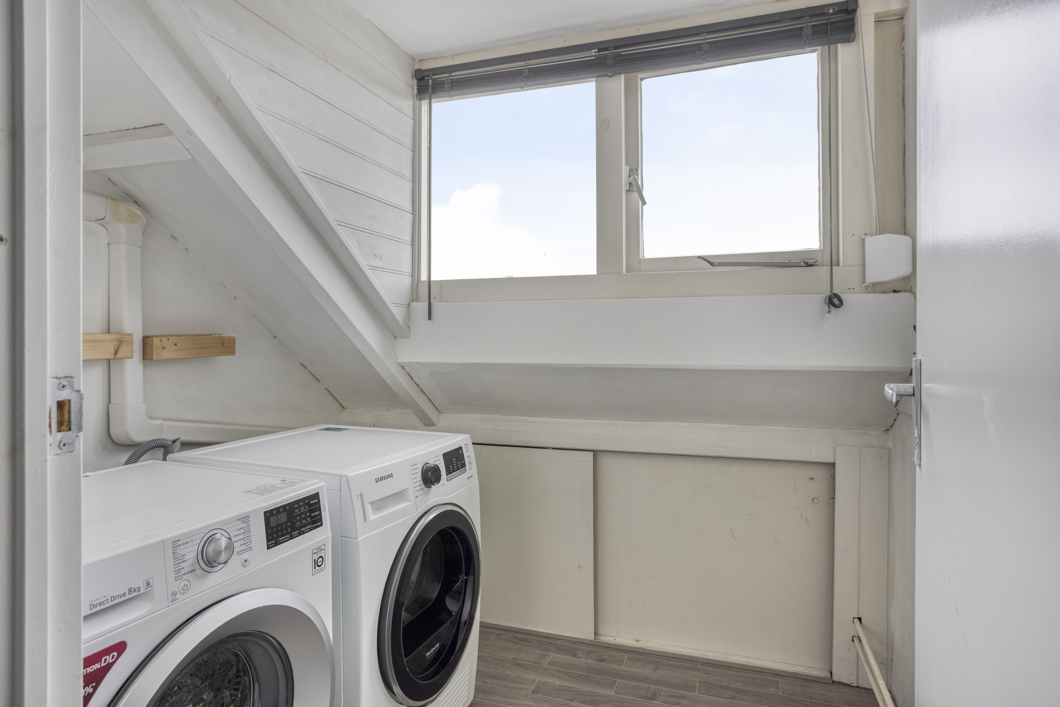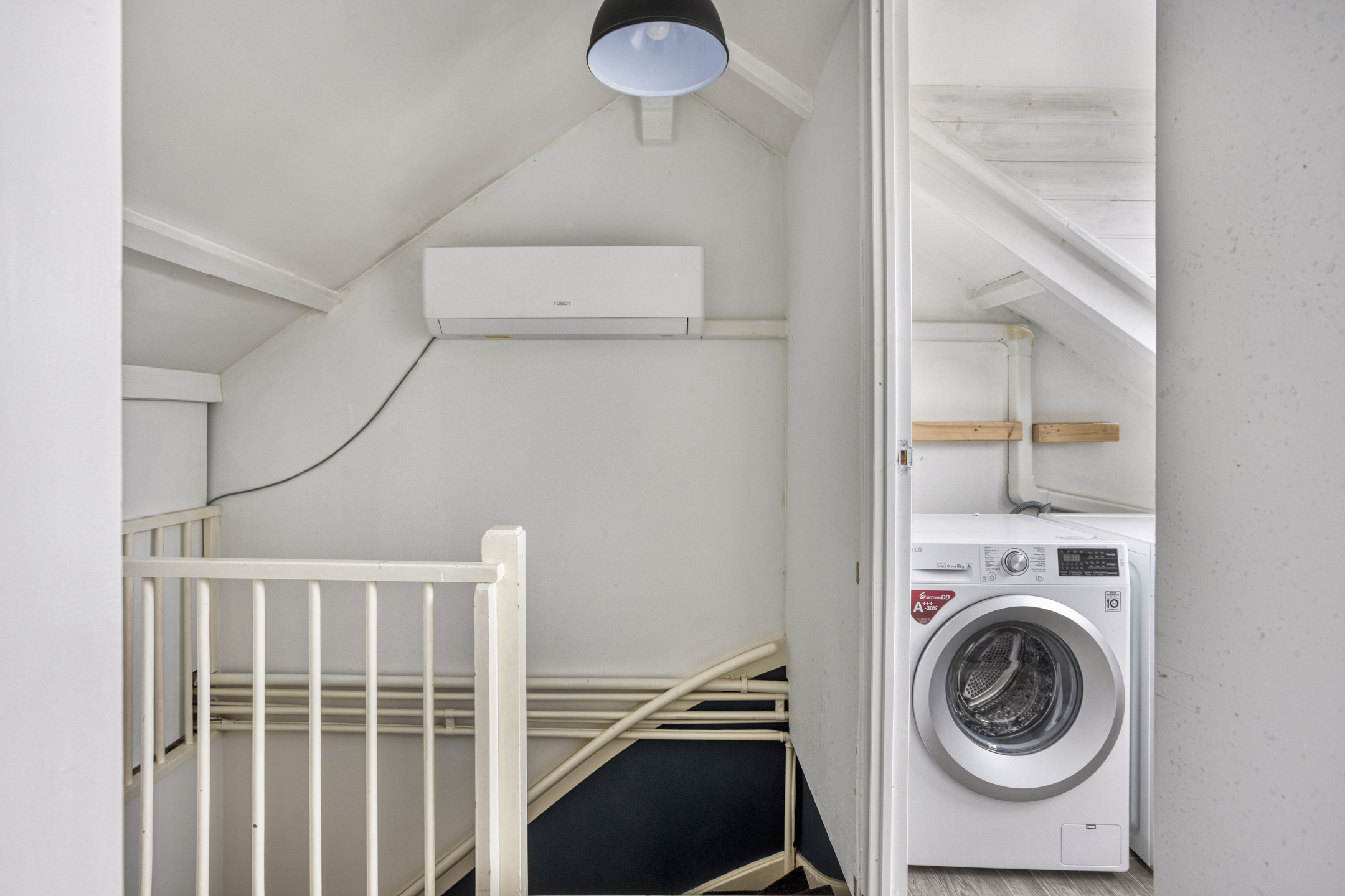 Met de vaste trap bereik je de tweede verdieping. Hier is een lichte ruimte met een dakkapel met rolluik, de aansluitingen voor witgoed en veel bergruimte achter de knieschotten. Een Tosot airco zorgt voor een behaaglijke temperatuur in de winter en zomer maanden.