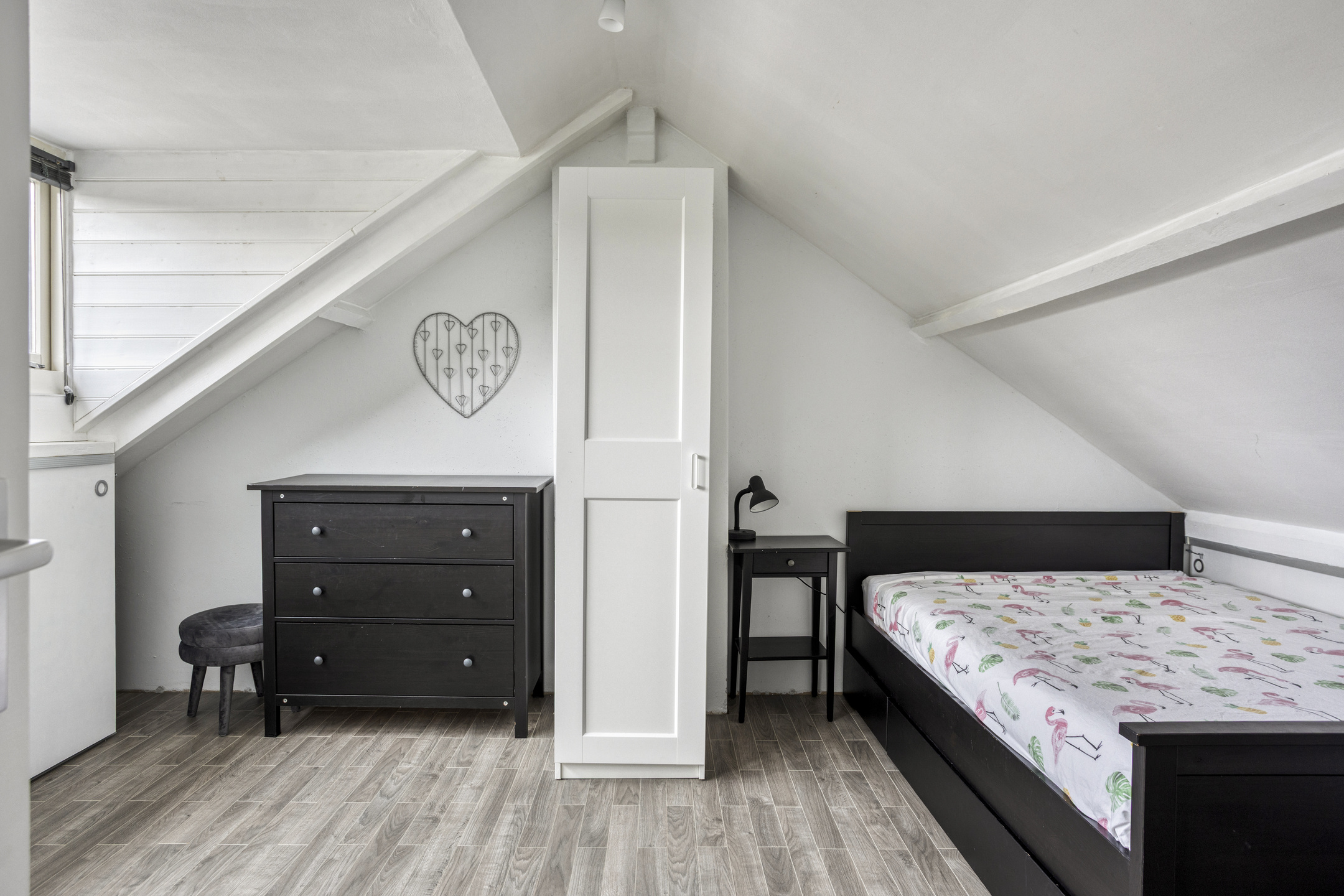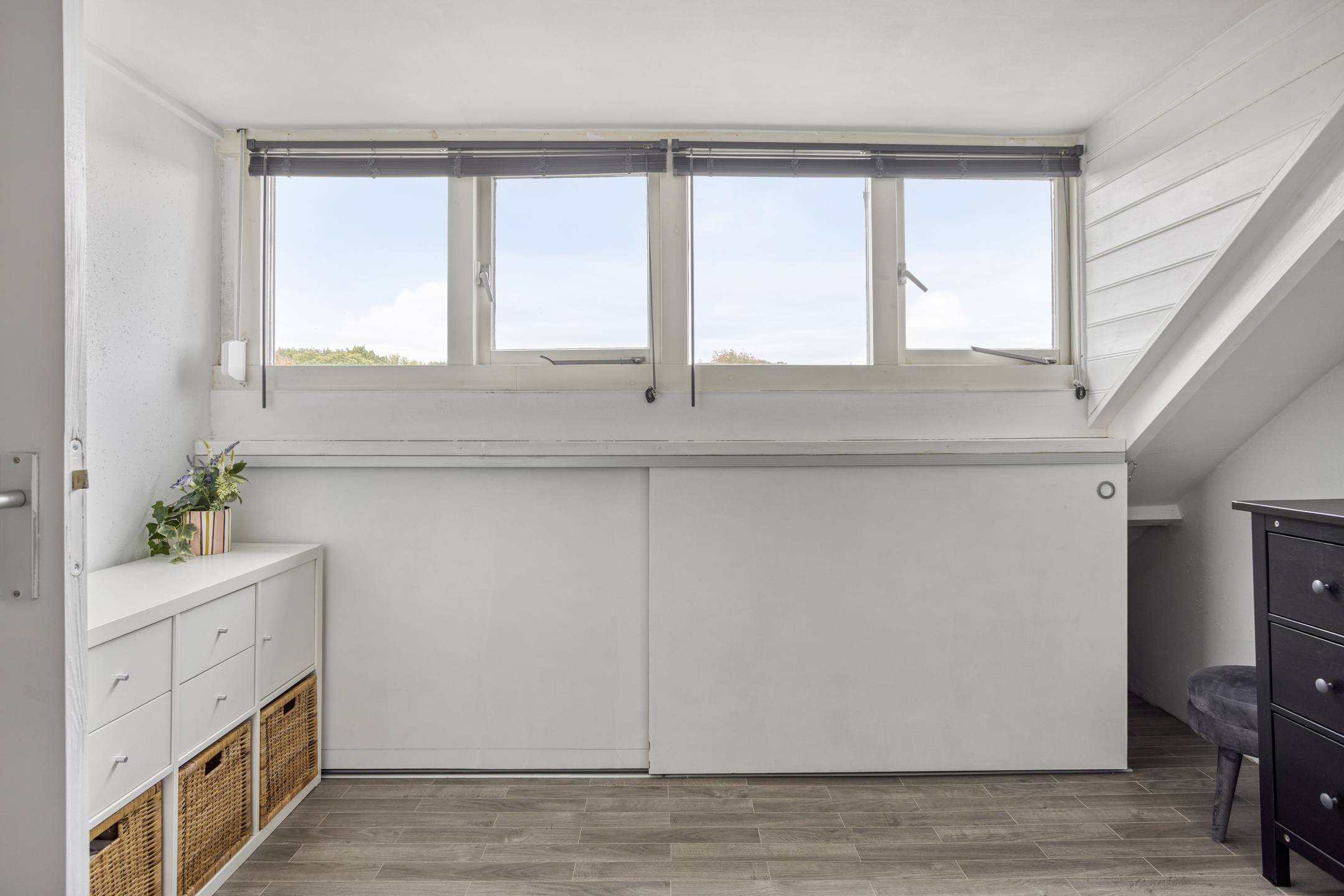 De zolderkamer is een echte verrassing. Dankzij de grote dakkapel welke voorzien is van een rolluik voelt het ruim en licht. Er is voldoende plaats voor een tweepersoonsbed en een kledingkast. Daarmee is dit een volwaardige vierde slaapkamer, perfect voor oudere kinderen of als logeerkamer.