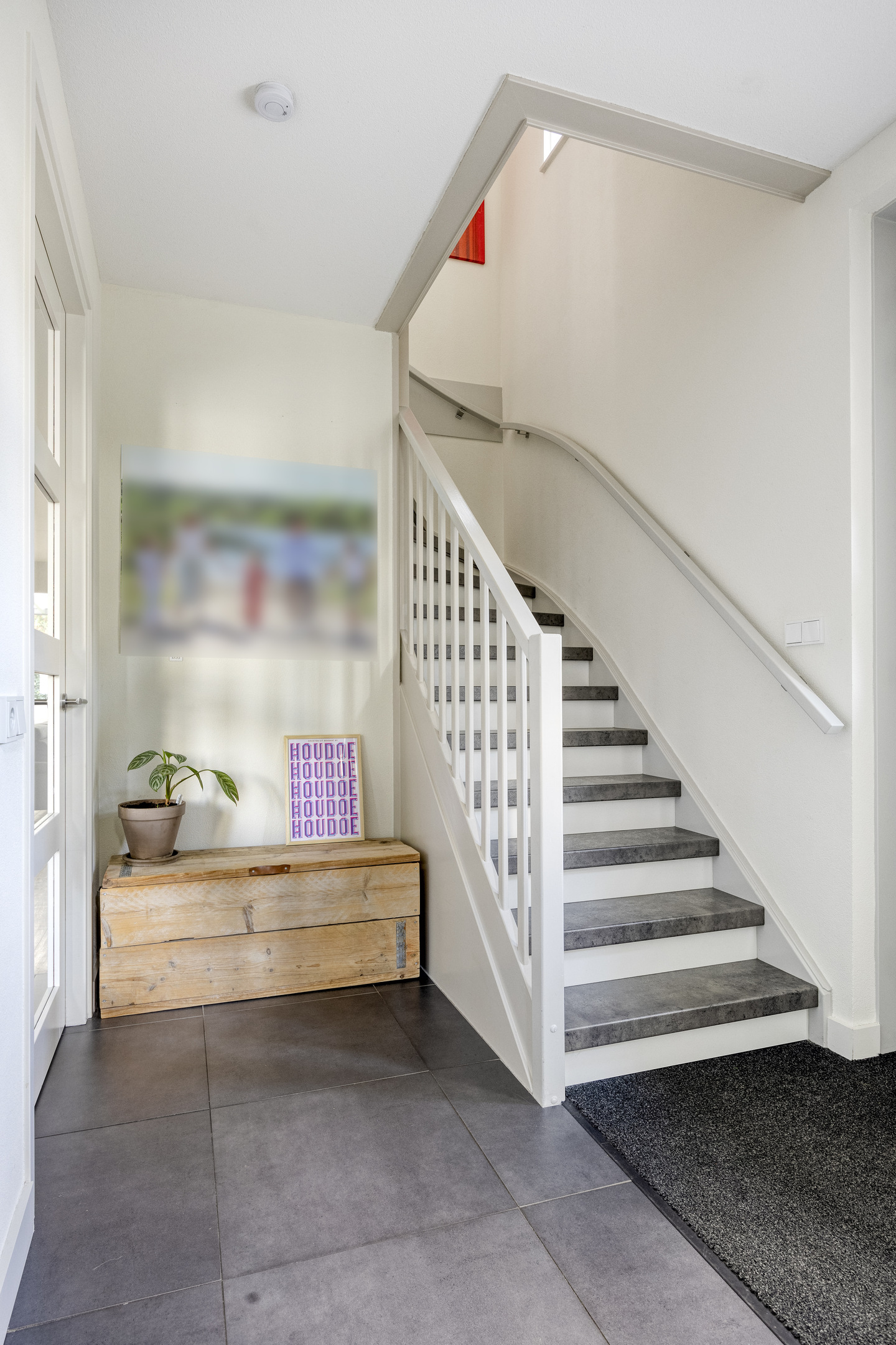Wanneer je de woning binnenstapt, kom je in een royale hal met een mooie stenen vloer voorzien van vloerverwarming. Er is genoeg ruimte voor een garderobe en je vindt hier ook het toilet, de trapopgang naar de eerste verdieping en de meterkast. Vanuit de hal loop je door naar de woonkamer.