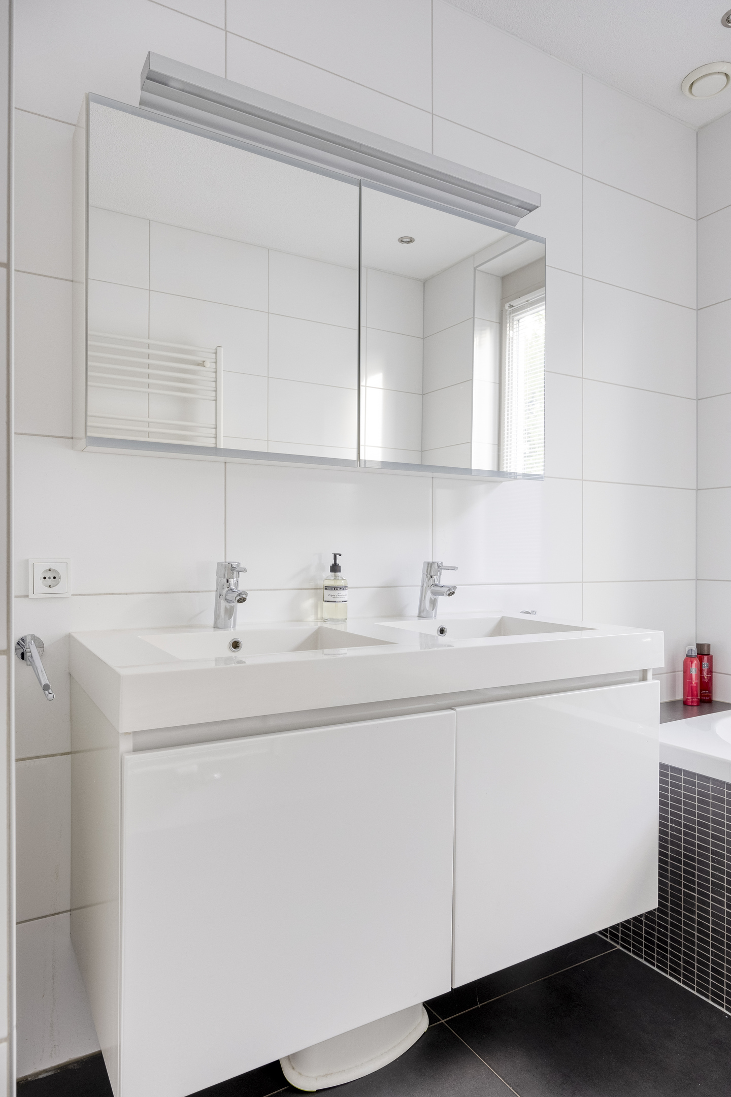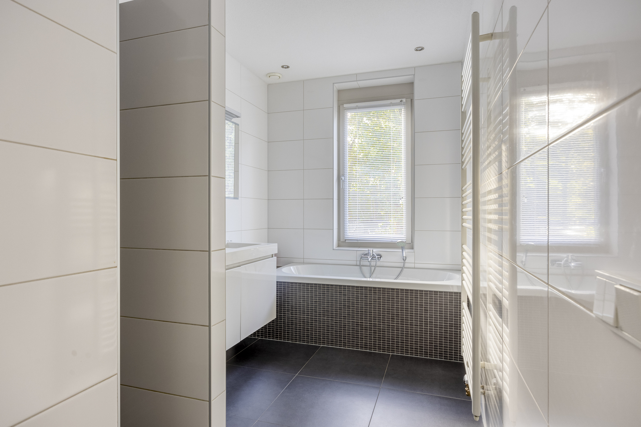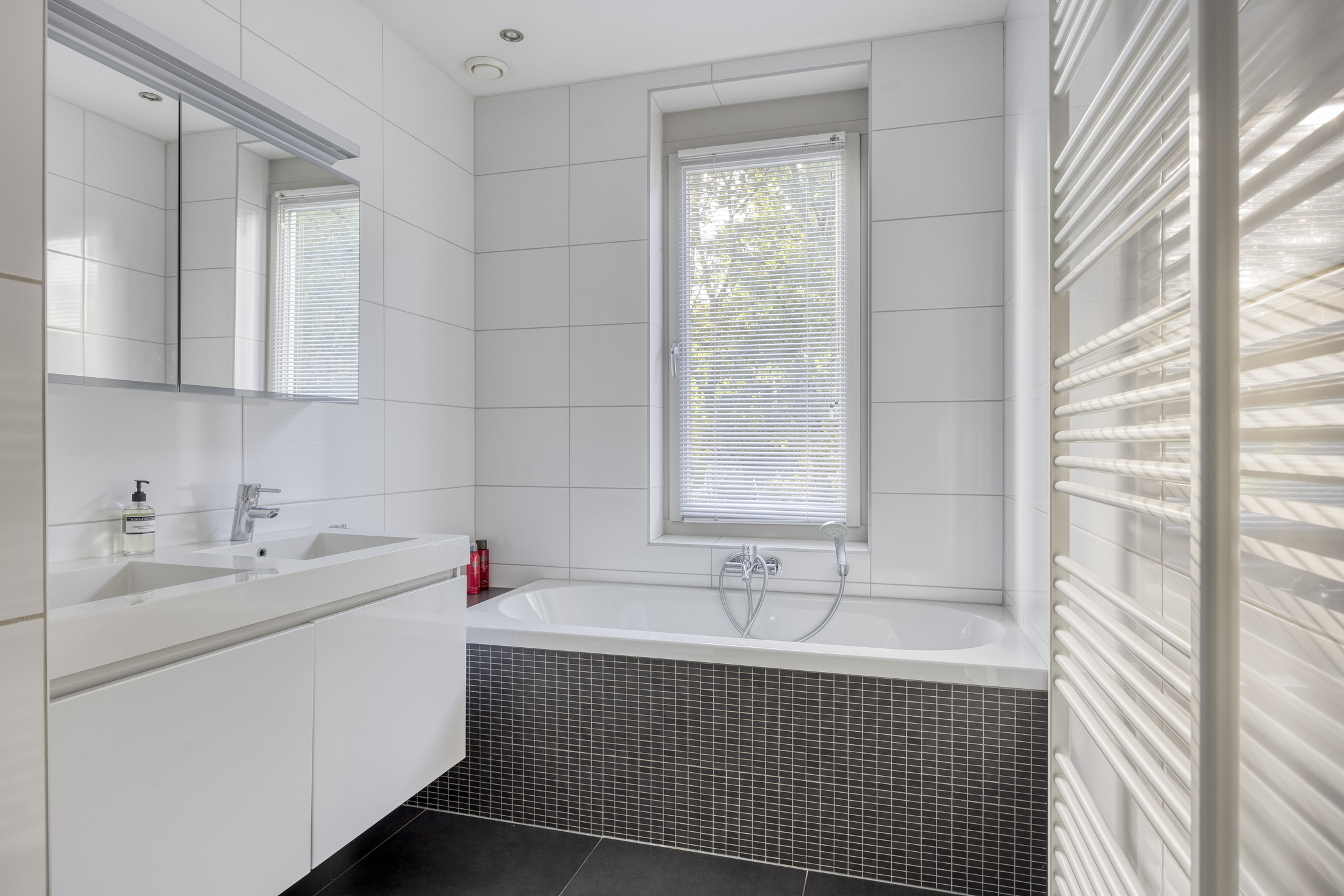 Het aparte toilet is netjes afgewerkt in dezelfde stijl als beneden, met een hangend closet en fonteintje. De badkamer is luxe uitgevoerd met een groot ligbad, een dubbele wastafel met meubel, een ruime inloopdouche, vloerverwarming, inbouwspots en een spiegelkast met verlichting. Ook hier zorgt een draaikiepraam voor frisse lucht en daglicht.