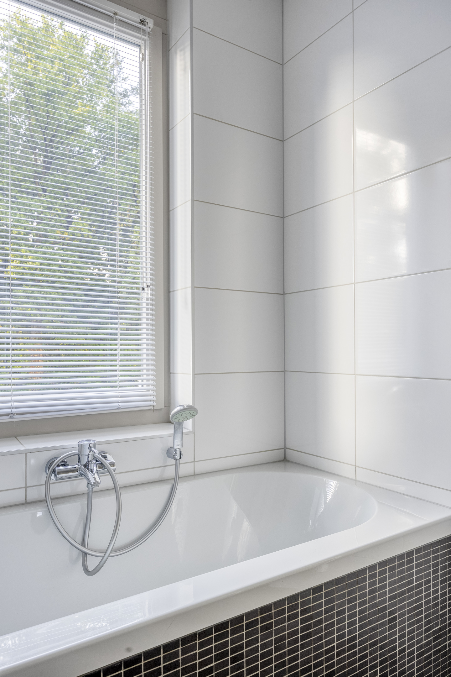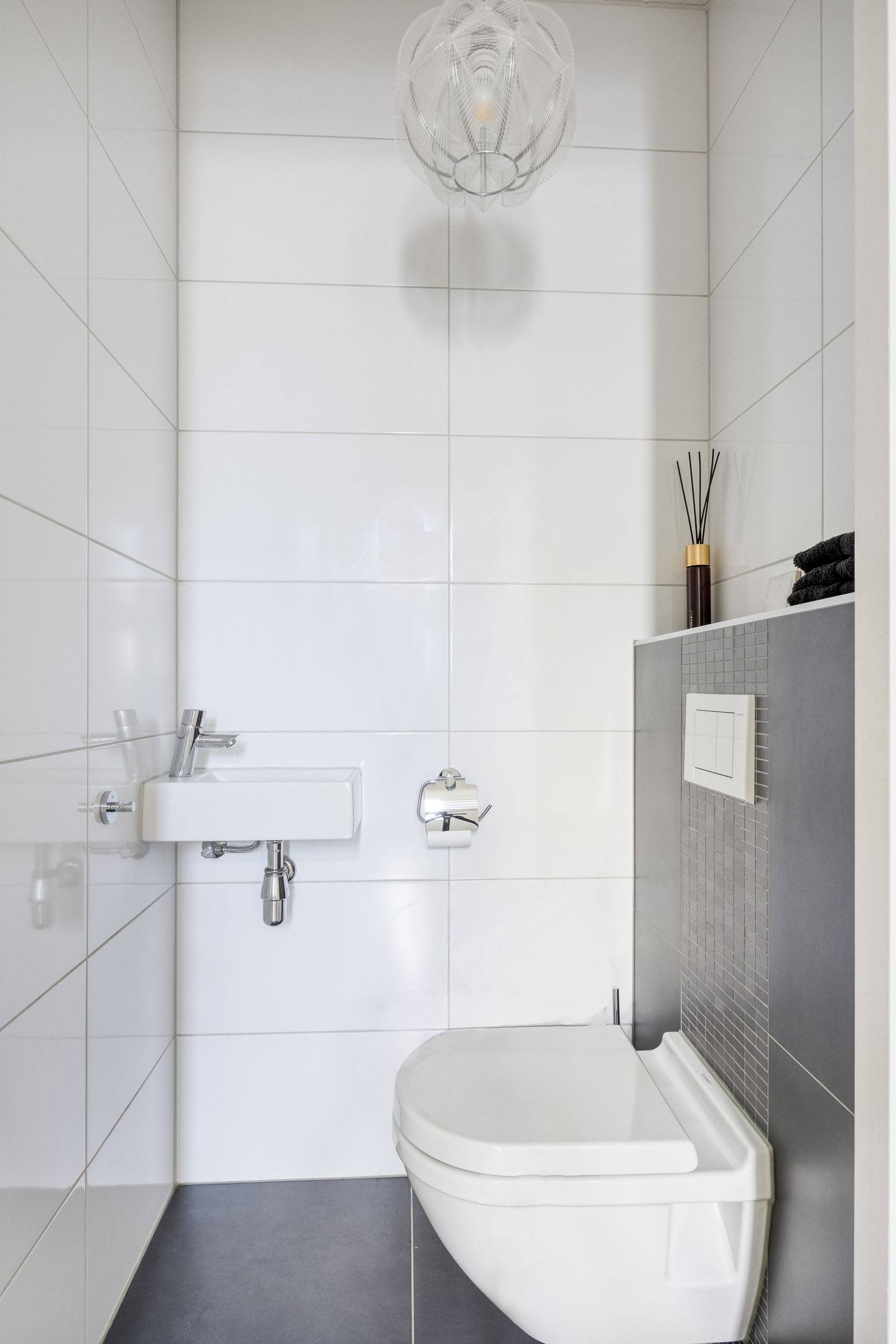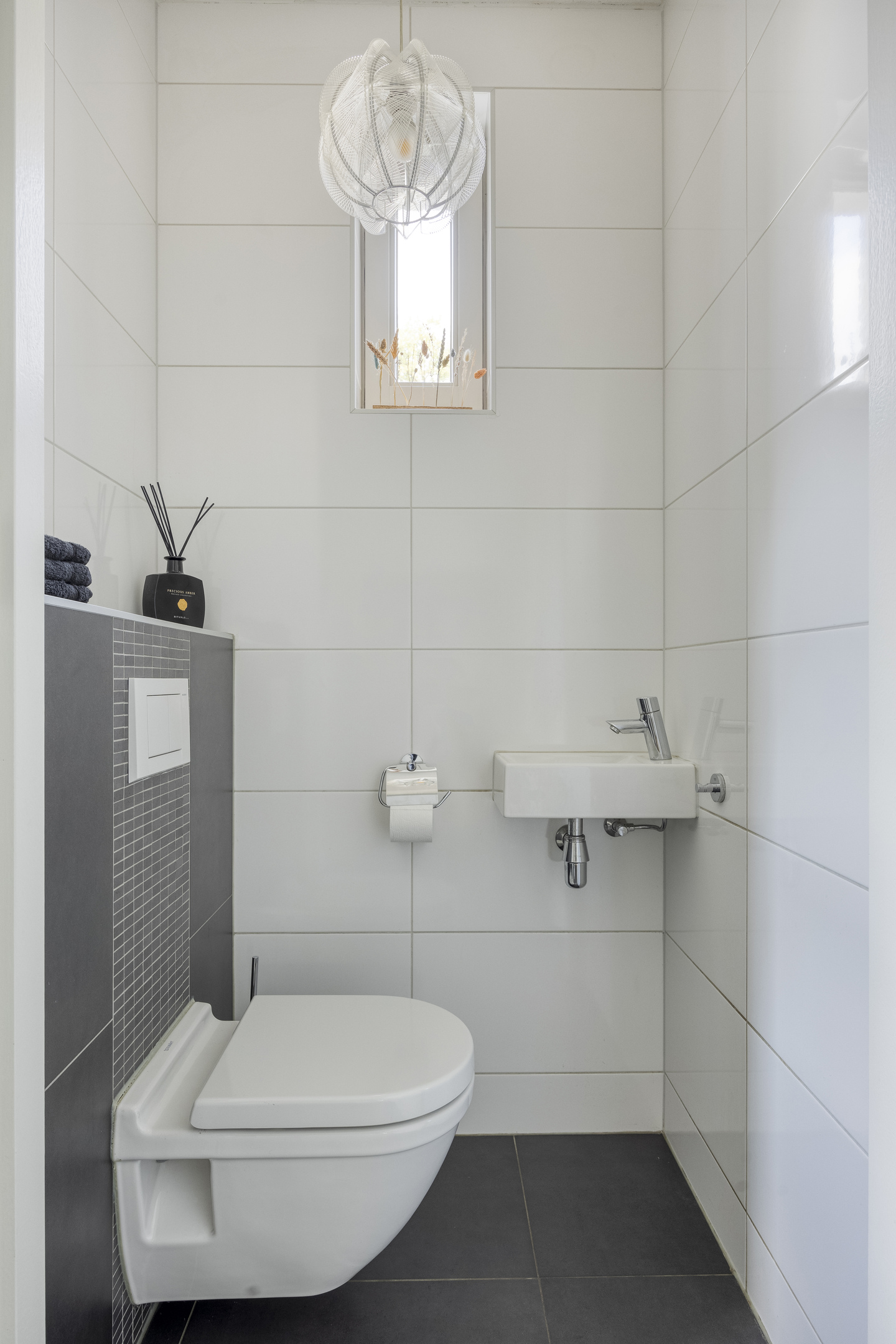 Het aparte toilet is netjes afgewerkt in dezelfde stijl als beneden, met een hangend closet en fonteintje. De badkamer is luxe uitgevoerd met een groot ligbad, een dubbele wastafel met meubel, een ruime inloopdouche, vloerverwarming, inbouwspots en een spiegelkast met verlichting. Ook hier zorgt een draaikiepraam voor frisse lucht en daglicht.