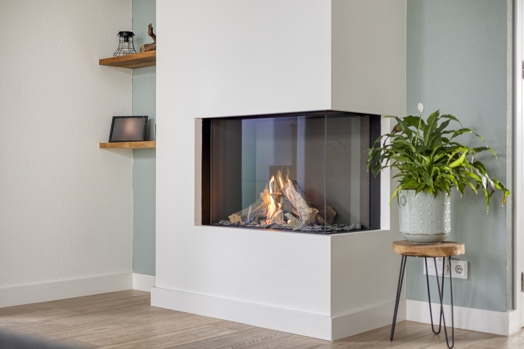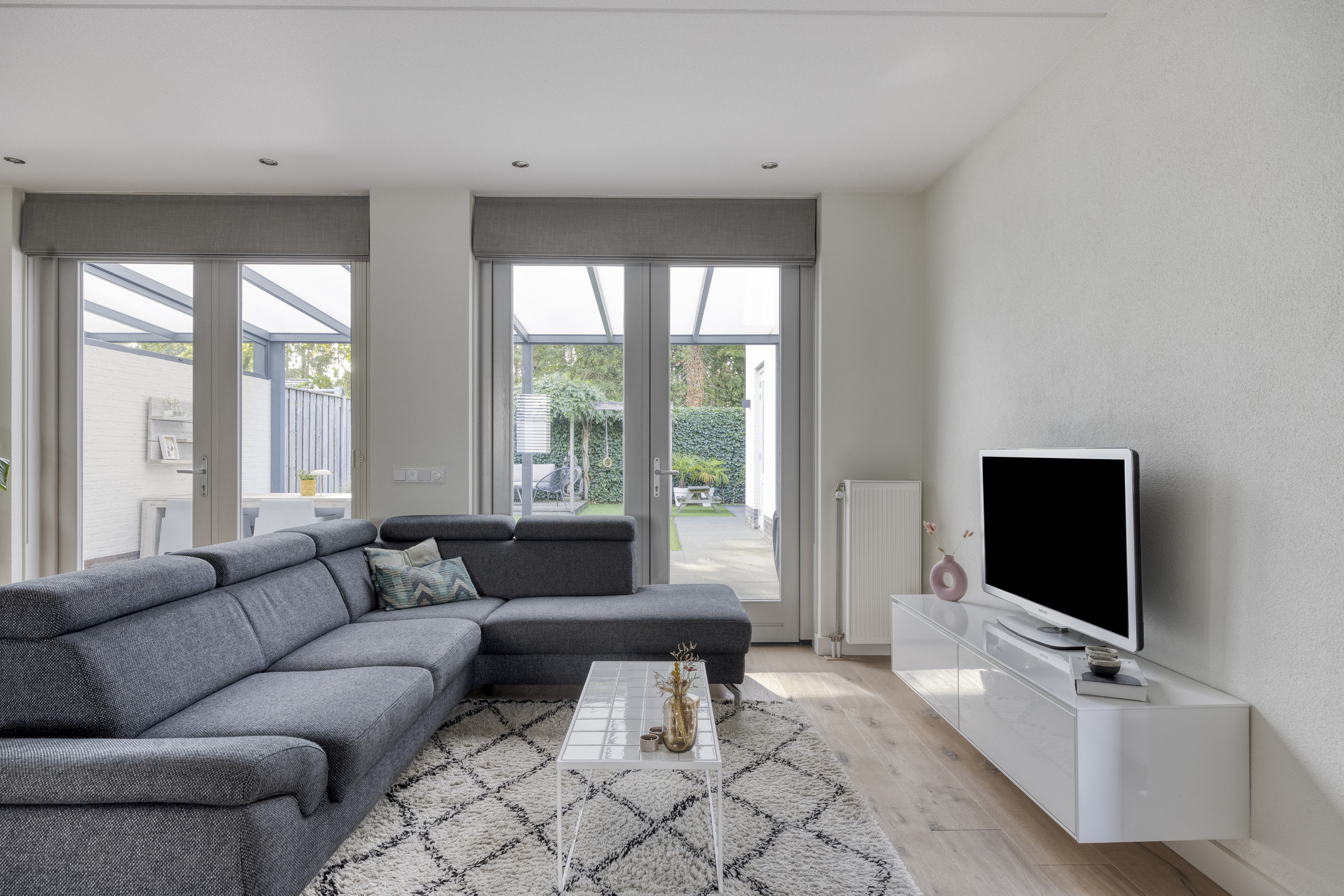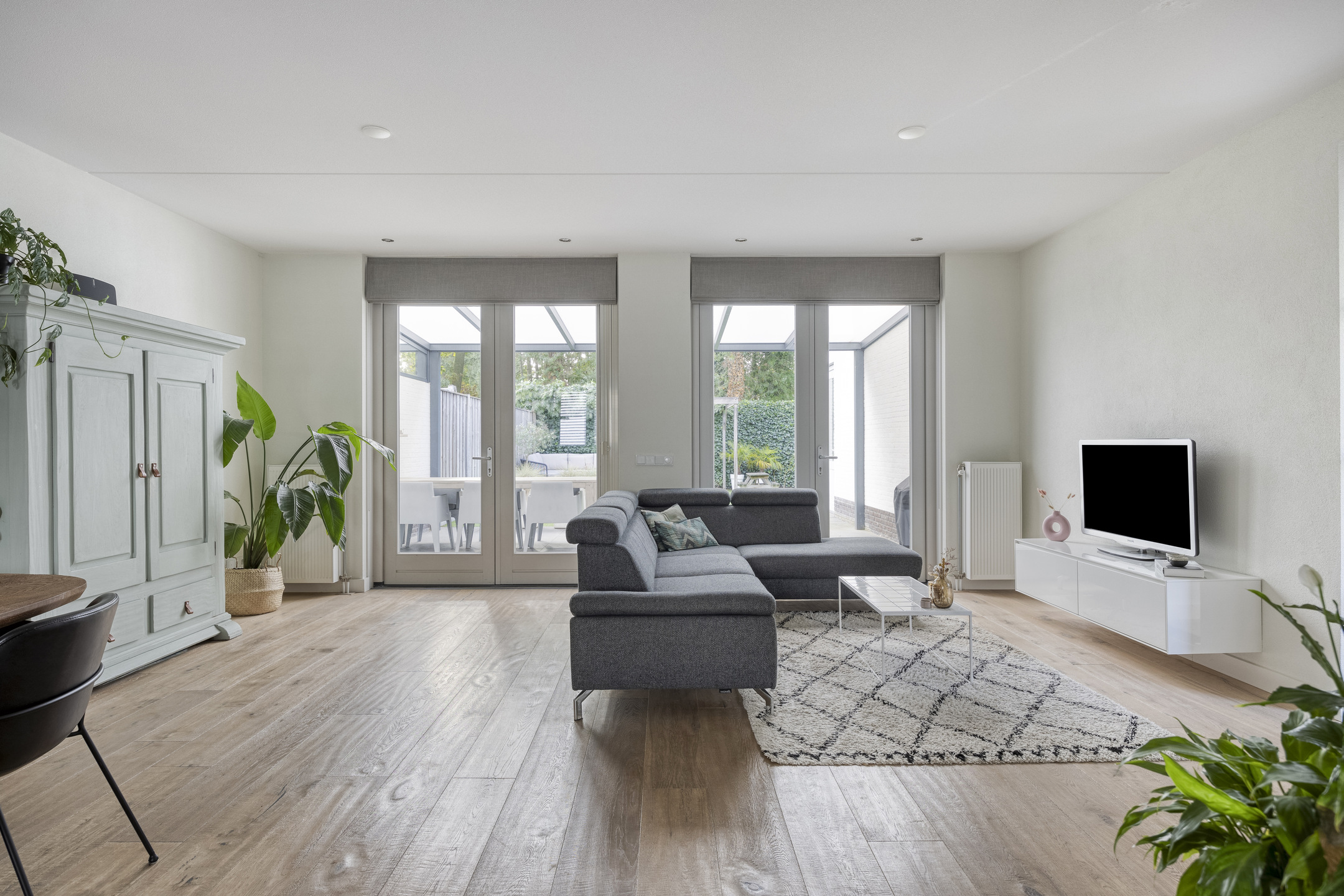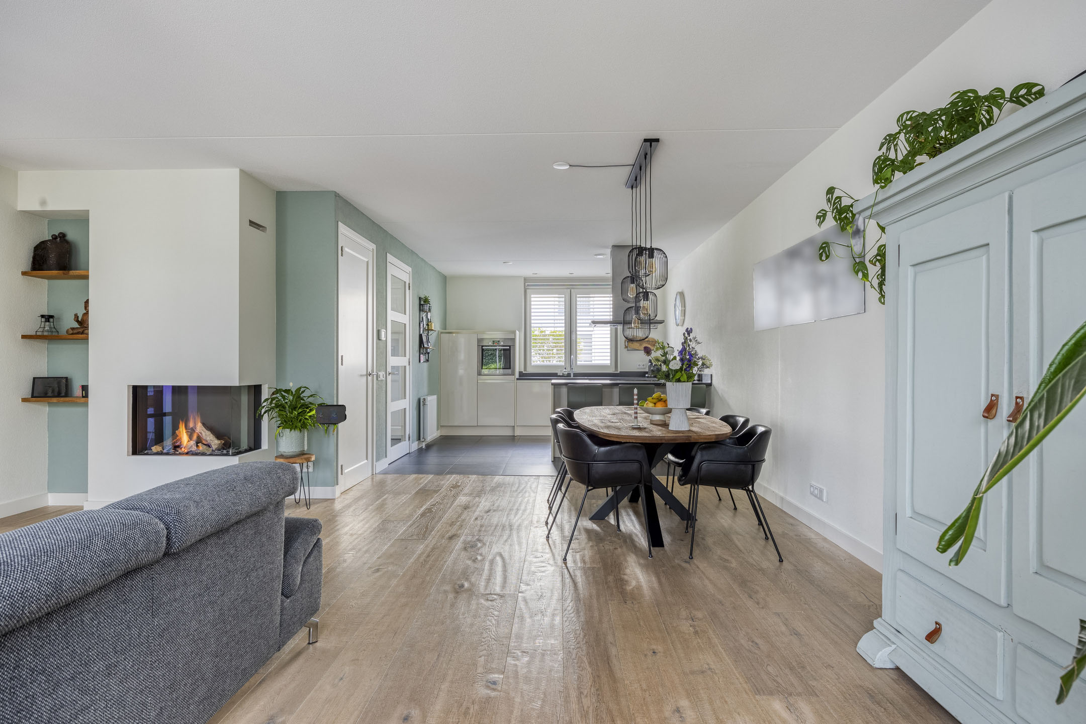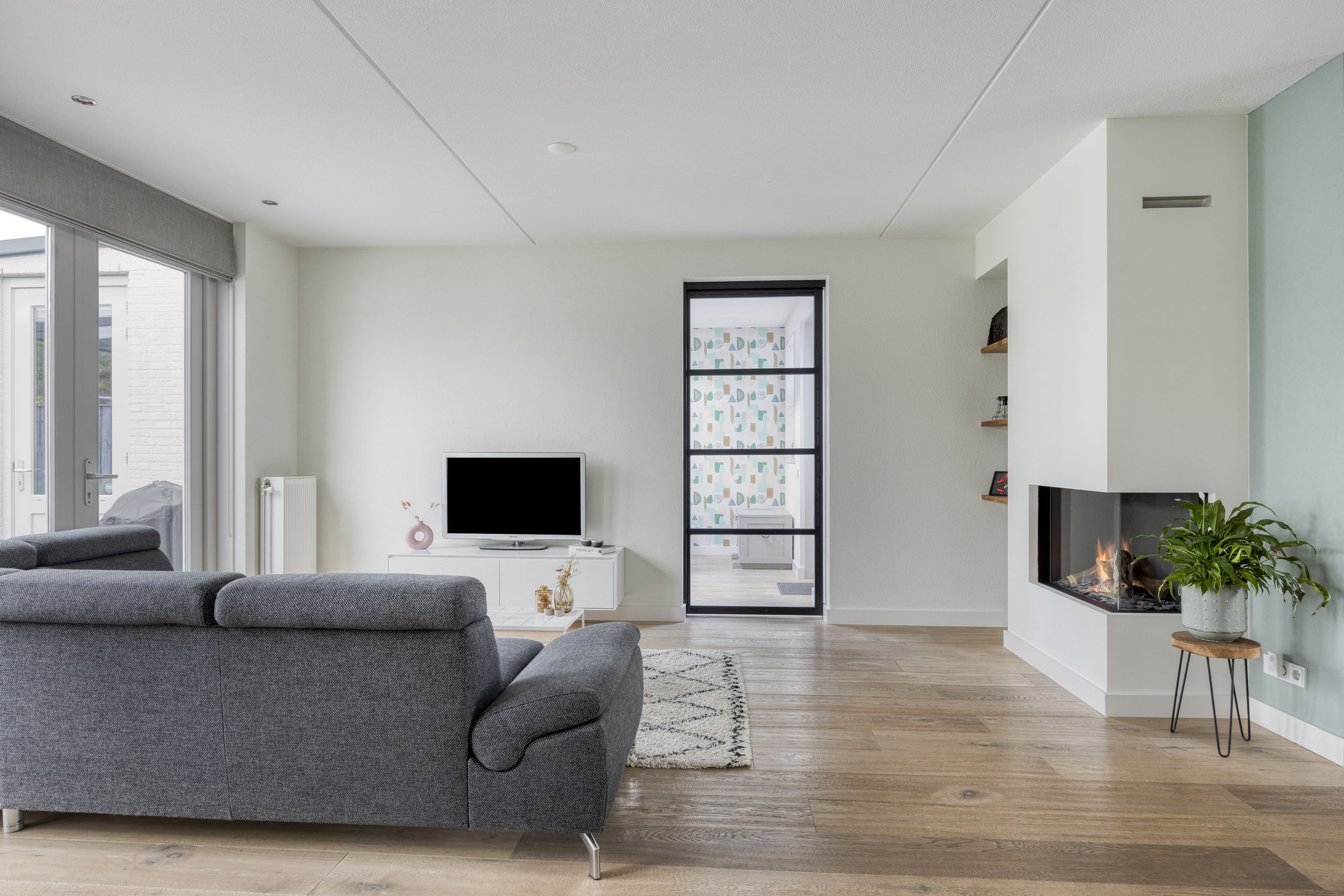 • Ruime en lichte woonkamer met houten vloer, gashaard en openslaande deuren